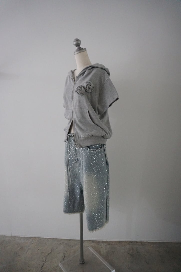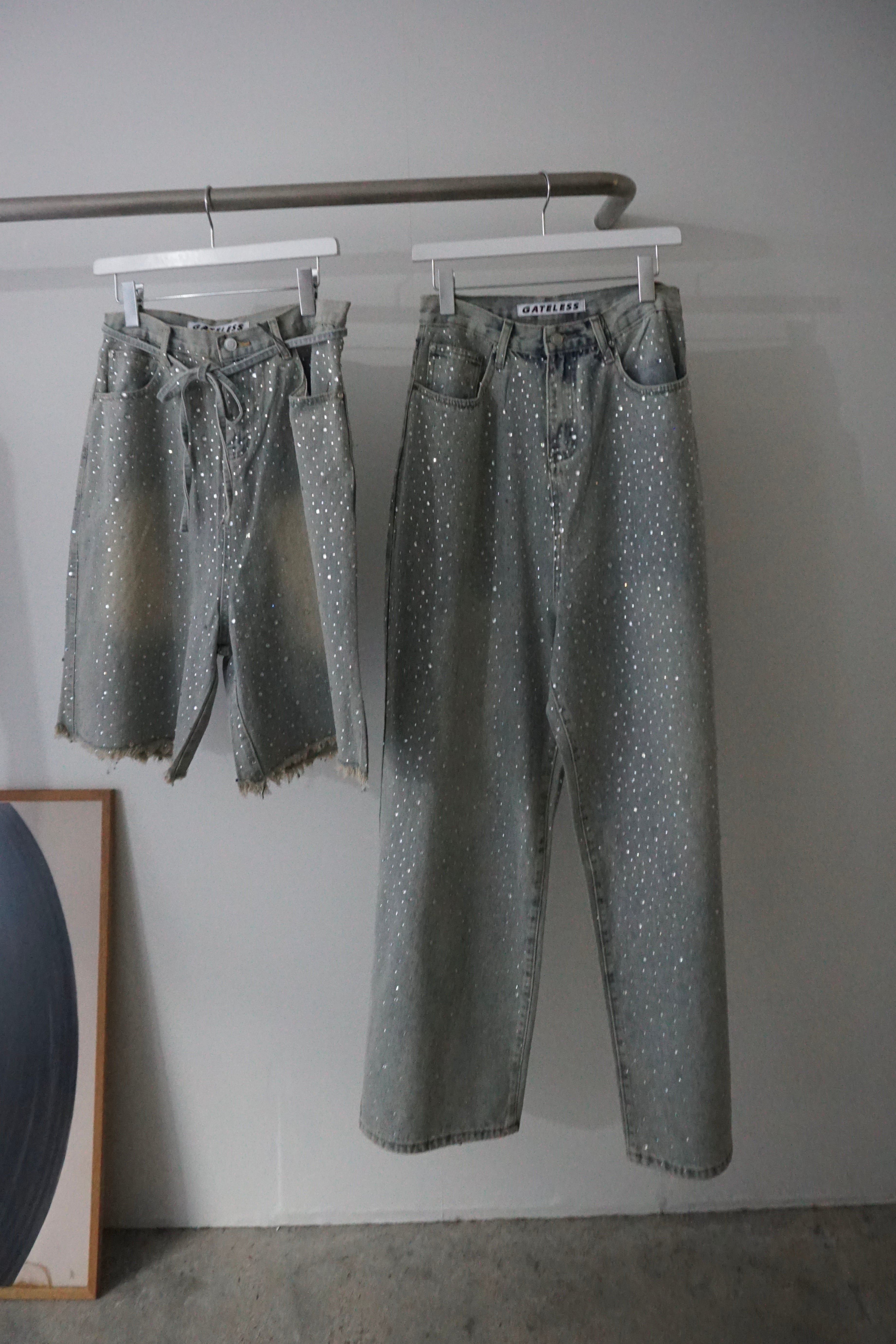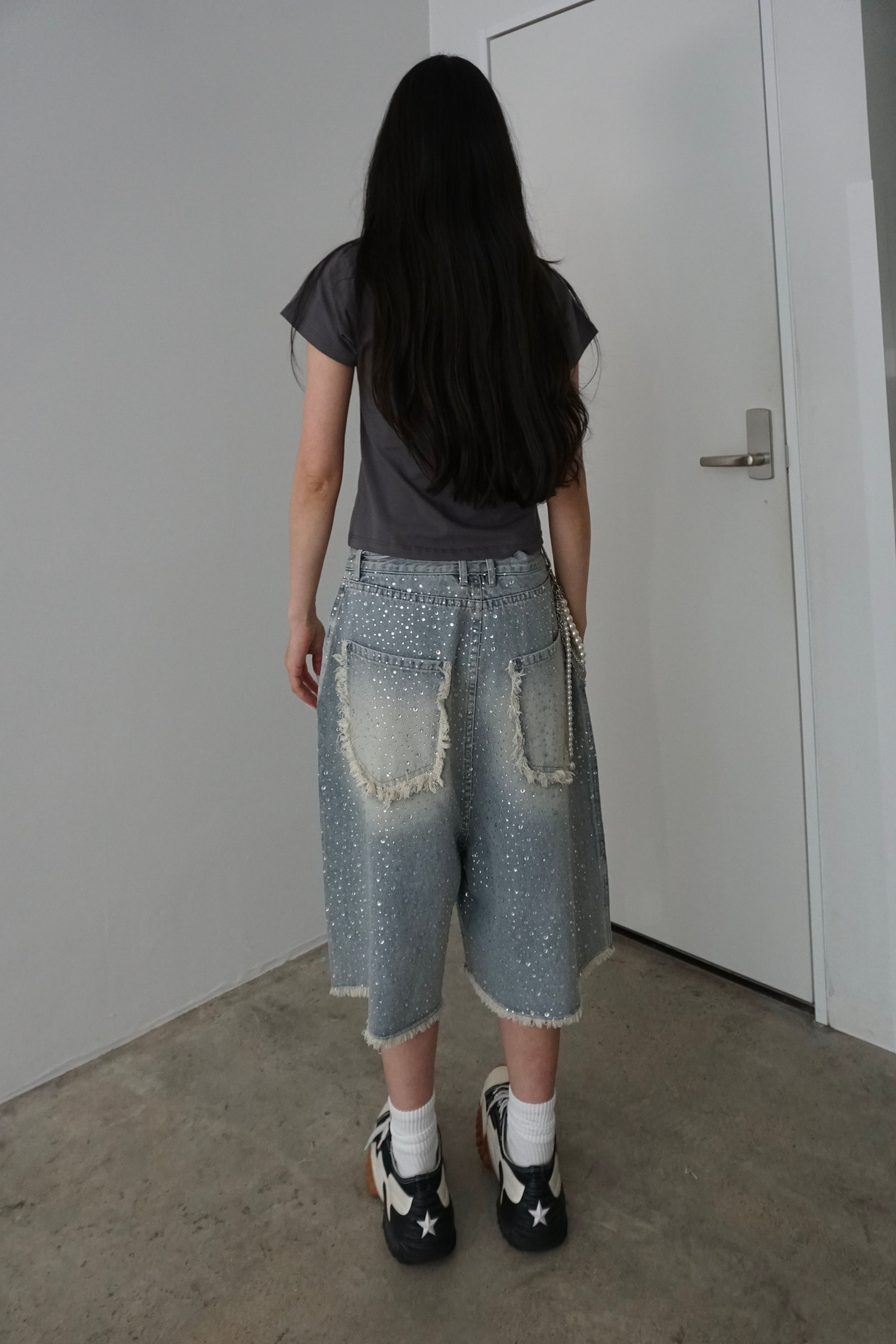 全体に敷き詰められたラインストーンが目を引く、存在感たっぷりのデニムハーフパンツ。