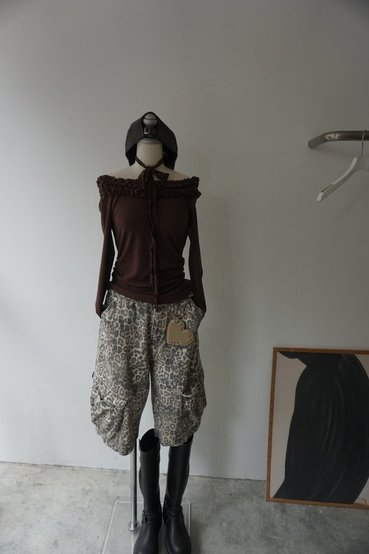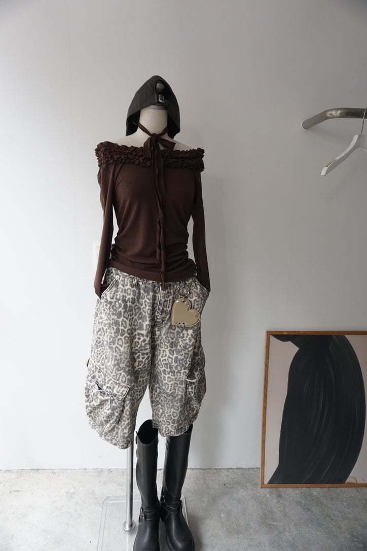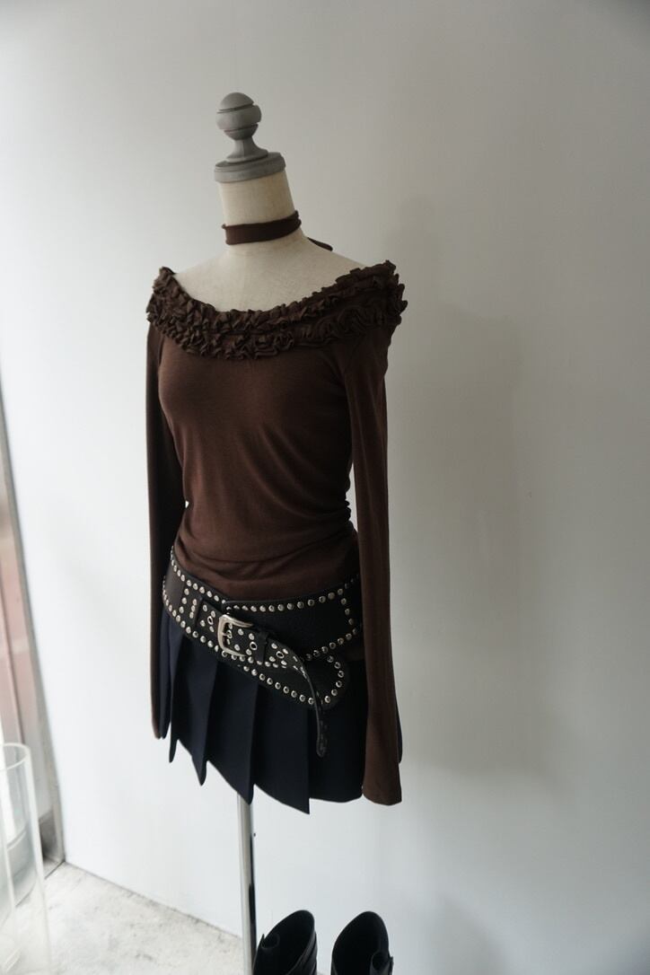 襟元には立体的なフリルがあしらわれ、オフショルダーとしてもクルーネックとしても着用可能。スタイリングに合わせて表情を変えられる2WAYデザインです。