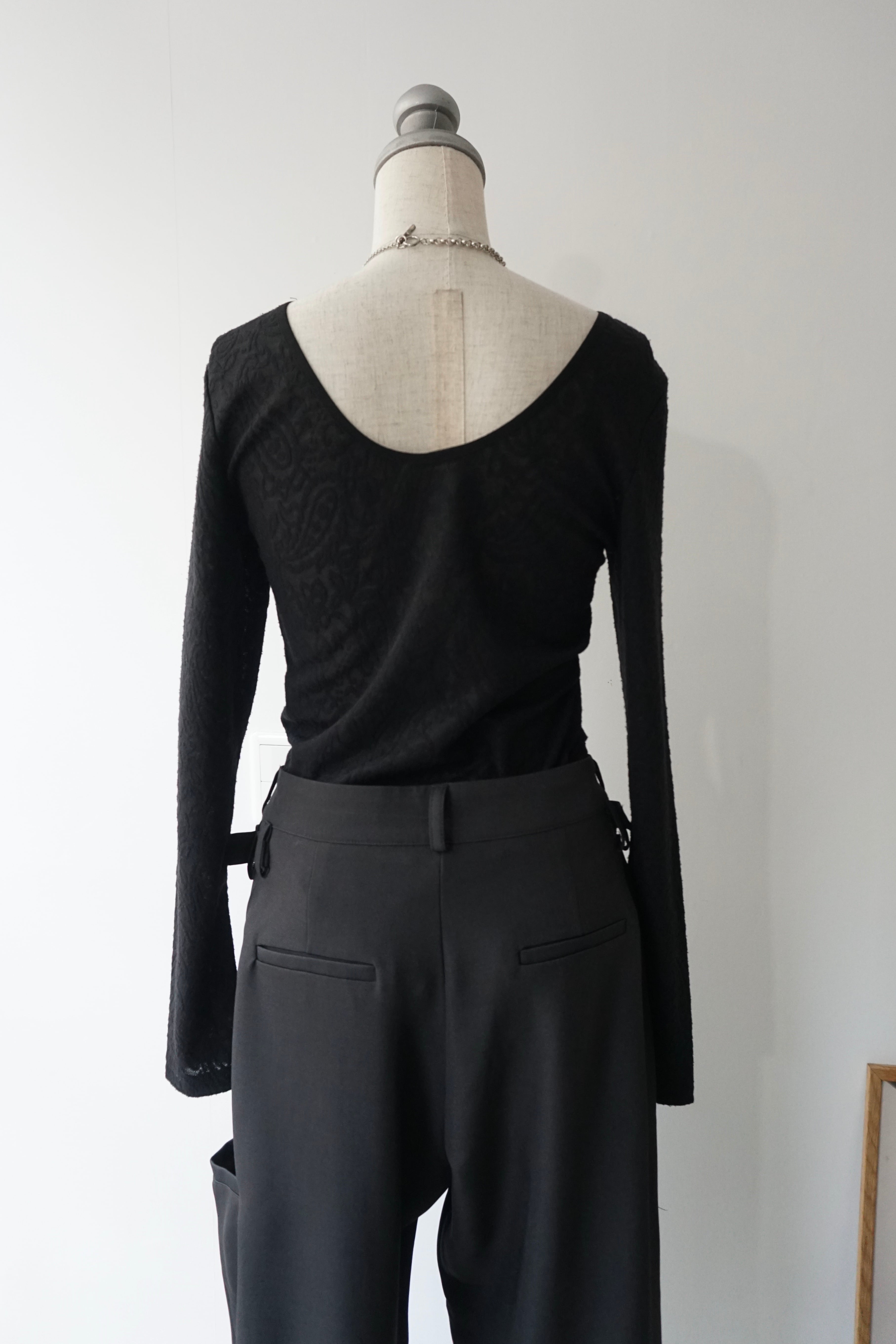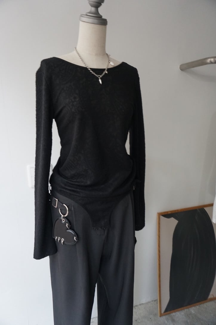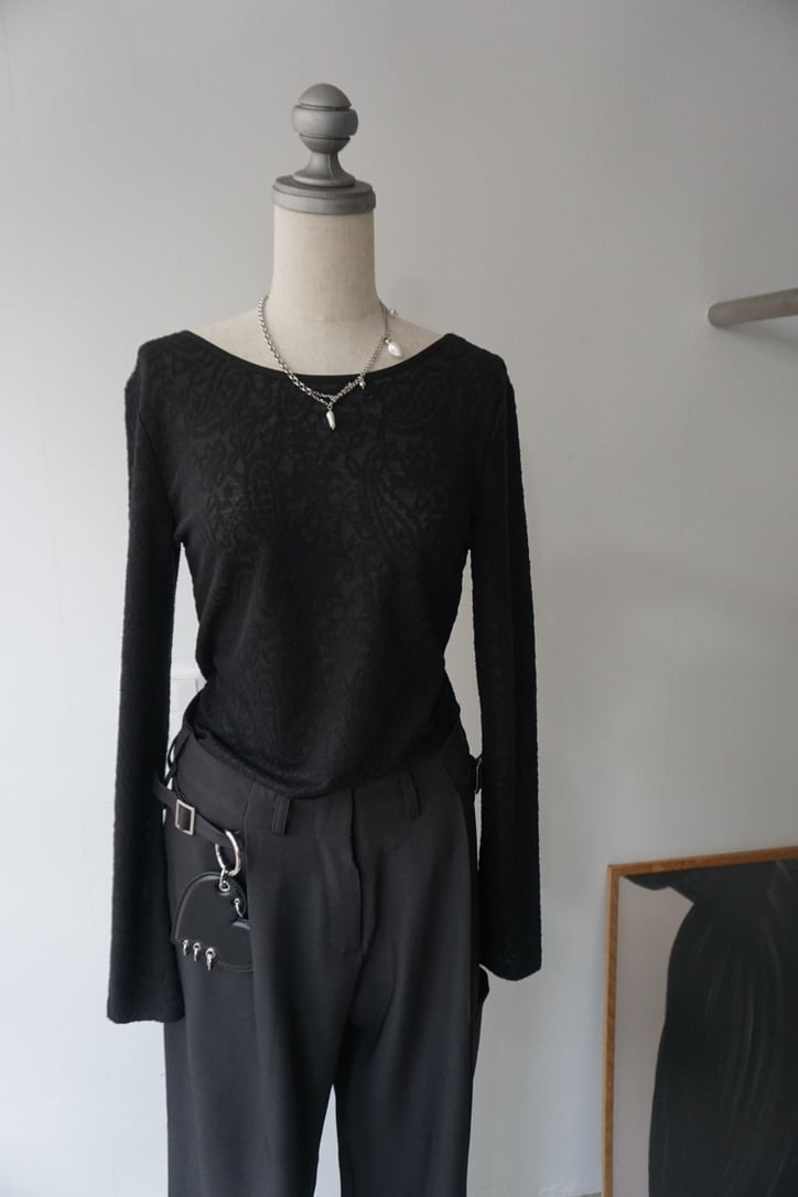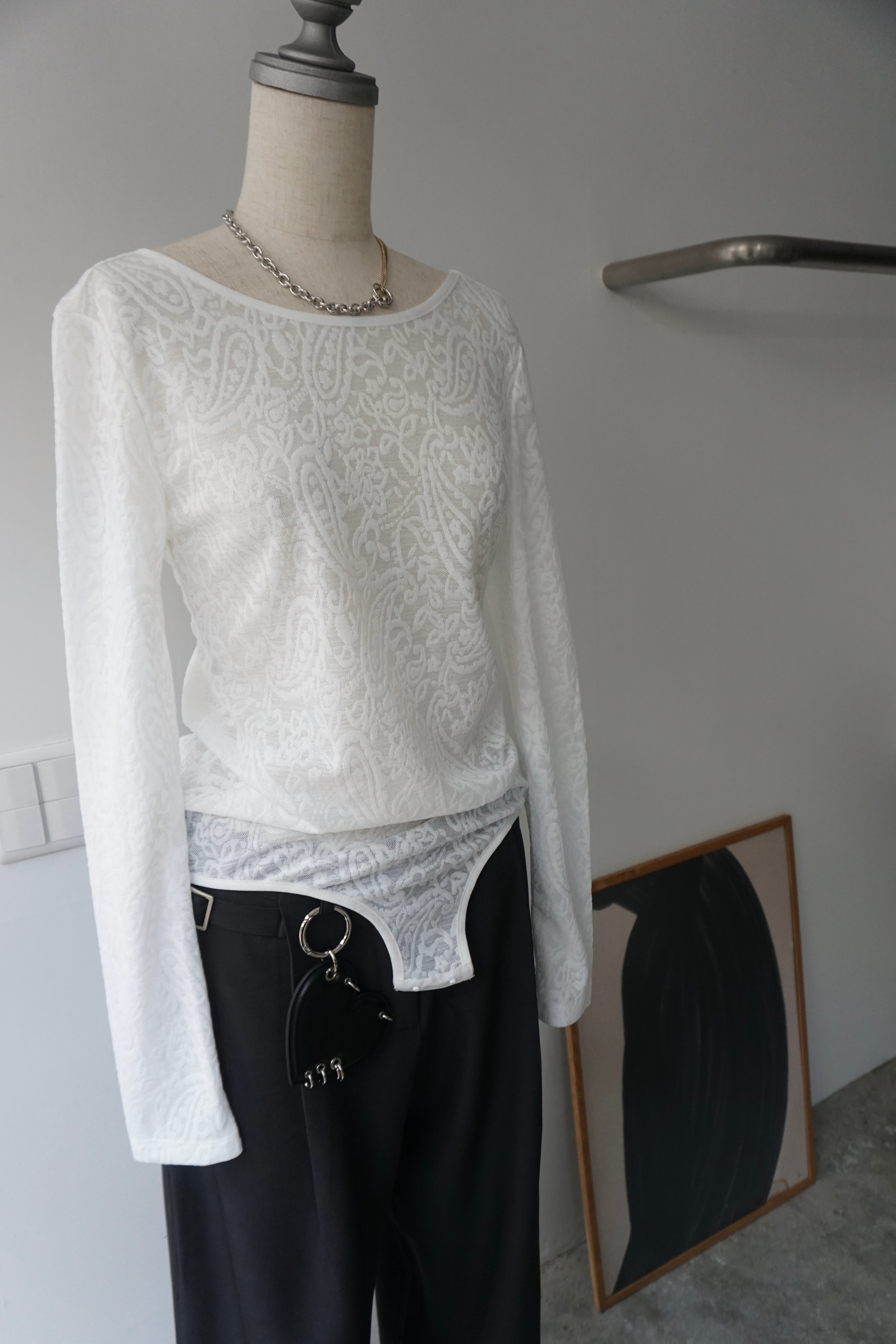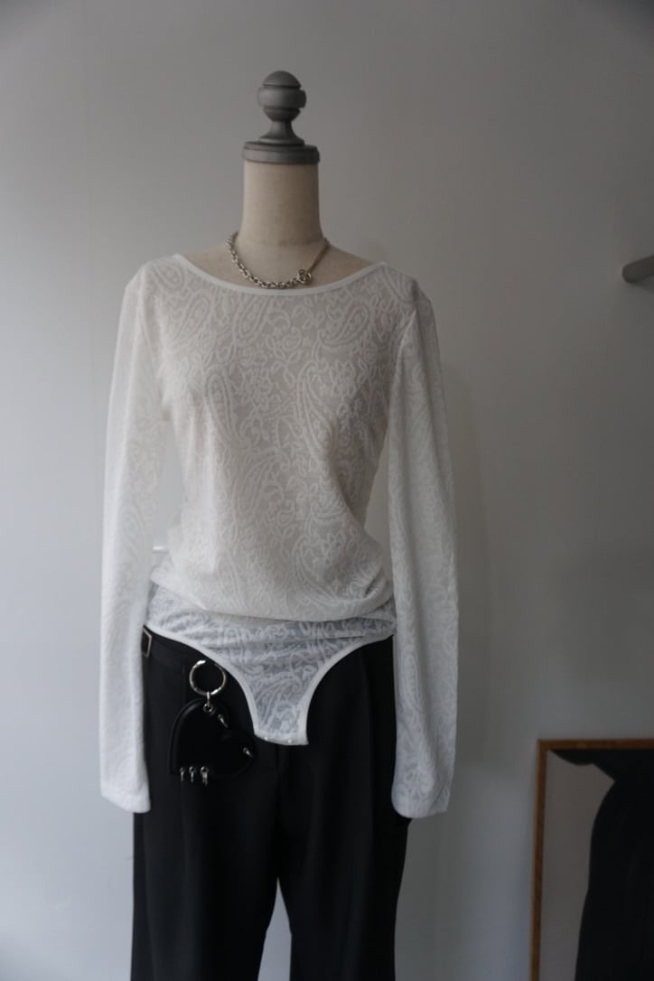 ペイズリー編みのシアーストレッチ素材を使用したボディースーツトップス。