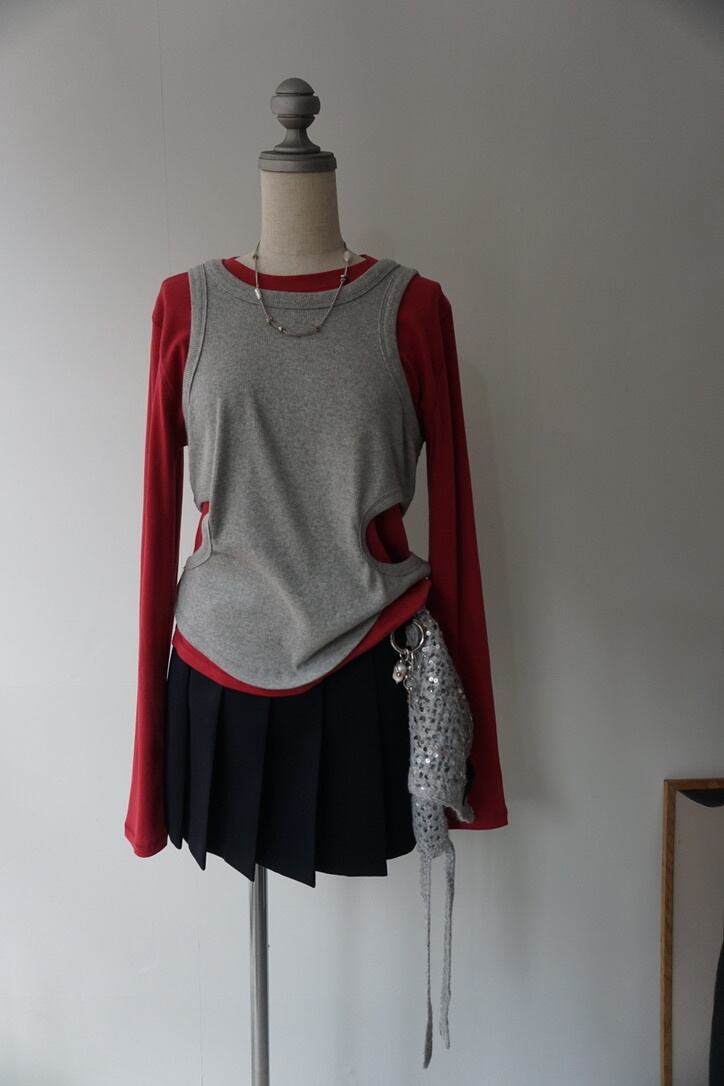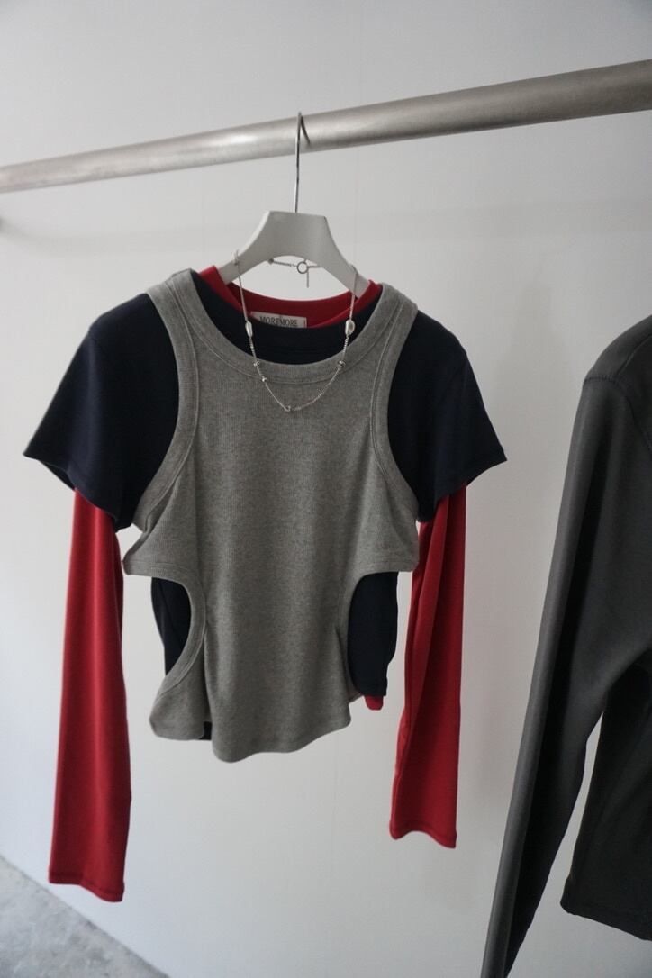 カットアウトベスト・半袖Tシャツ・ロングスリーブの3点セット。