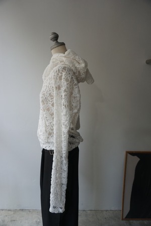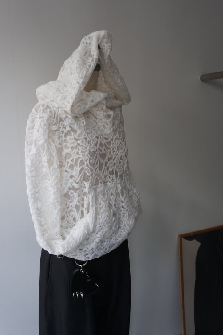フロッキー調の立体感あるレース素材を使用したフーディー。