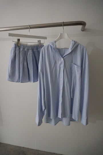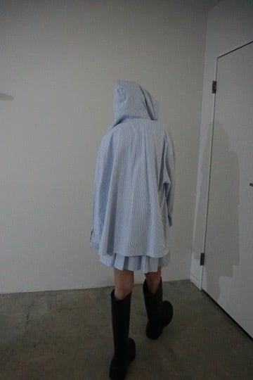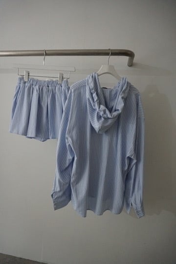 ストライプ柄のシャツに大きめのフードをプラスしたトップス。