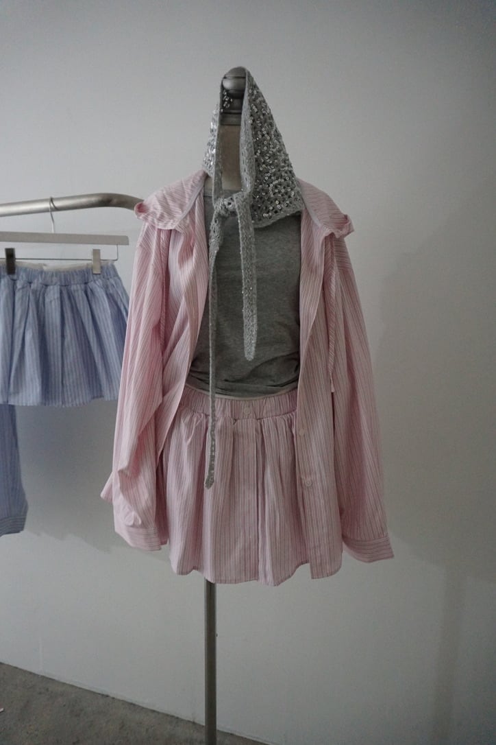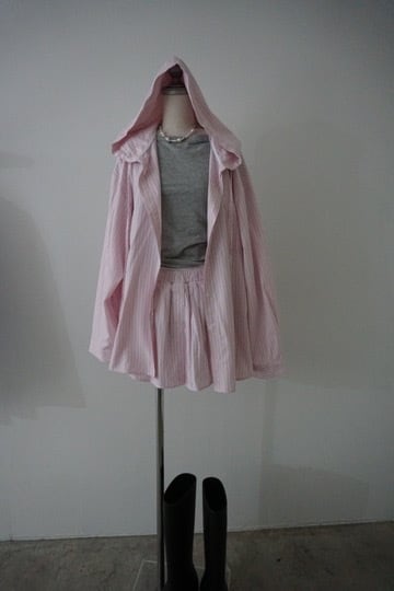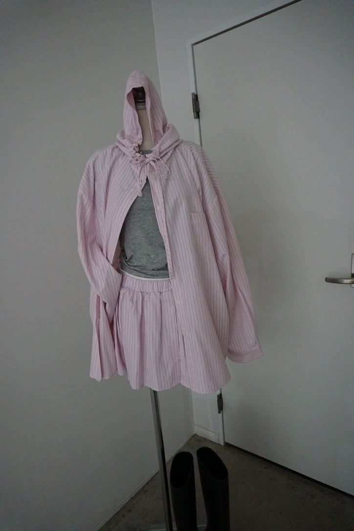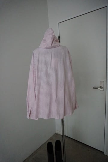 ストライプ柄のシャツに大きめのフードをプラスしたトップス。