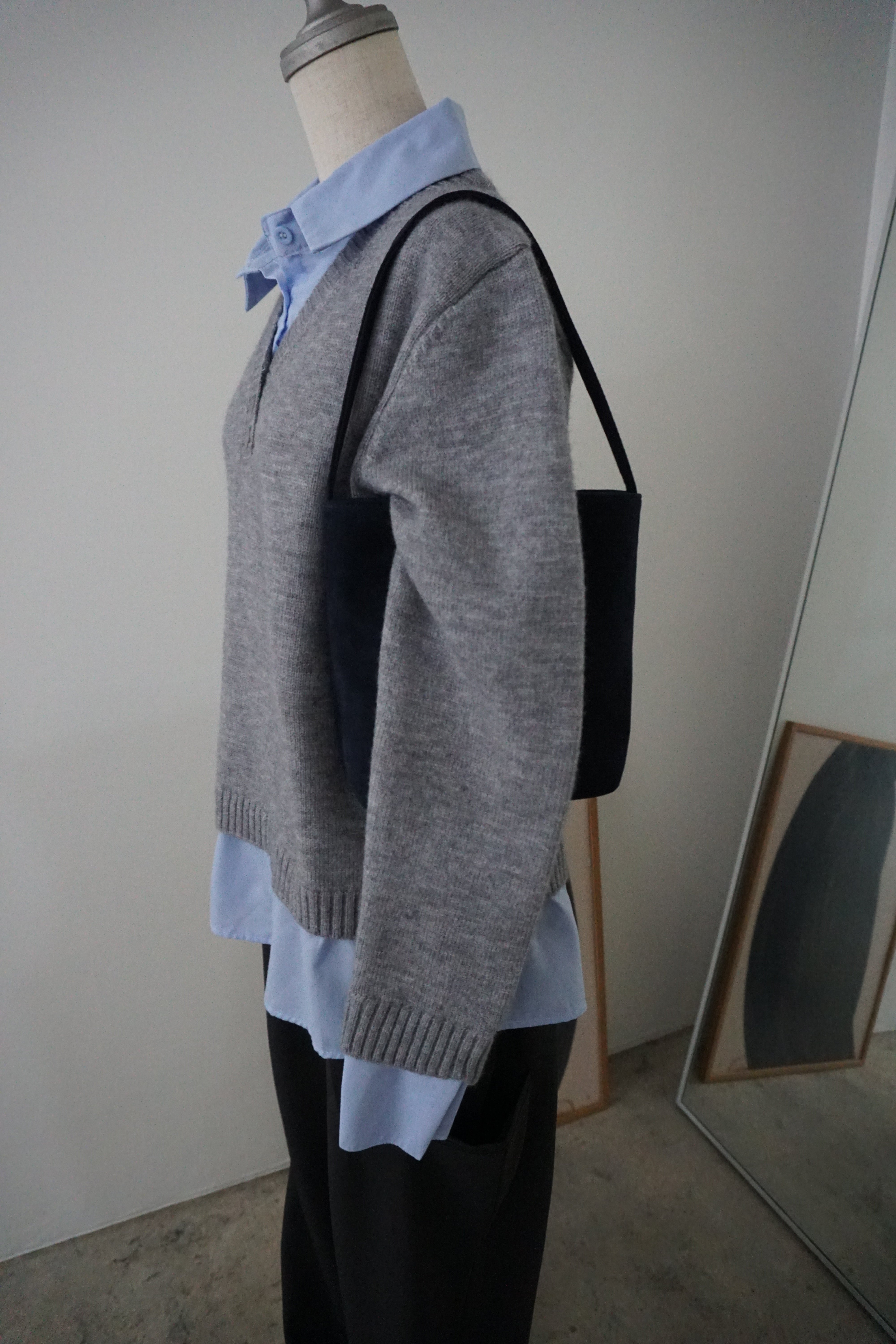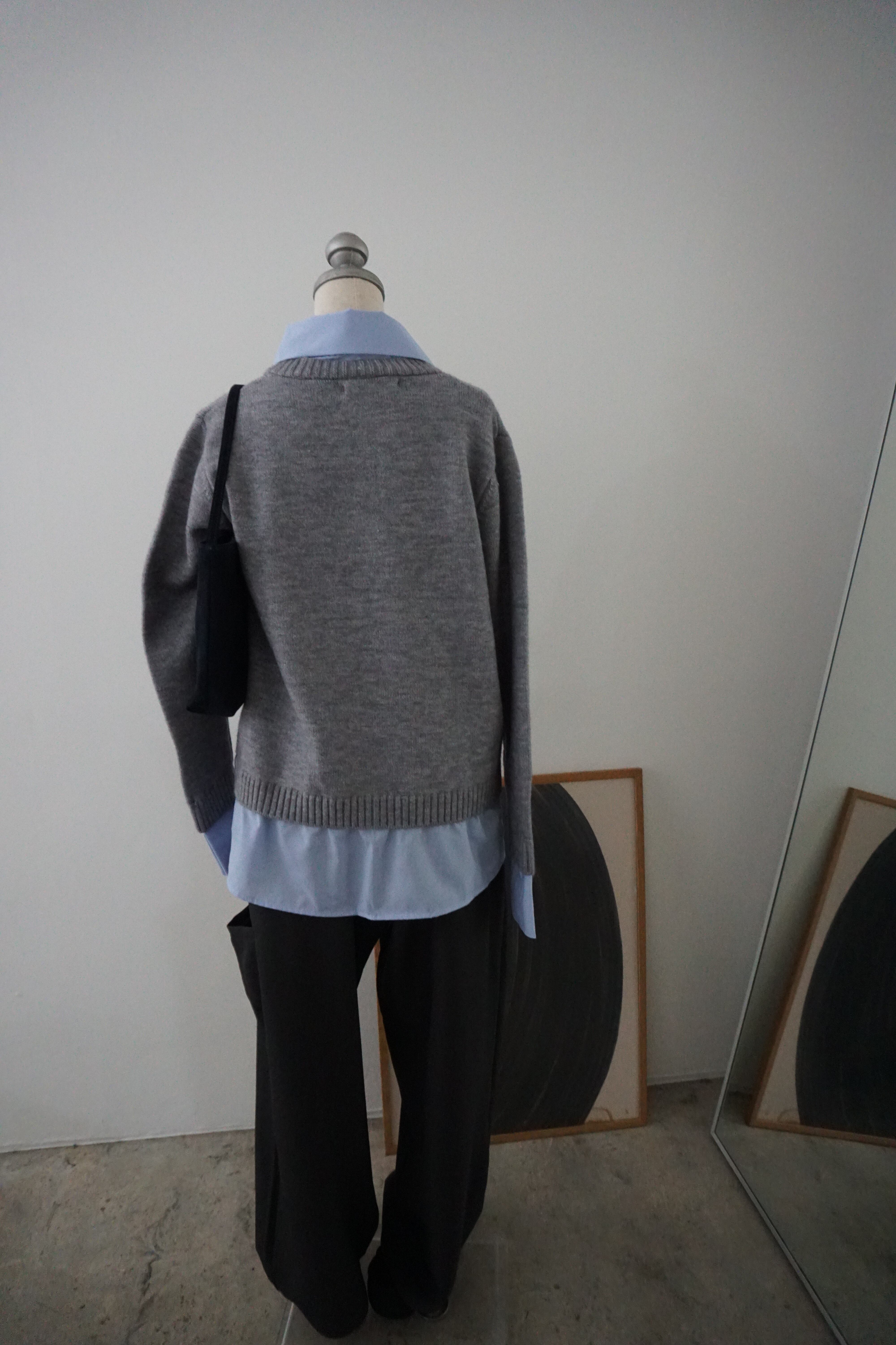 Vネックのニットにシャツを重ねたようなデザインが上品な抜け感を演出。