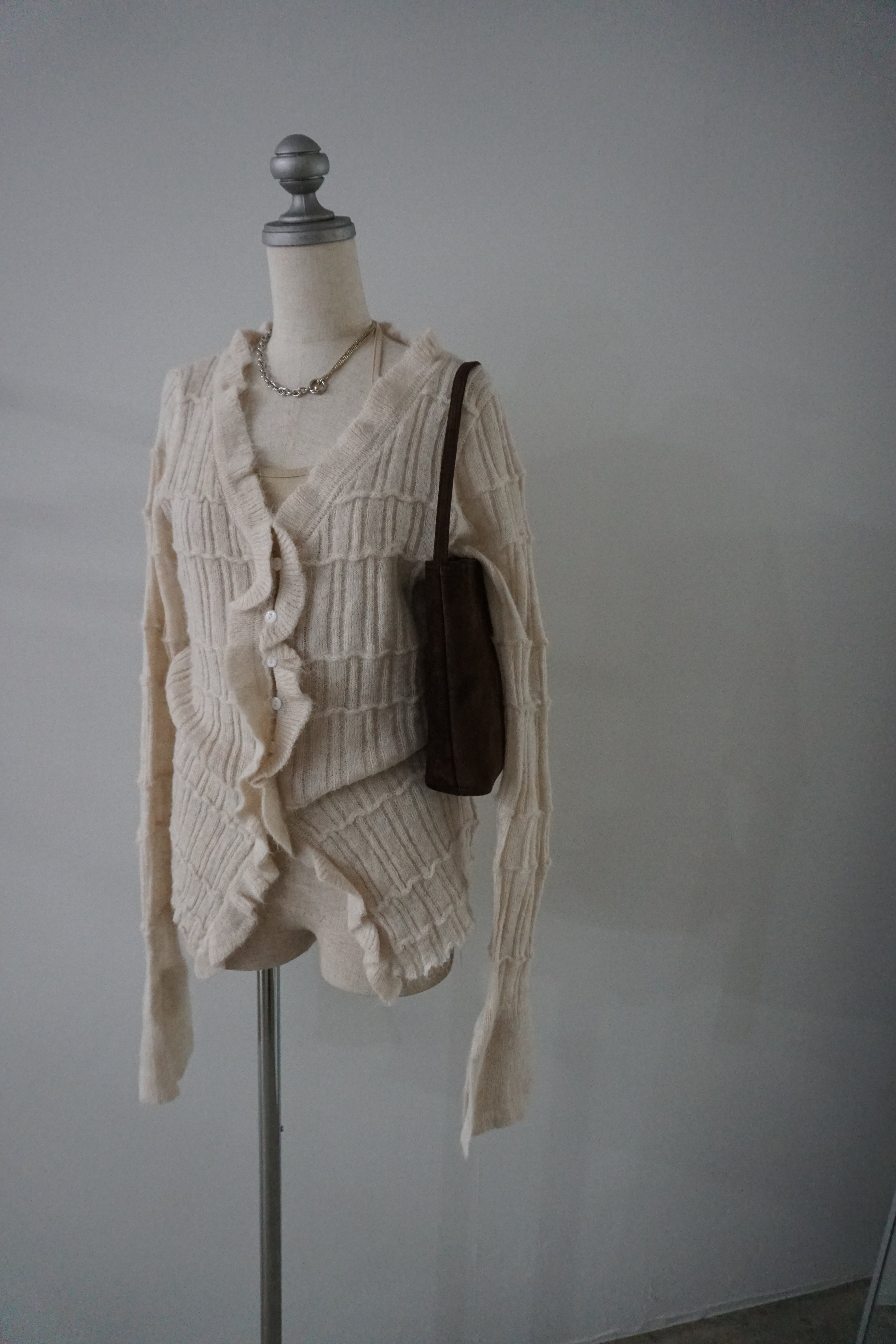 立体感のあるリブ編みとフリルのように波打つ前立てが特徴のニットカーディガン。