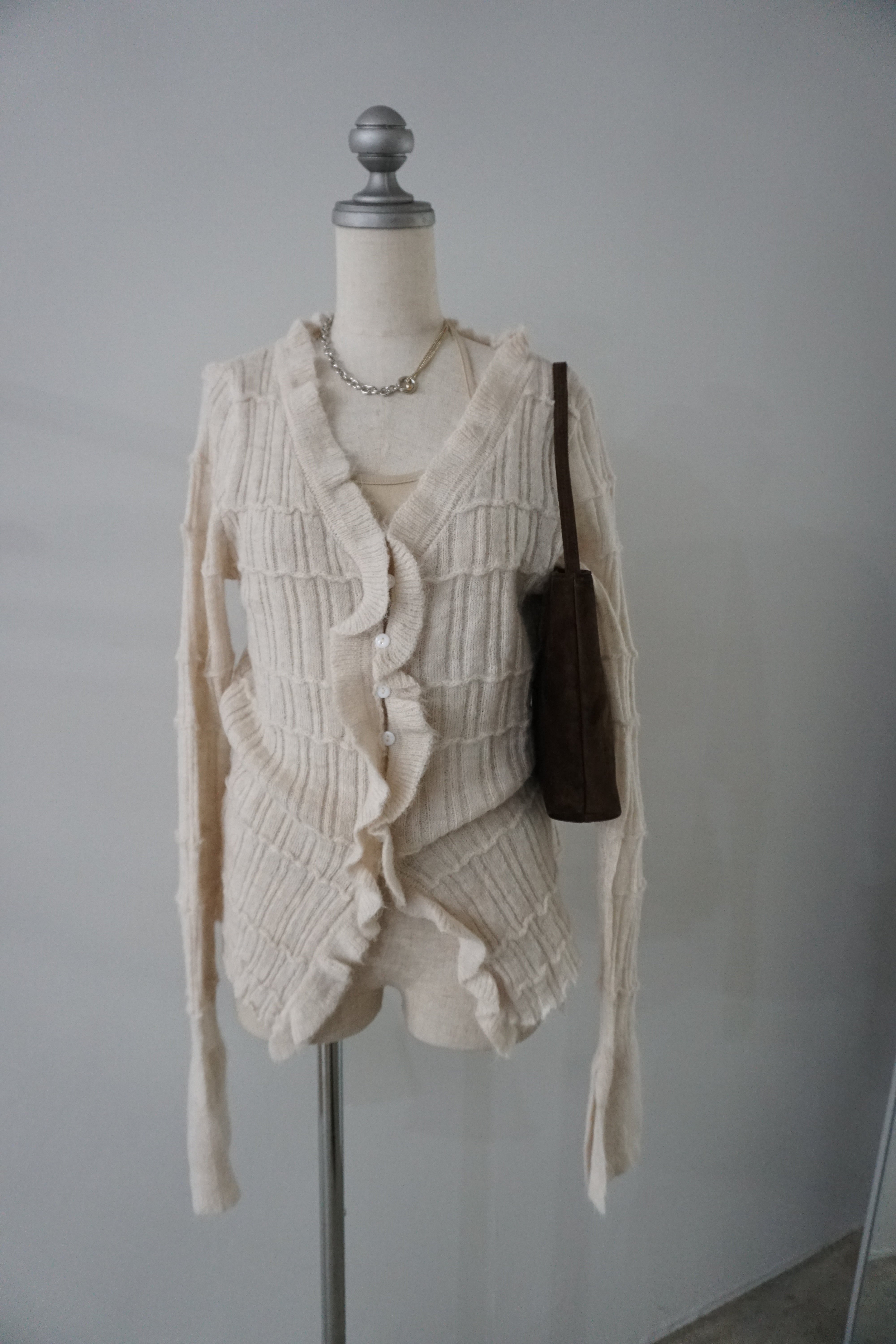 立体感のあるリブ編みとフリルのように波打つ前立てが特徴のニットカーディガン。