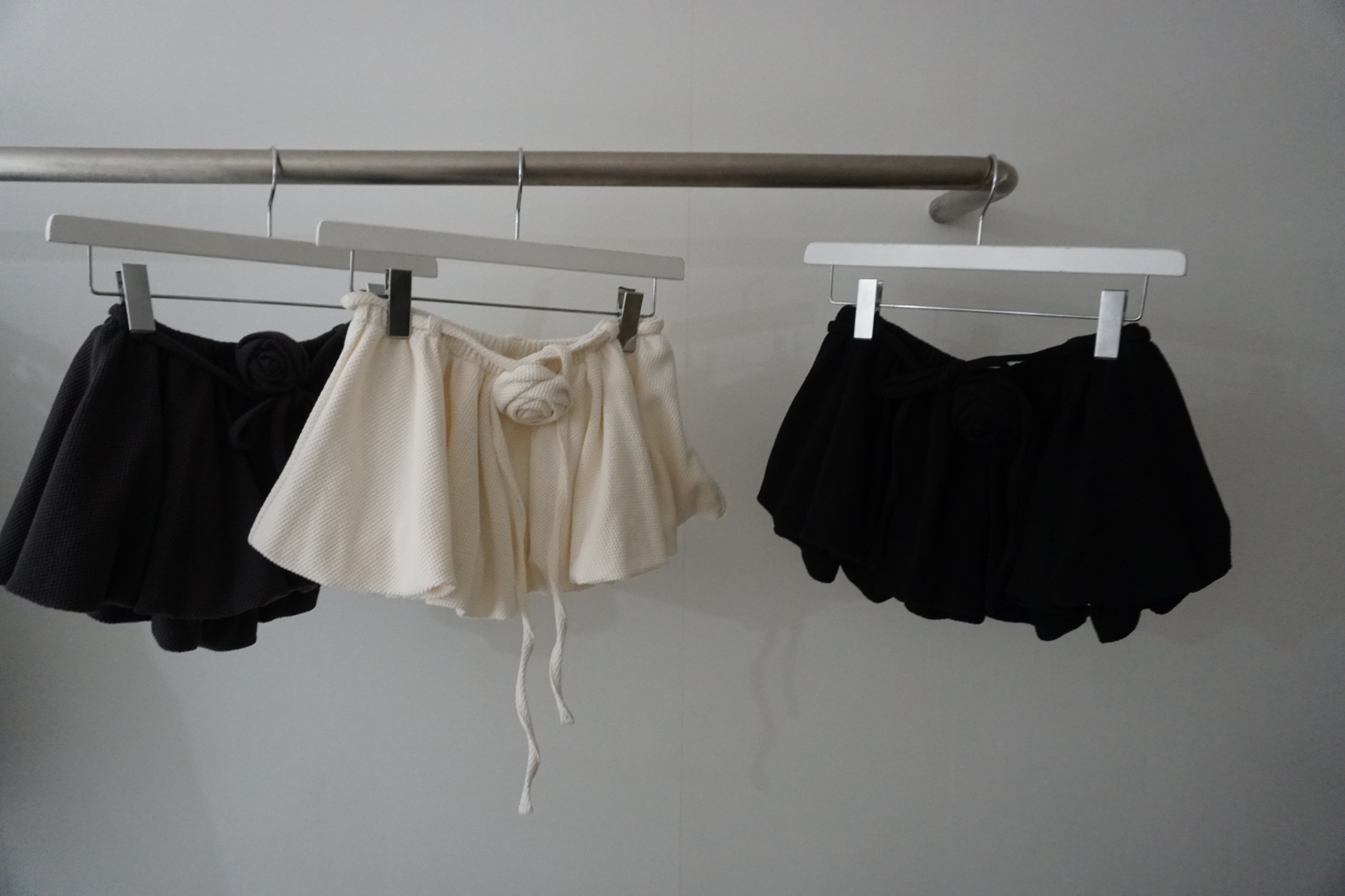 ふんわりと広がるシルエットに、バラモチーフのブローチと紐ベルトをあしらい、立体感のあるウエストラインを演出。