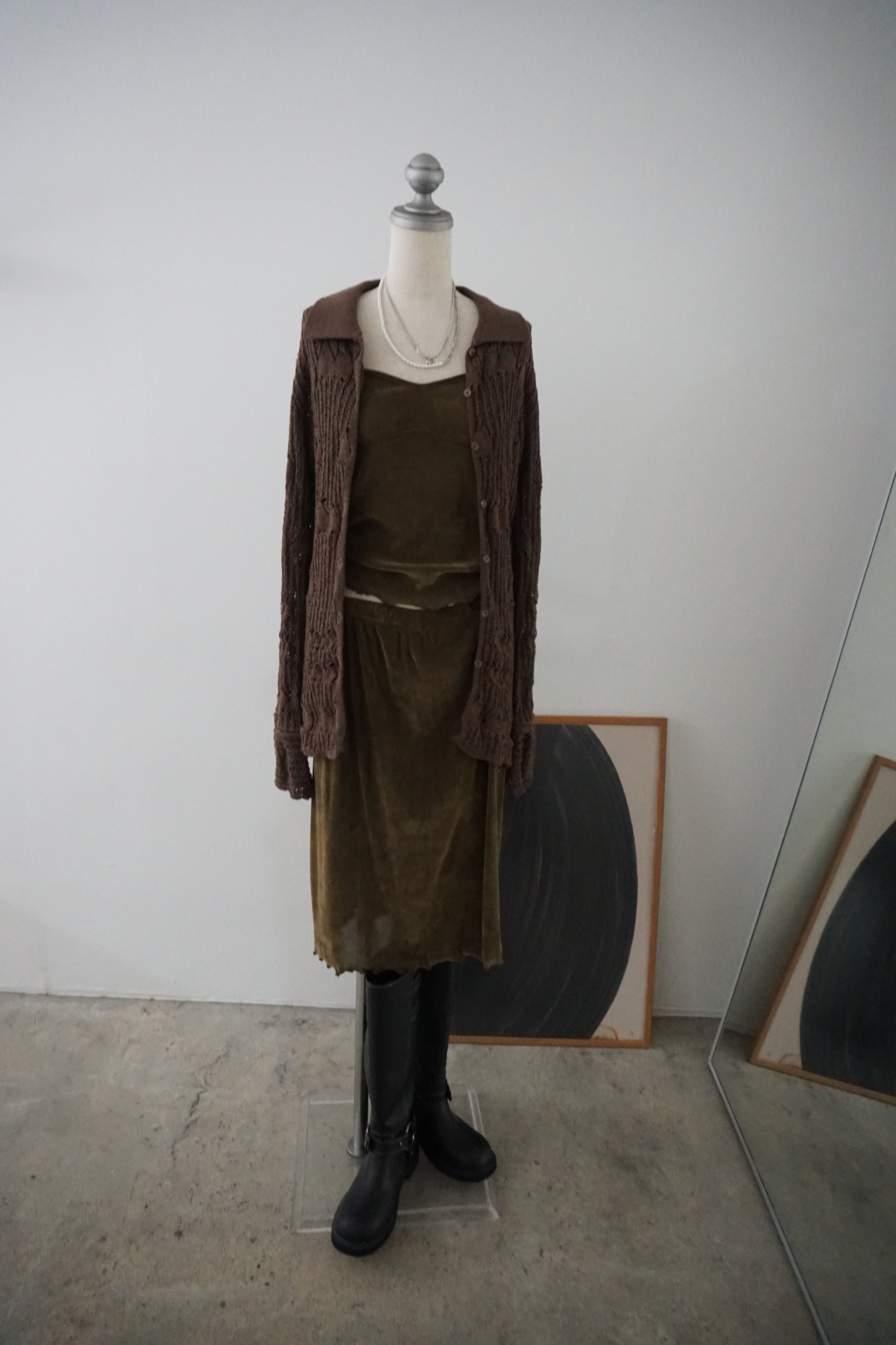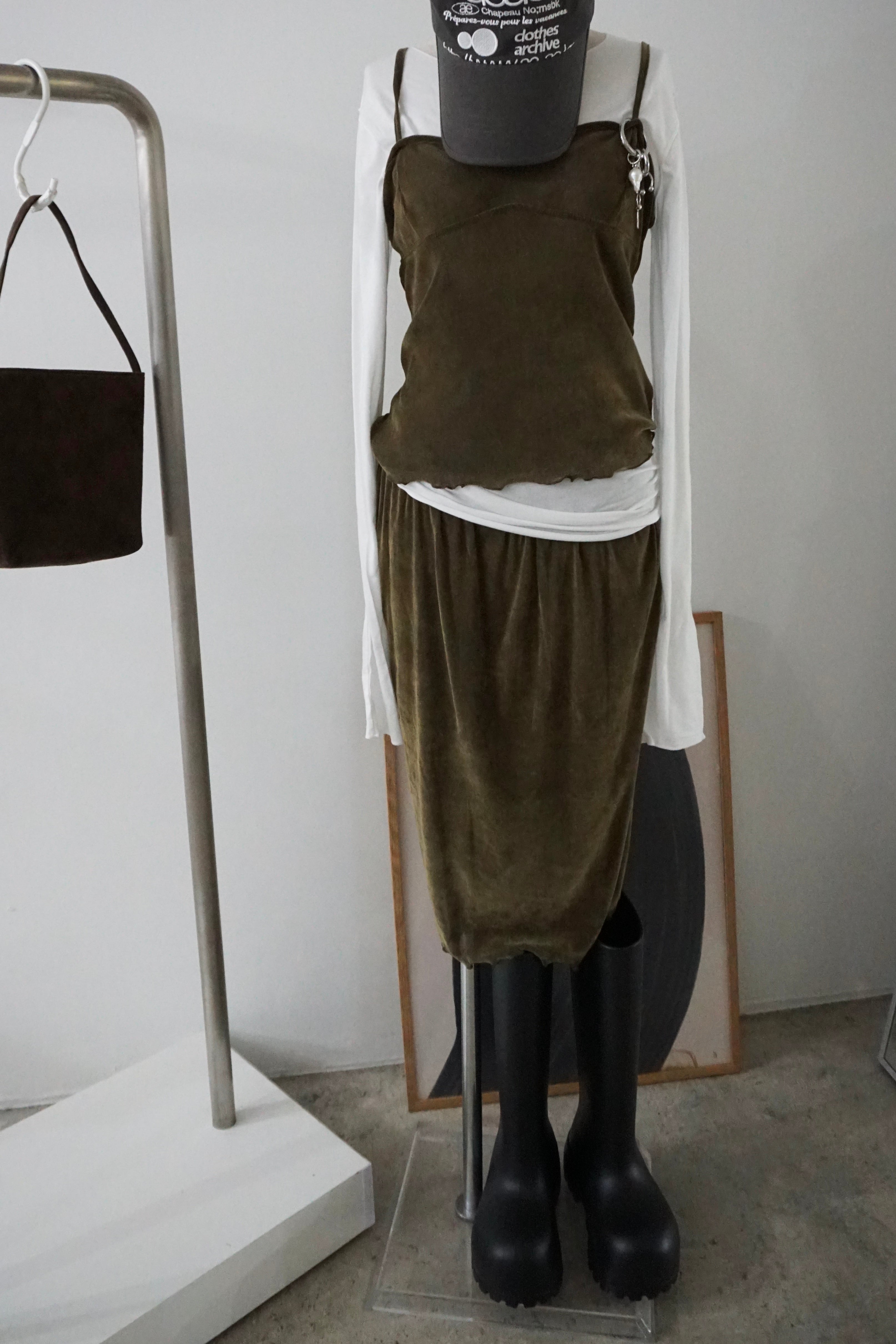 柔らかな光沢が上品なベロア素材を使用したキャミソールとスカートのセットアイテム。