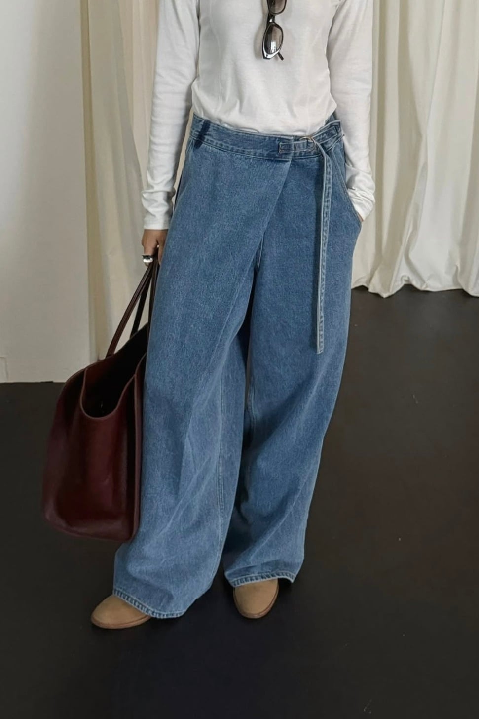 フロント部分を重ね合わせたラップデザインが印象的なデニムパンツ。 同素材のベルトでウエストを調整でき、程よく抜け感のあるシルエットを演出します。 柔らかな風合いのウォッシュデニムを使用しており、季節を問わず着用しやすい一本です。 シンプルなトップスを合わせるだけで、こなれたスタイルに仕上がります。