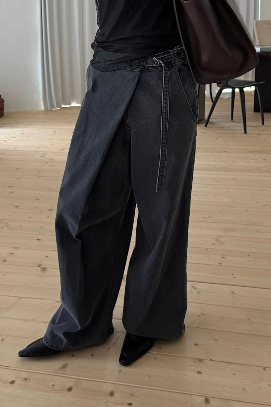 フロント部分を重ね合わせたラップデザインが印象的なデニムパンツ。
