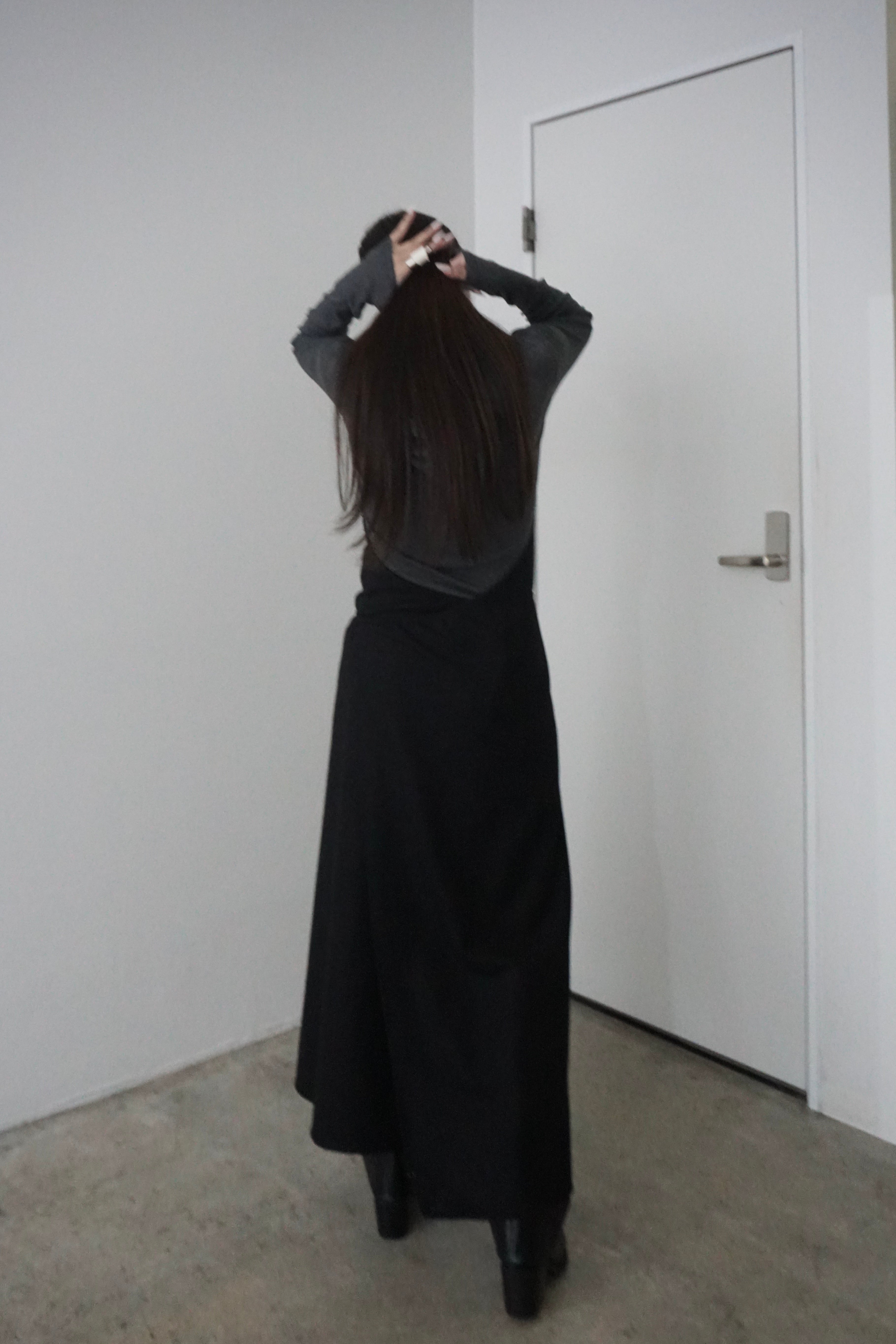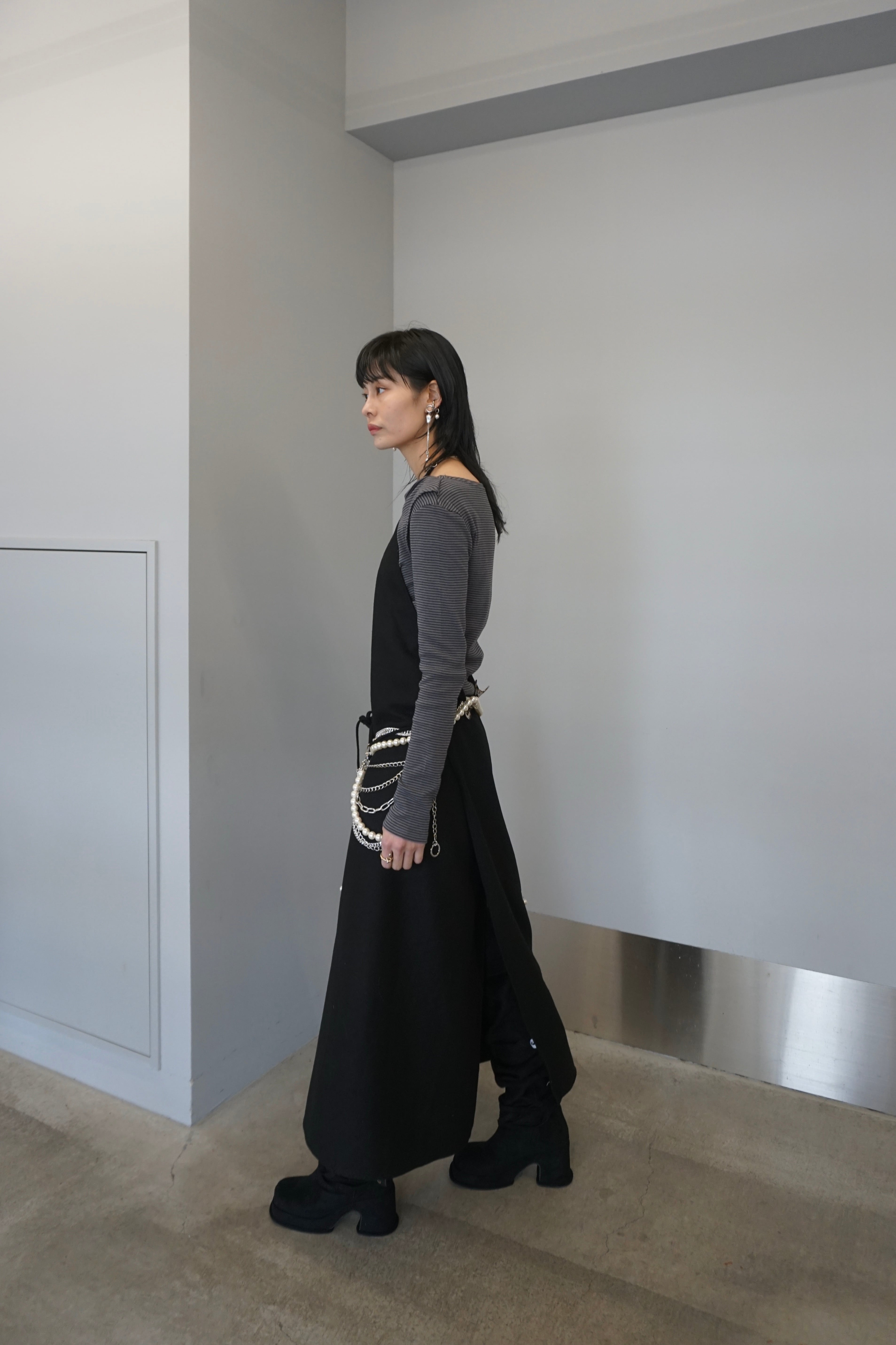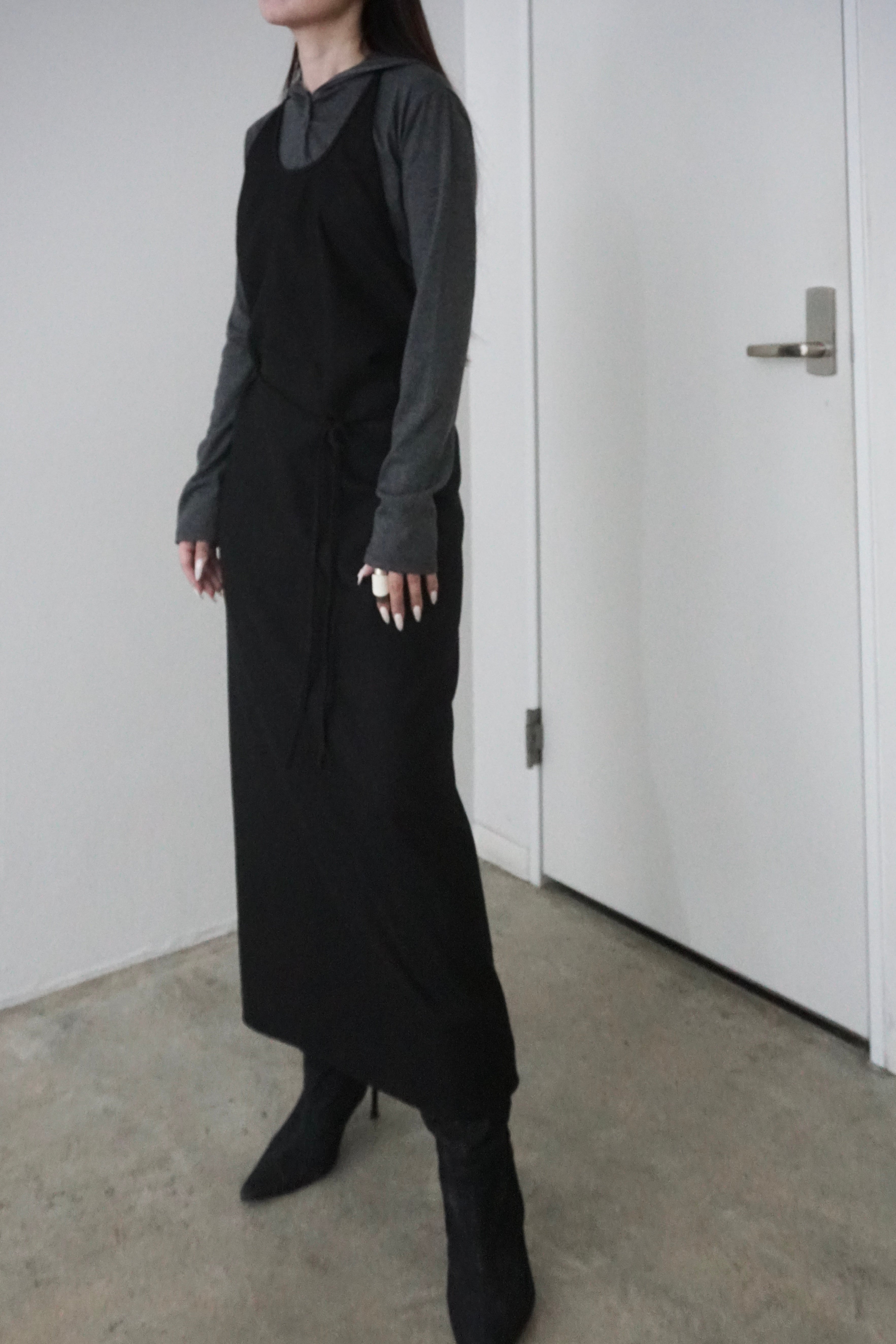 メルトン素材を使用したホルターネックのラップロングドレス。