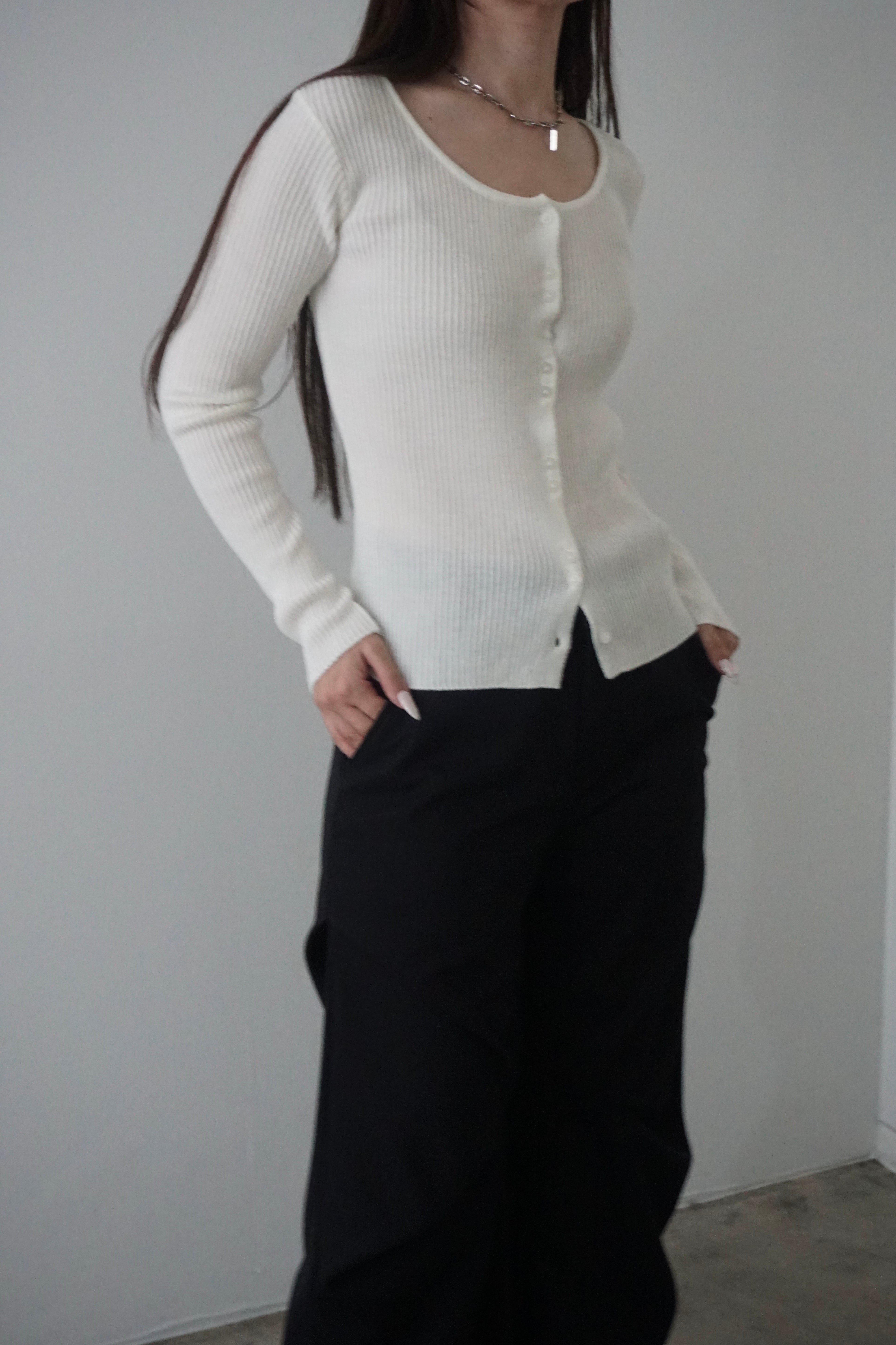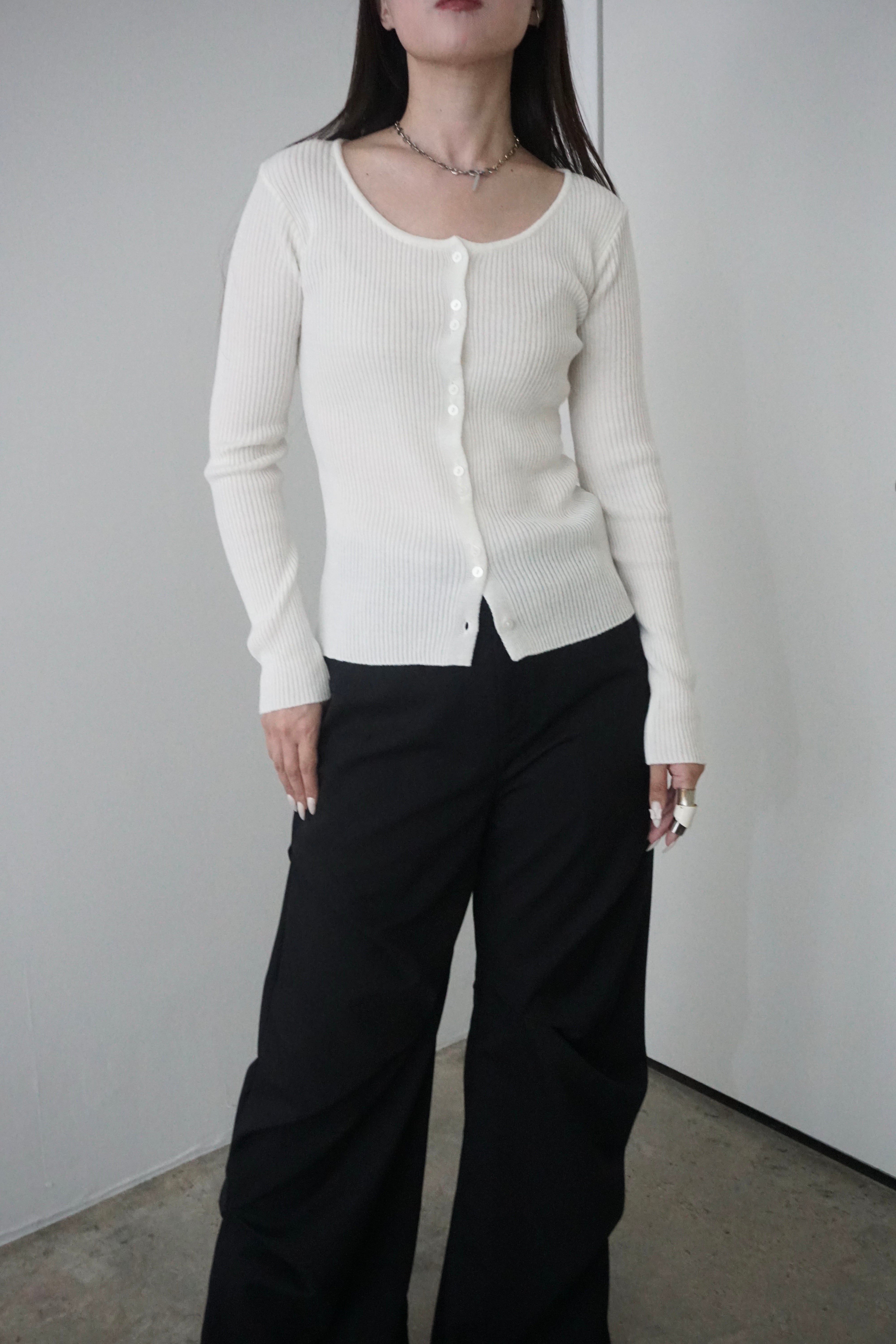 伸縮性のあるリブ素材を使用したフィットシルエットのトップス。