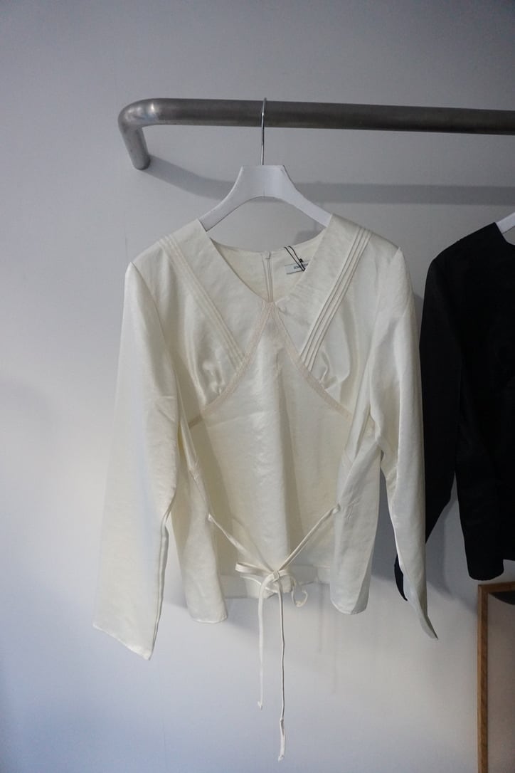 ピンタックとレース装飾を施したサテン素材のプルオーバー