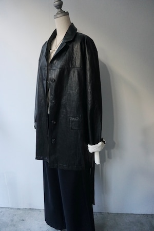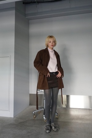 厚みを抑えた柔らかな風合いが特徴のフェイクレザーを使用した、レザーベルトジャケット。