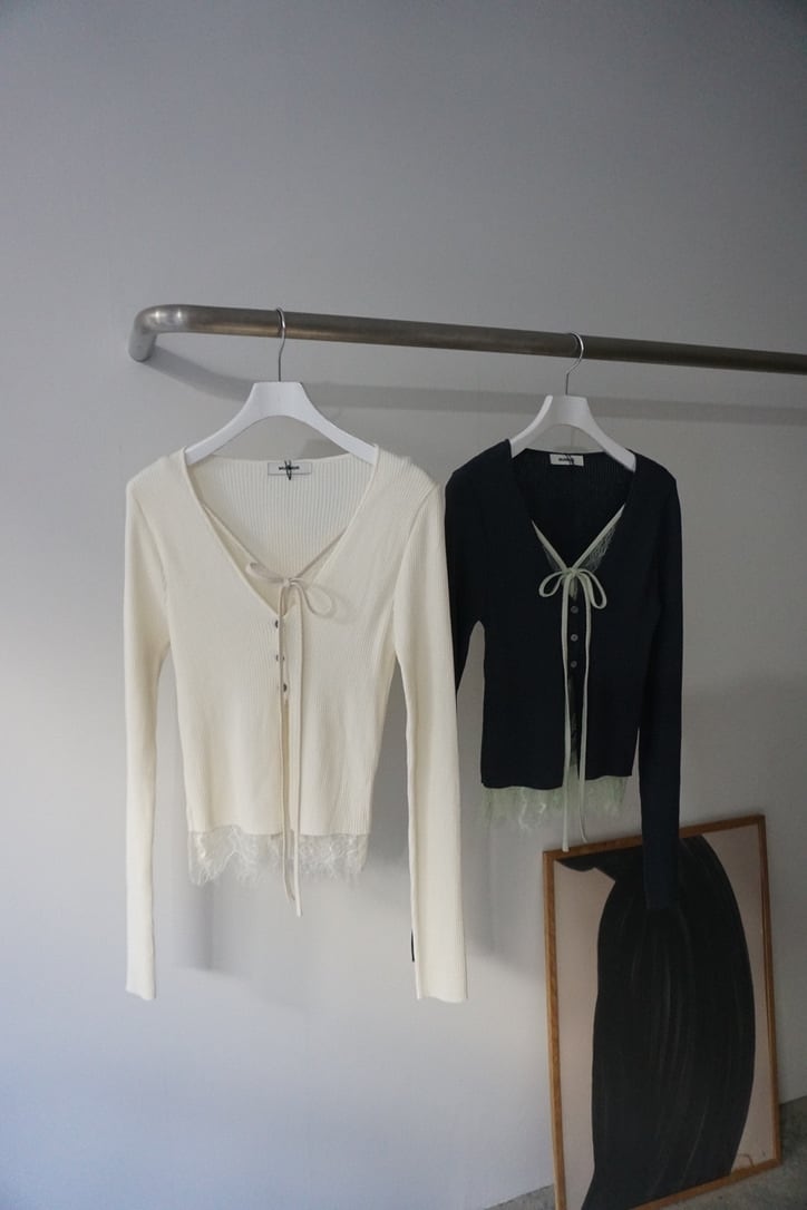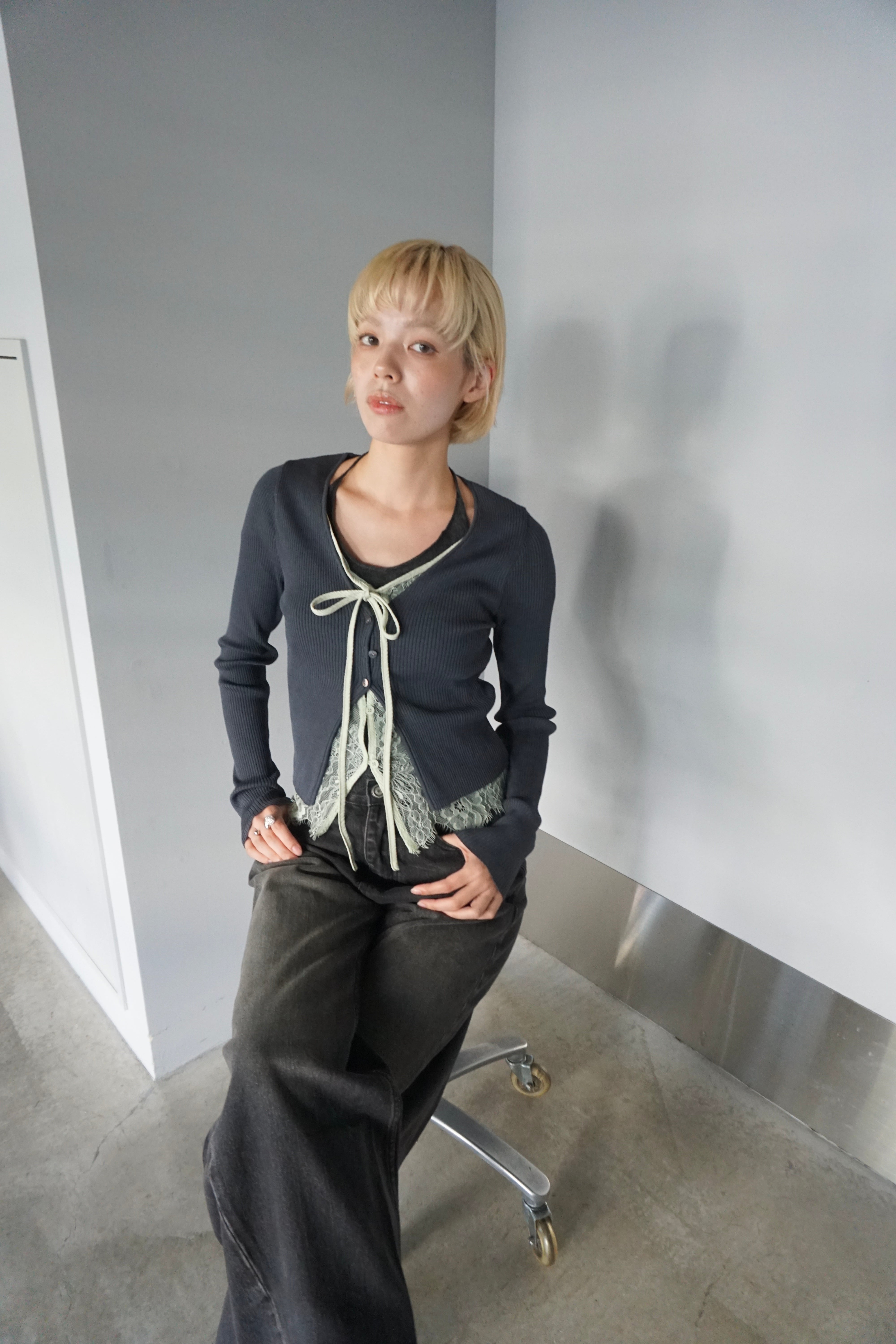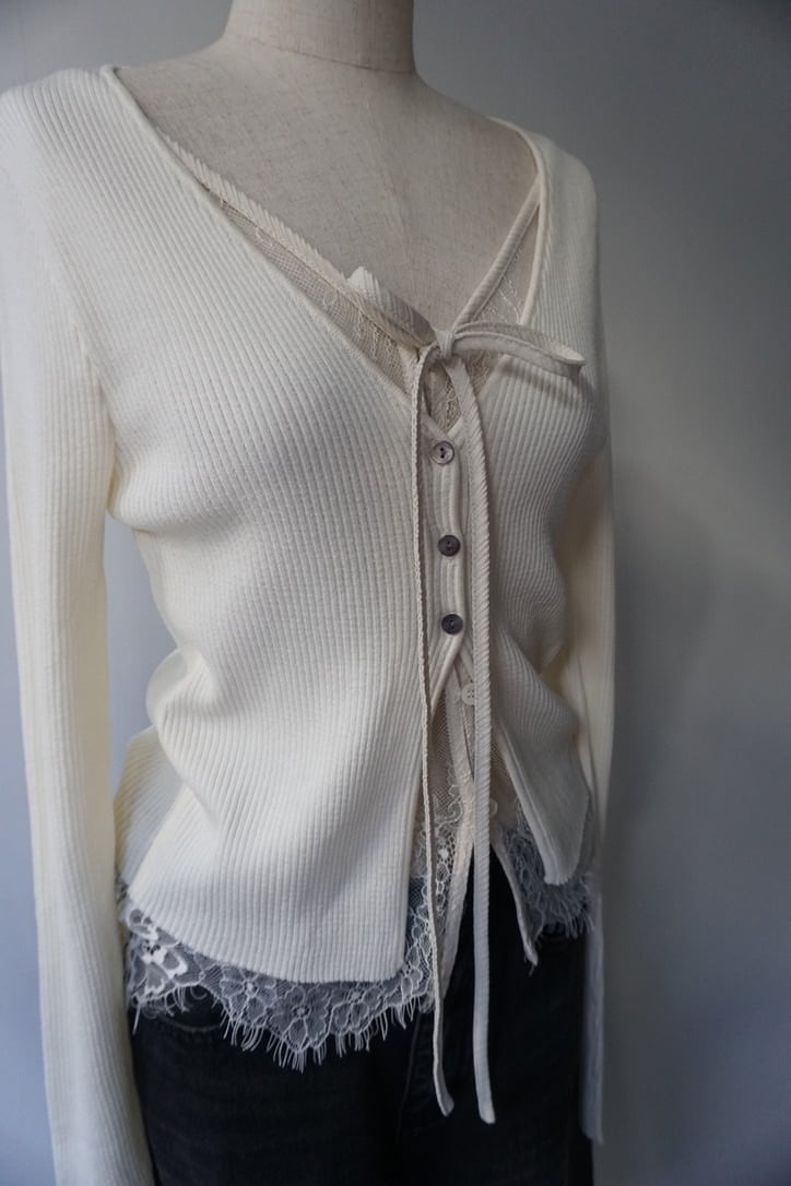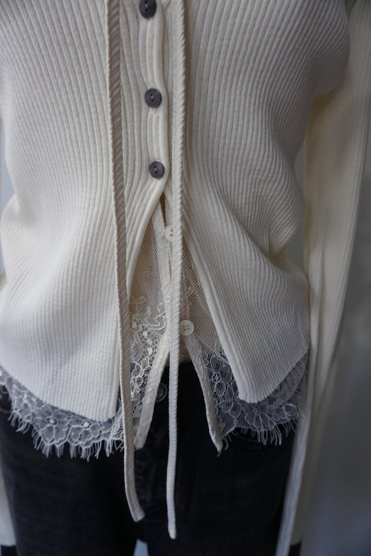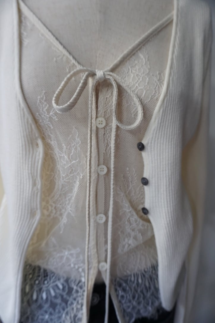 レースキャミソールを重ねたようなデザインが特徴のリブカーディガン。