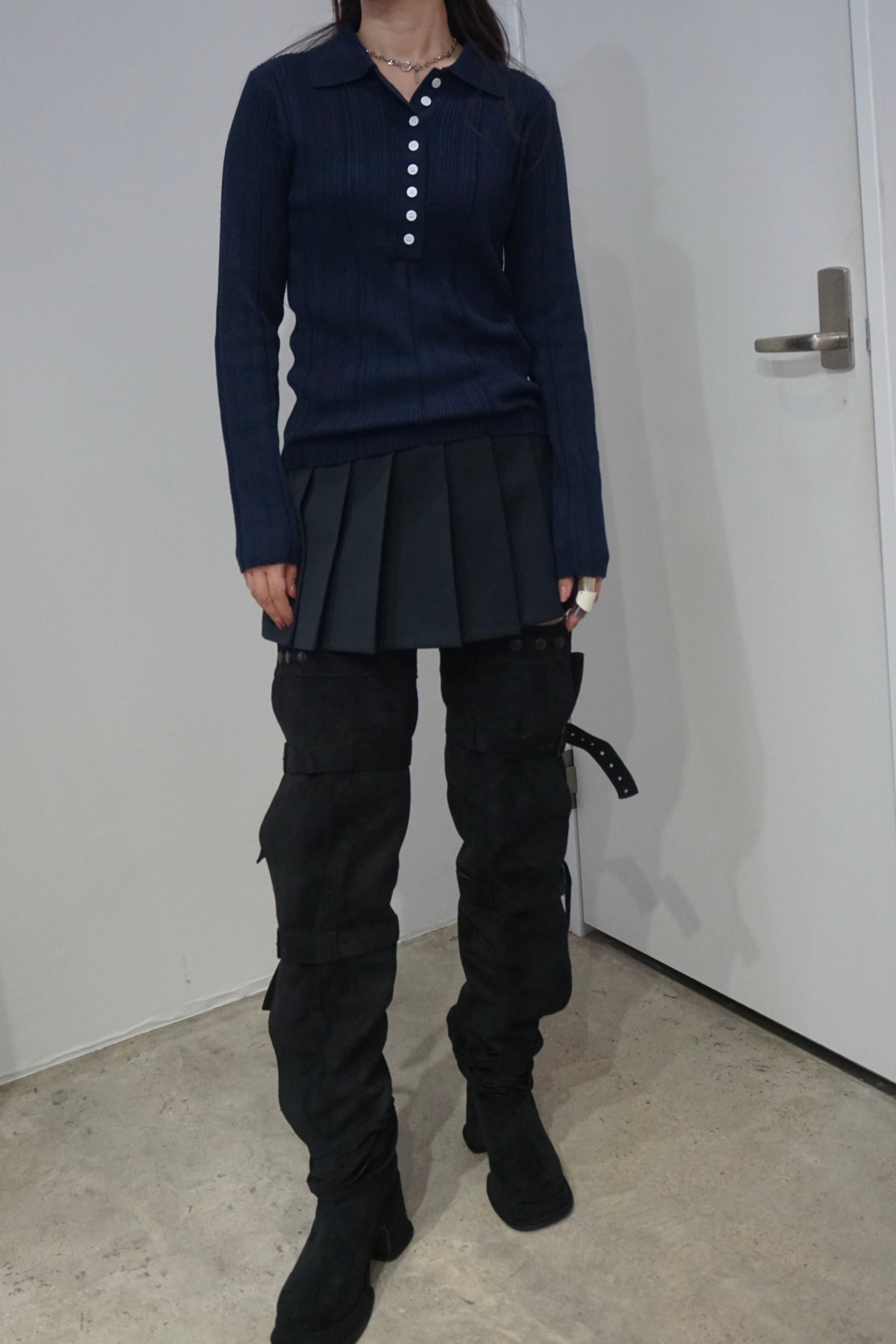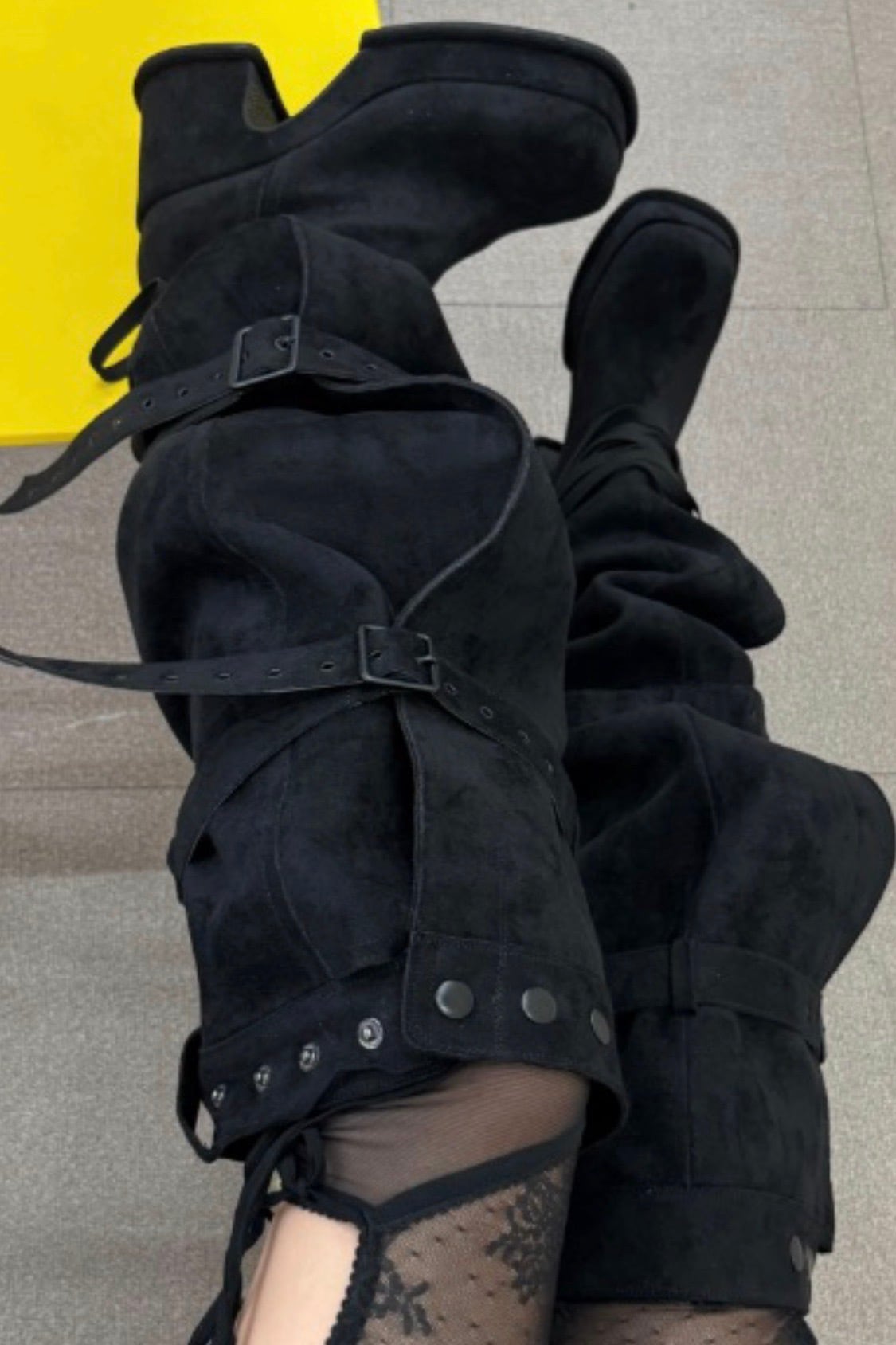 立体的なバックルストラップが特徴的なサイハイブーツ。