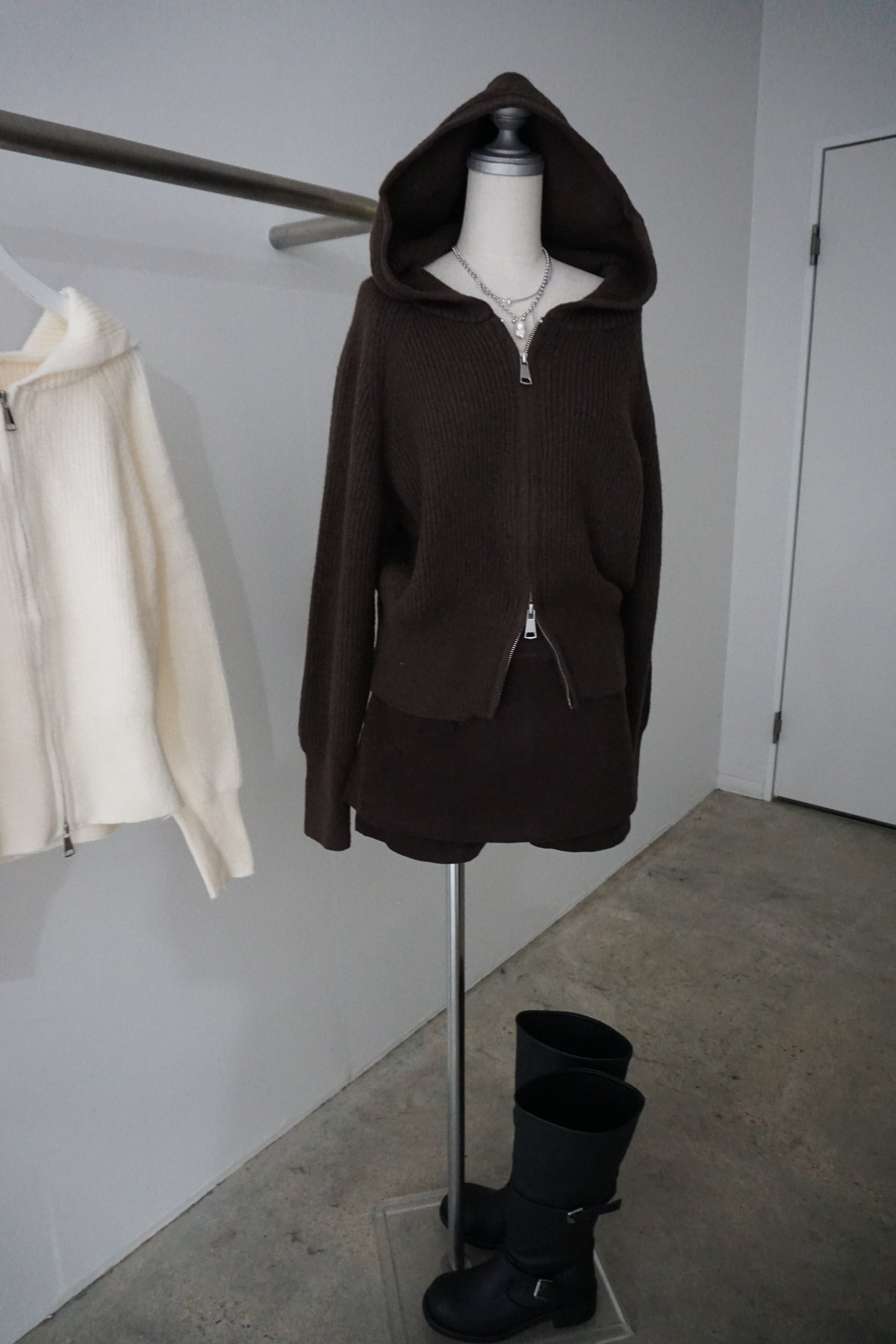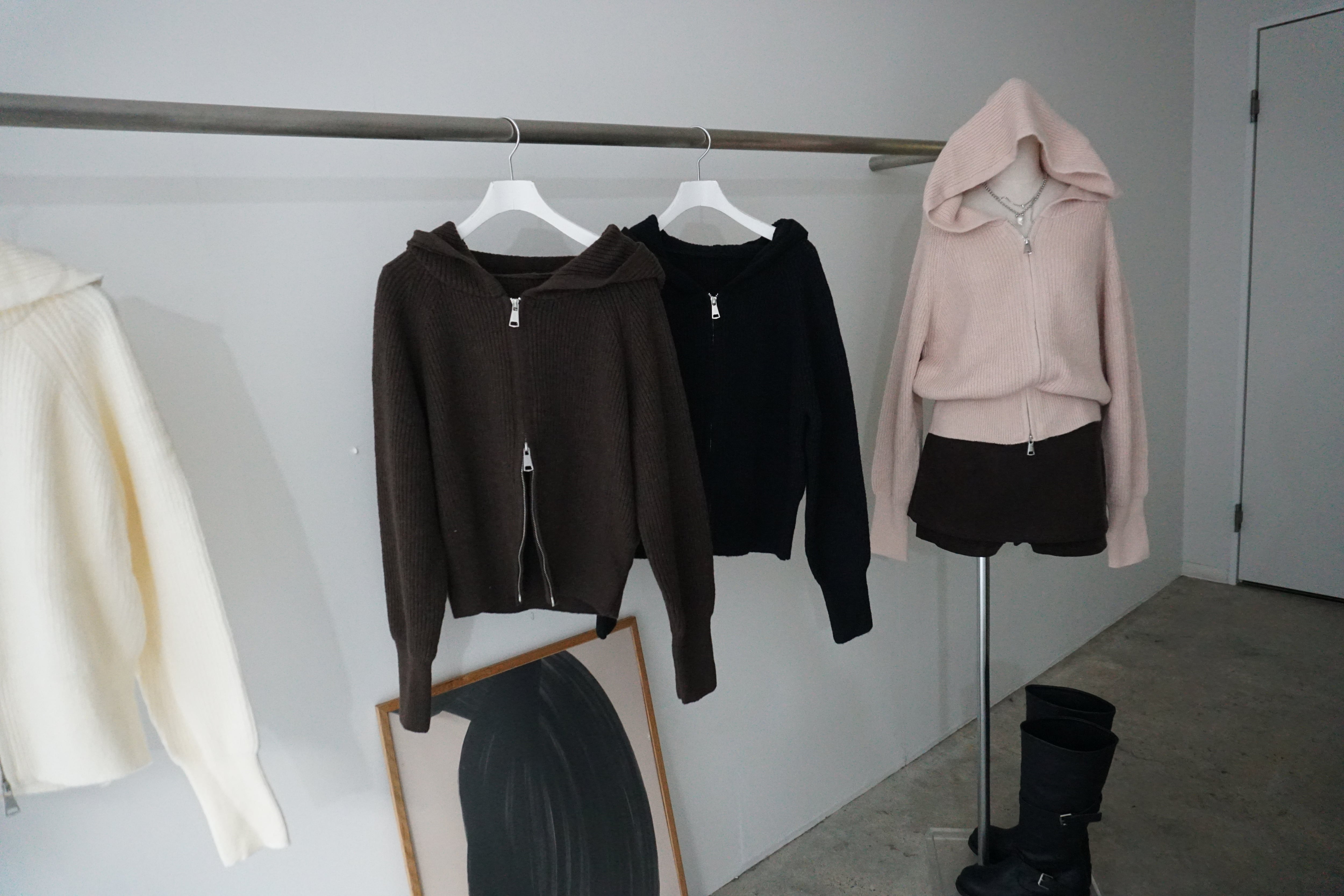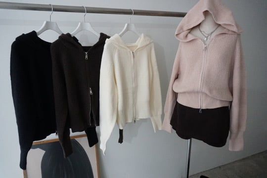 肉厚すぎず、程よいハリ感のあるリブニット素材を使用したジップアップフーディトップス。