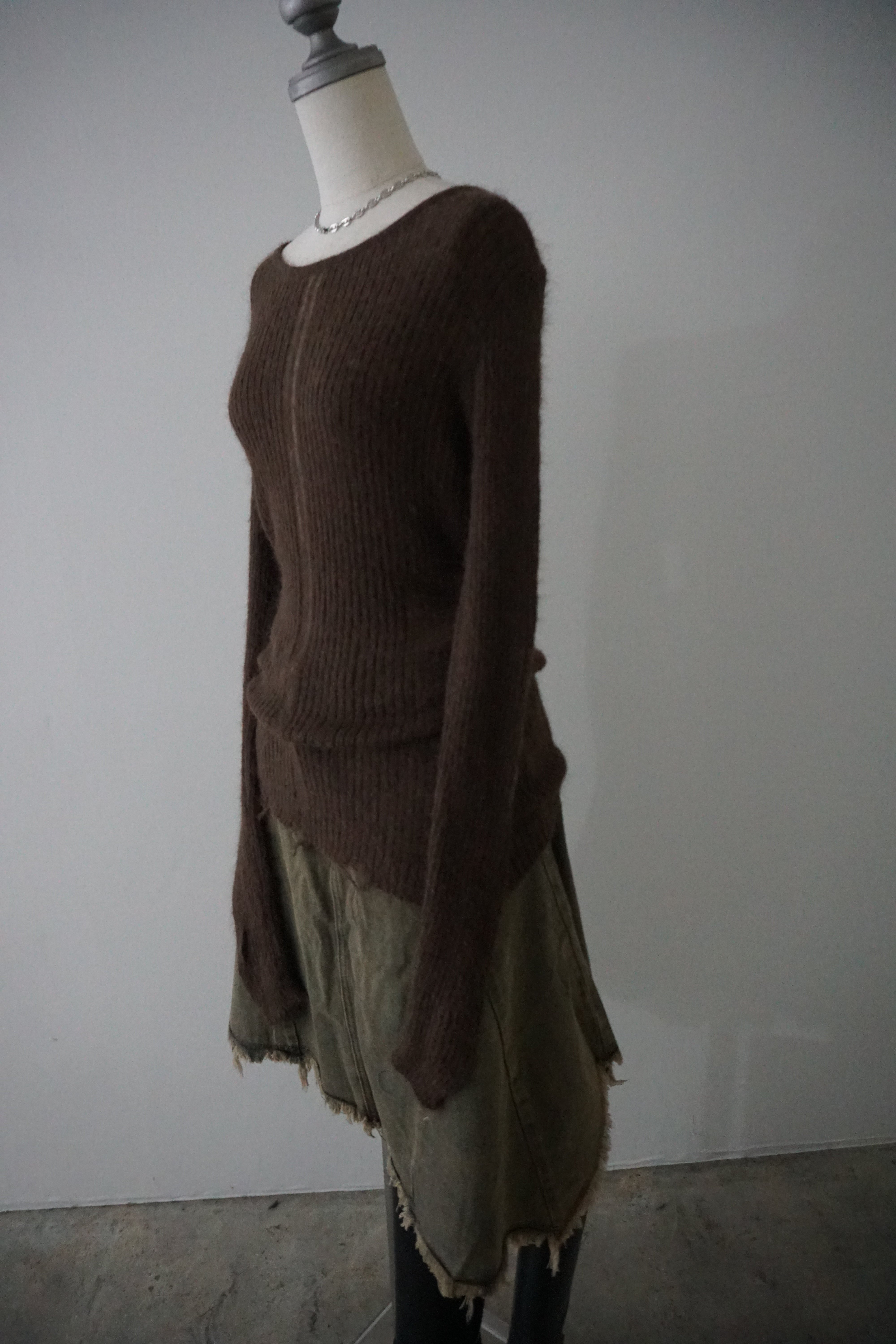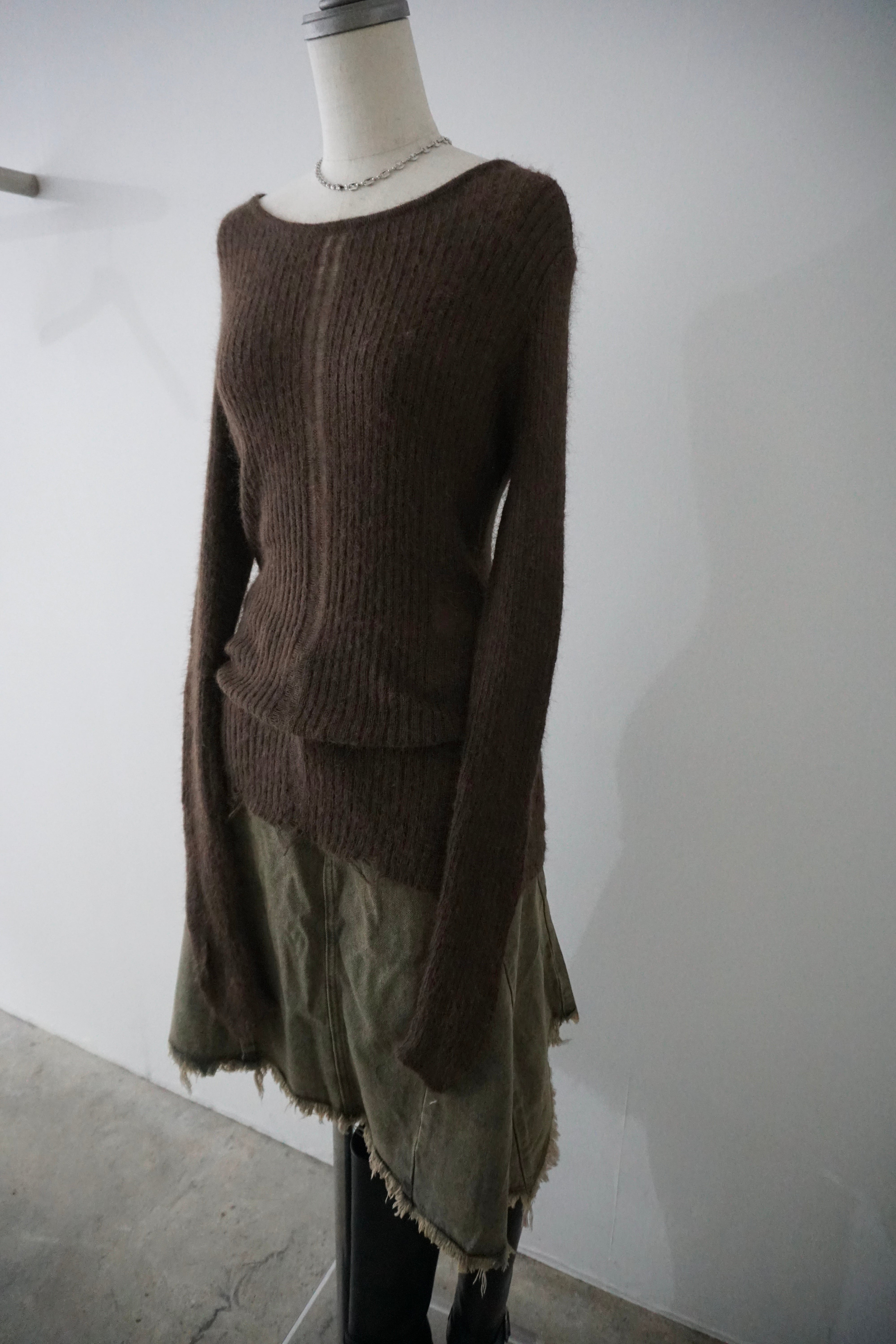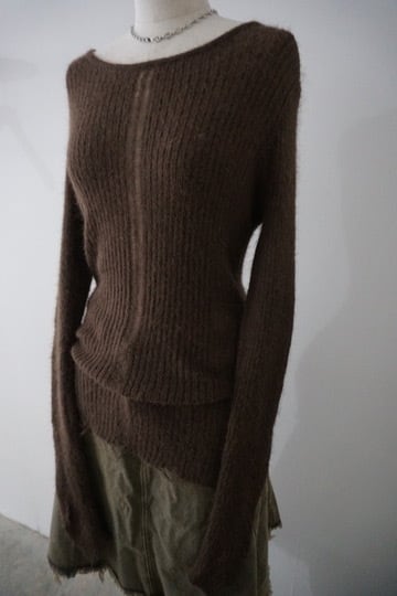 透け感のあるリブ編みニット素材を使用した、ダメージデザイン入りトップス。