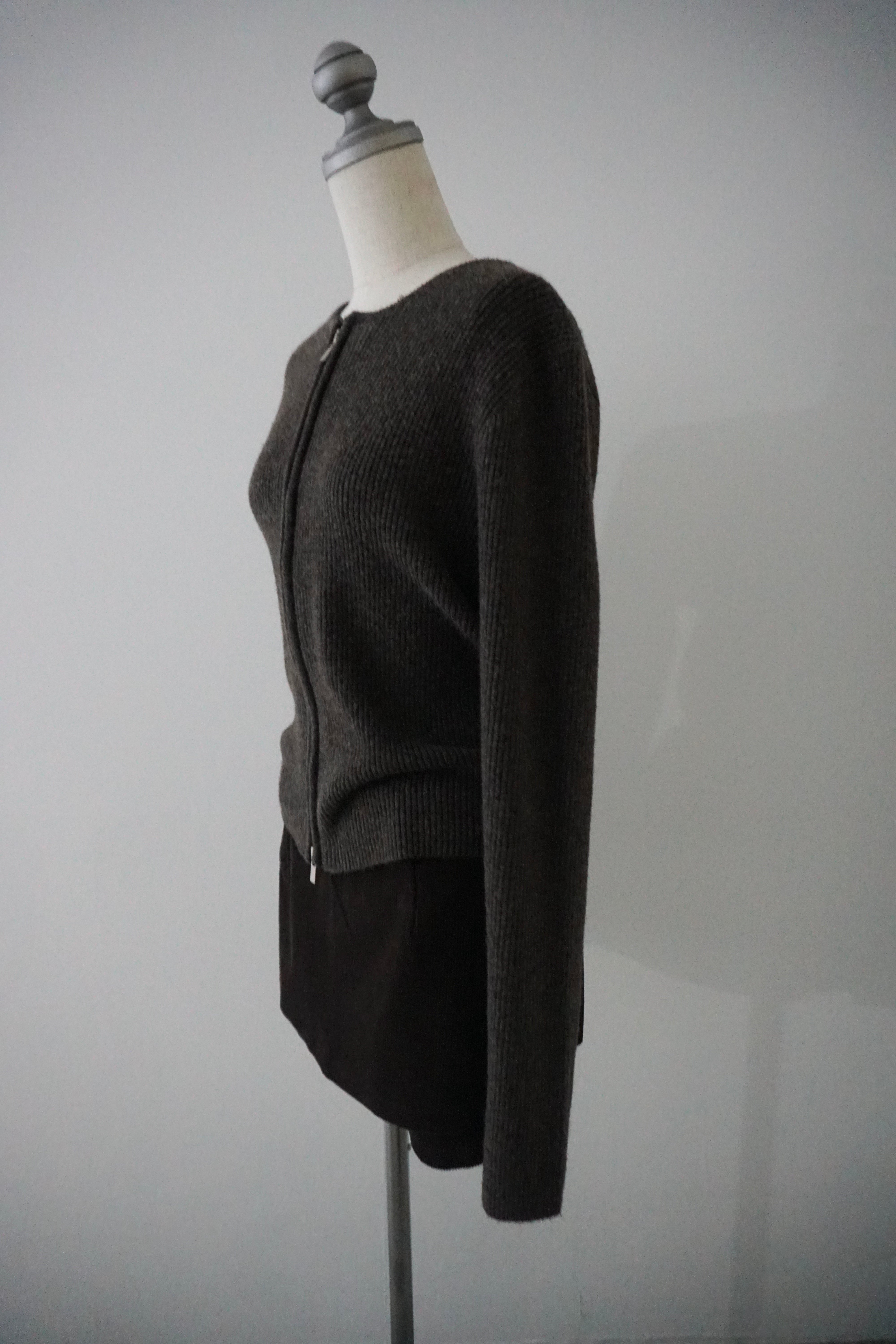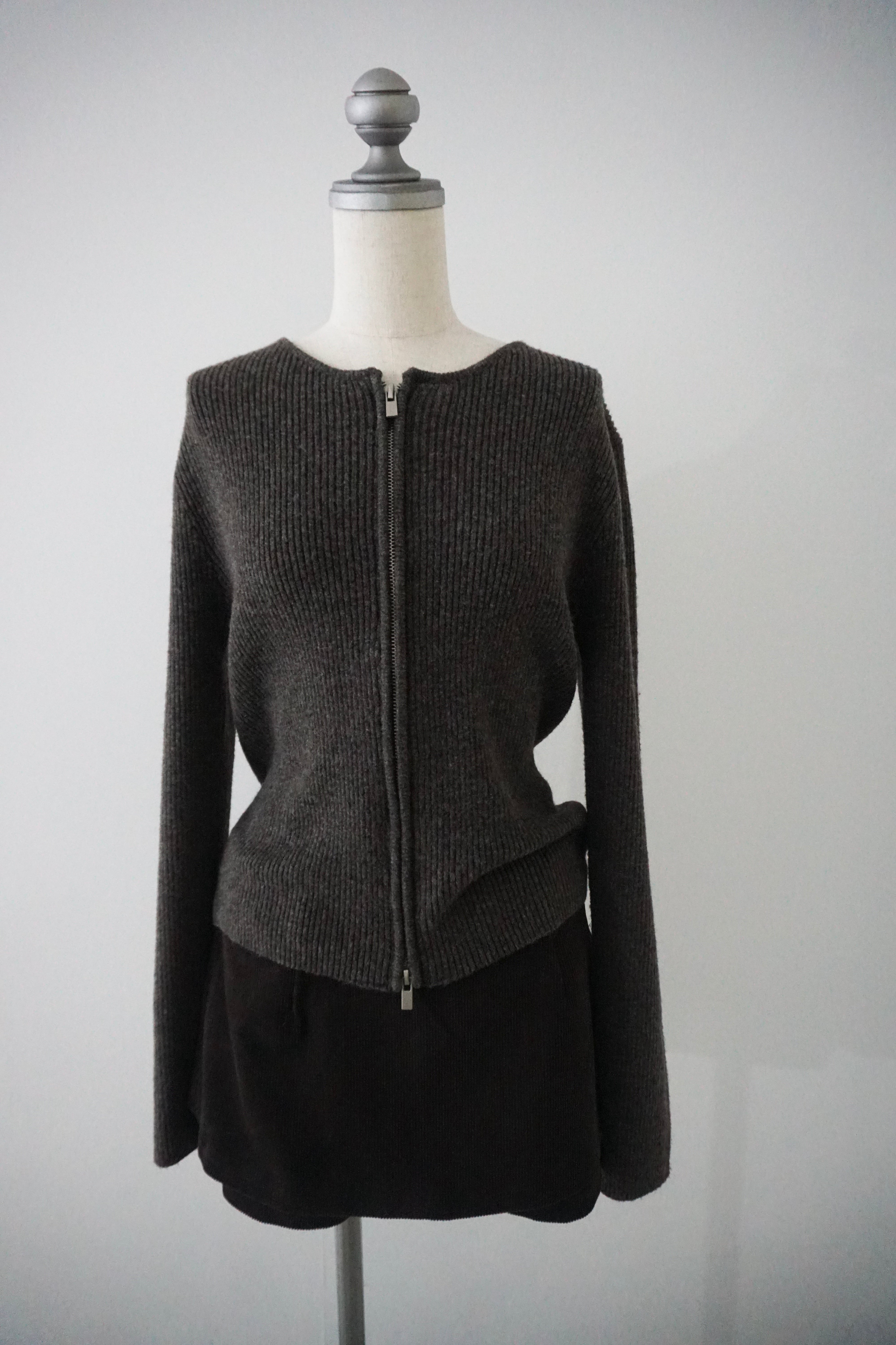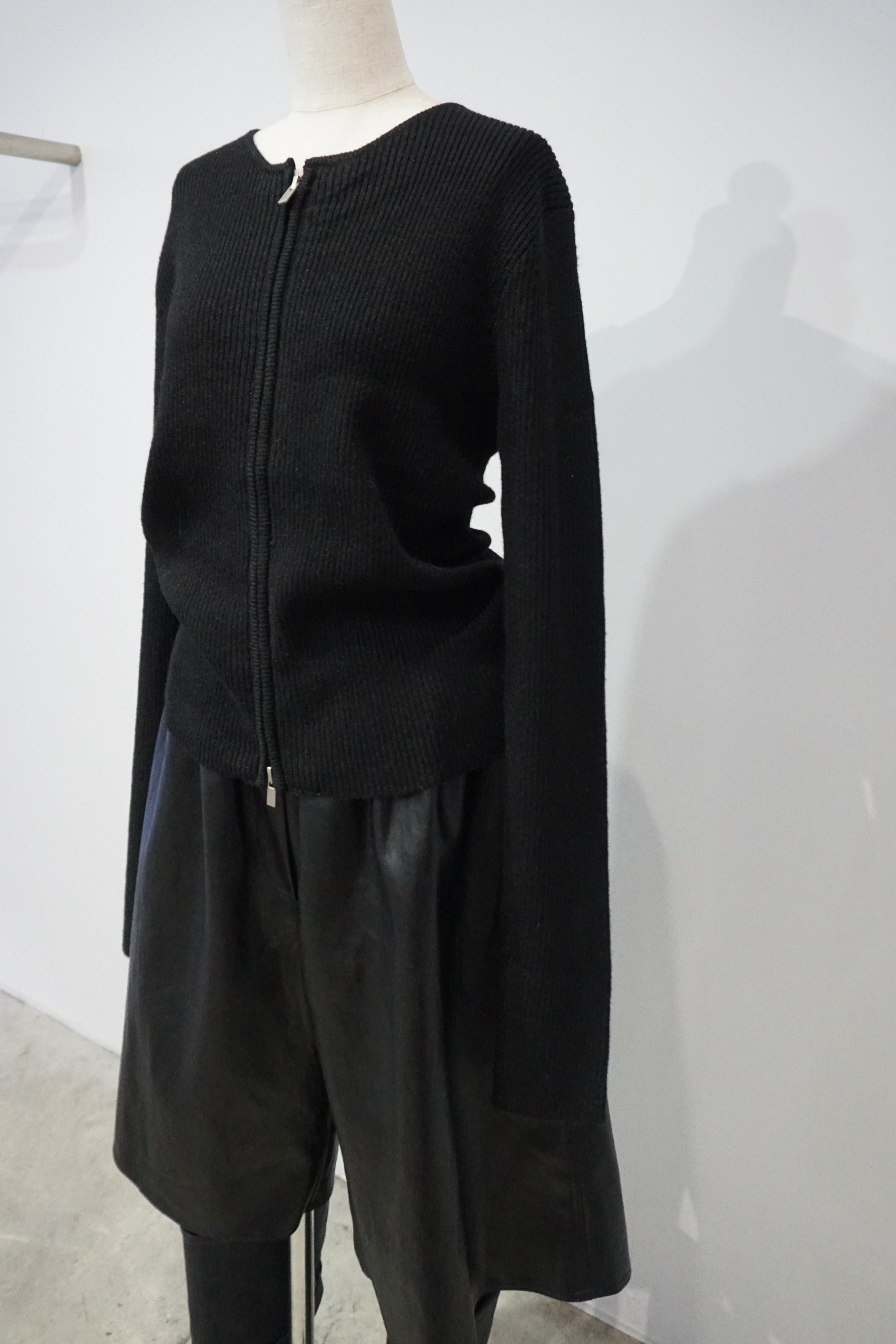 リブニット素材を使用した、ミニマルな印象のダブルジップニットカーディガン。