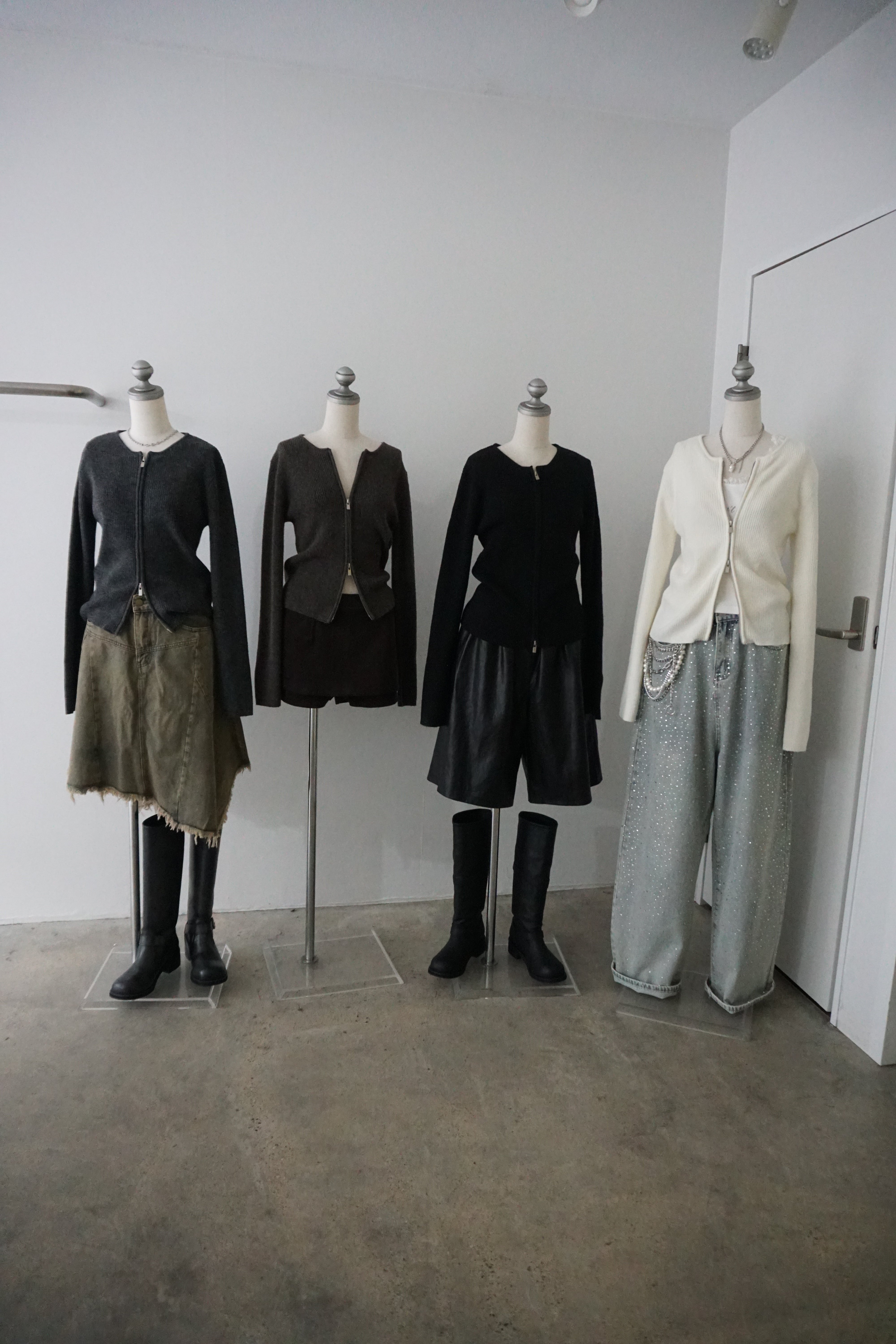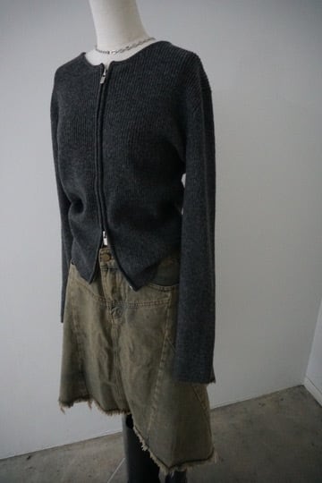 リブニット素材を使用した、ミニマルな印象のダブルジップニットカーディガン。
