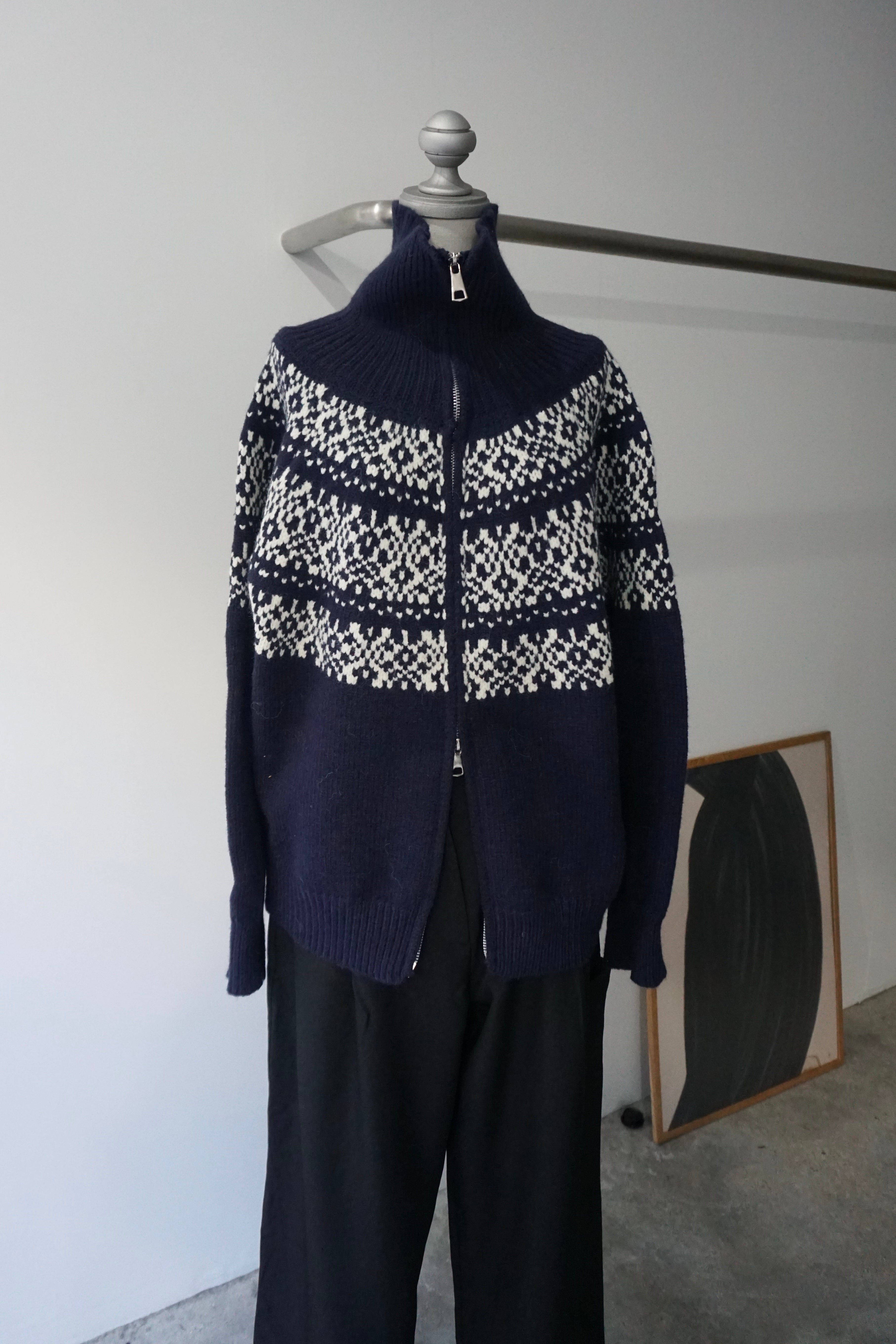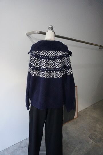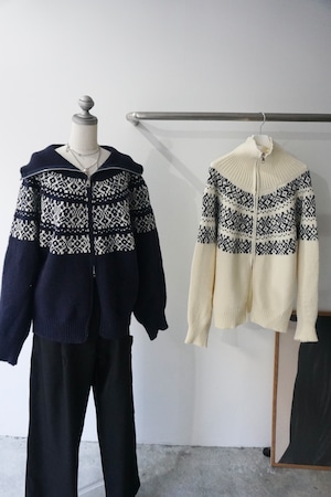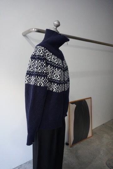 ノルディック柄を編み込んだジップ仕様のニットトップス。
