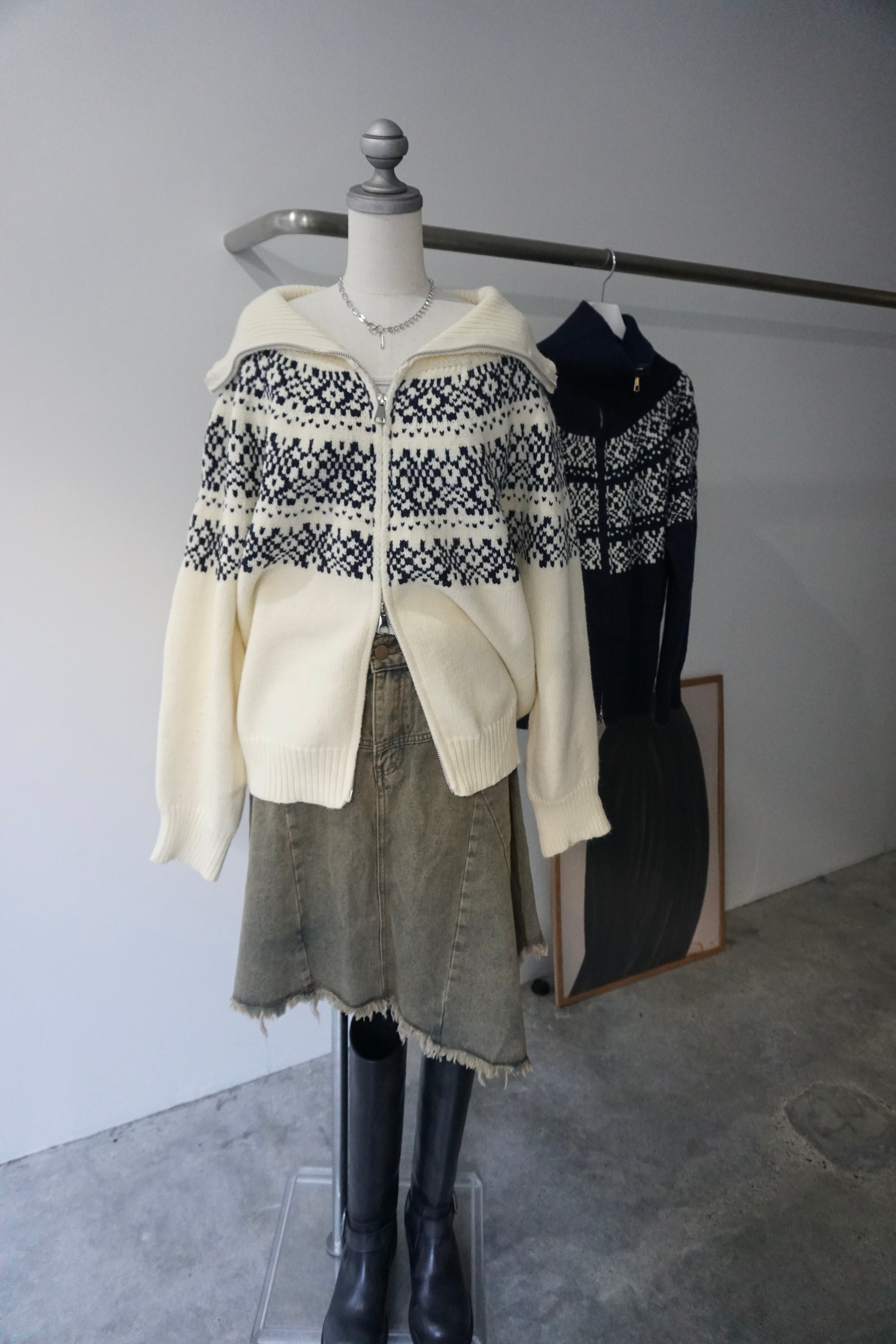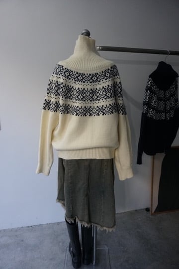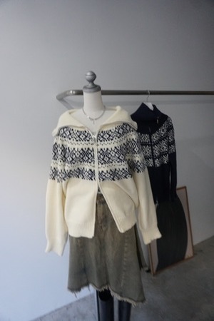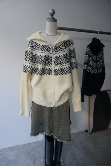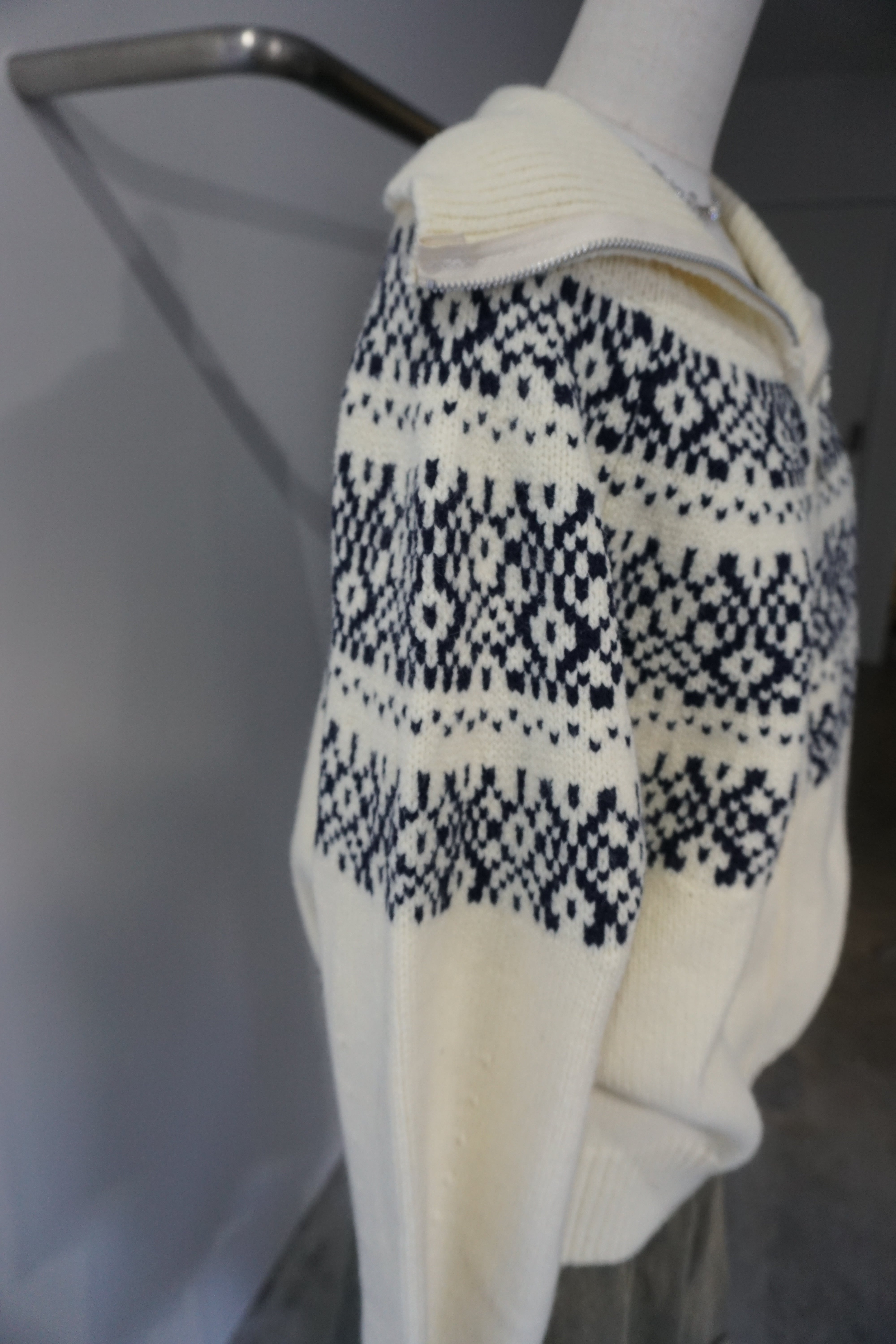 ノルディック柄を編み込んだジップ仕様のニットトップス。