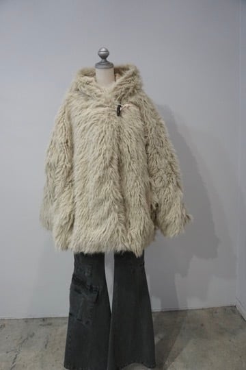 毛足のあるファー素材を使用した、フード付きコート。