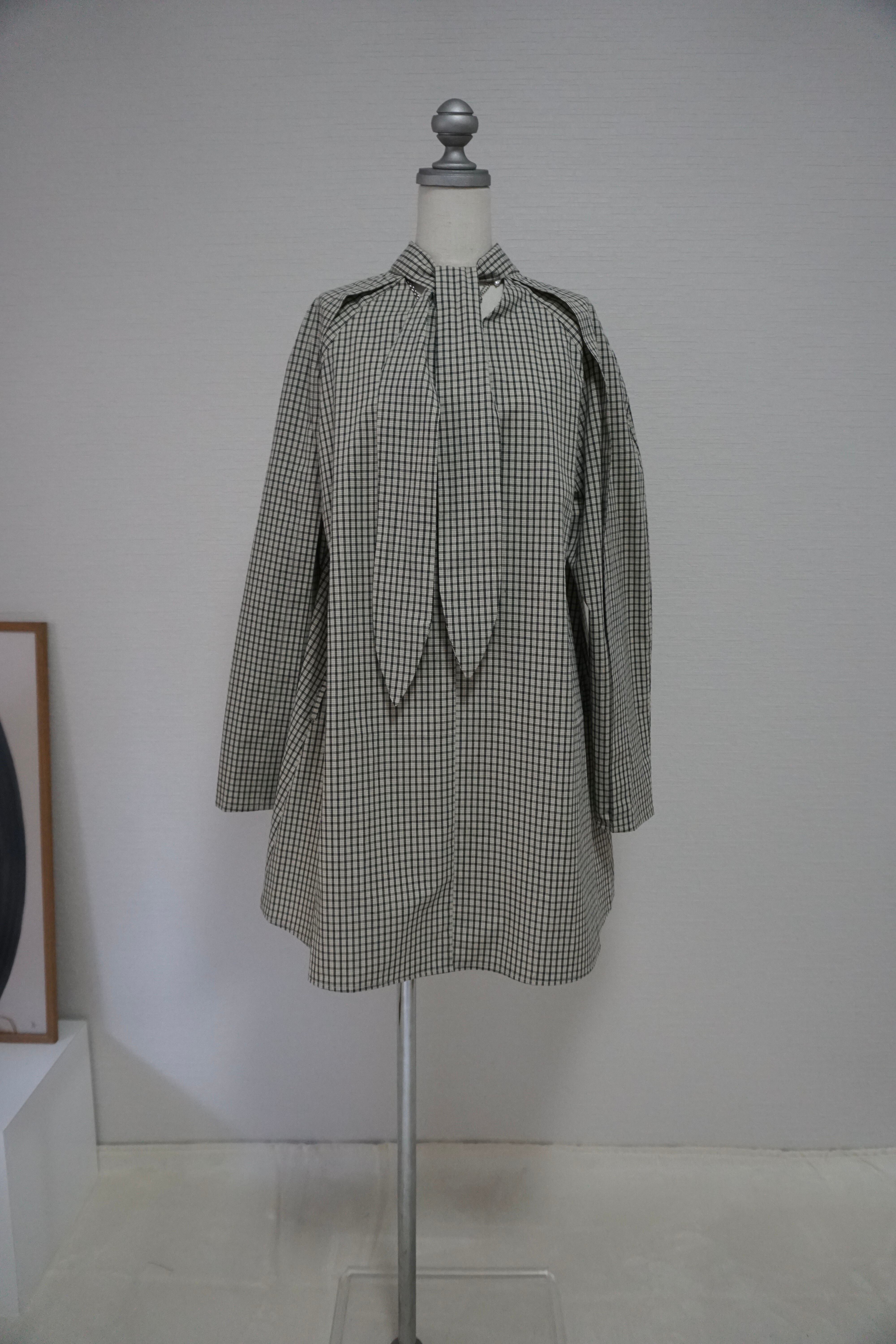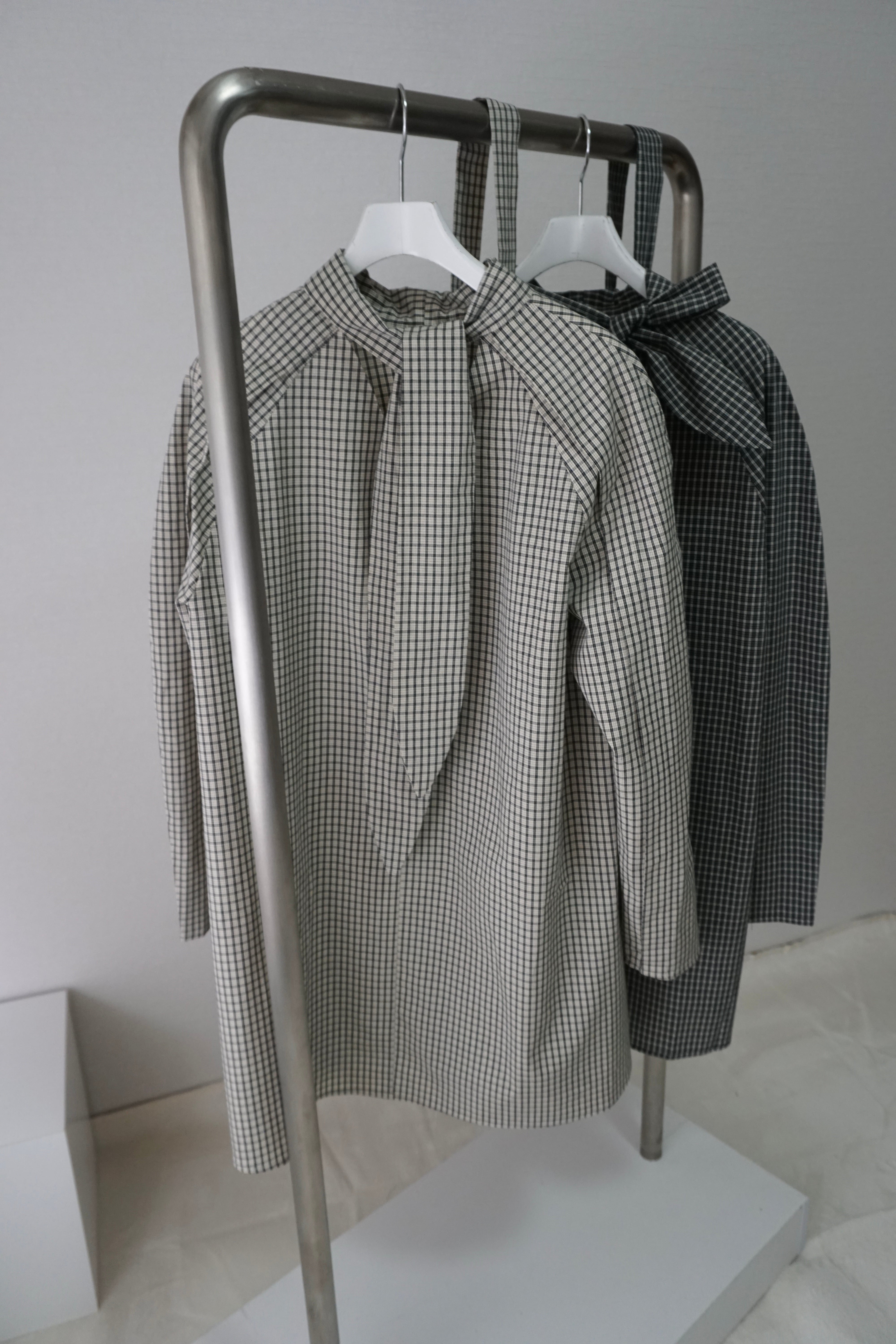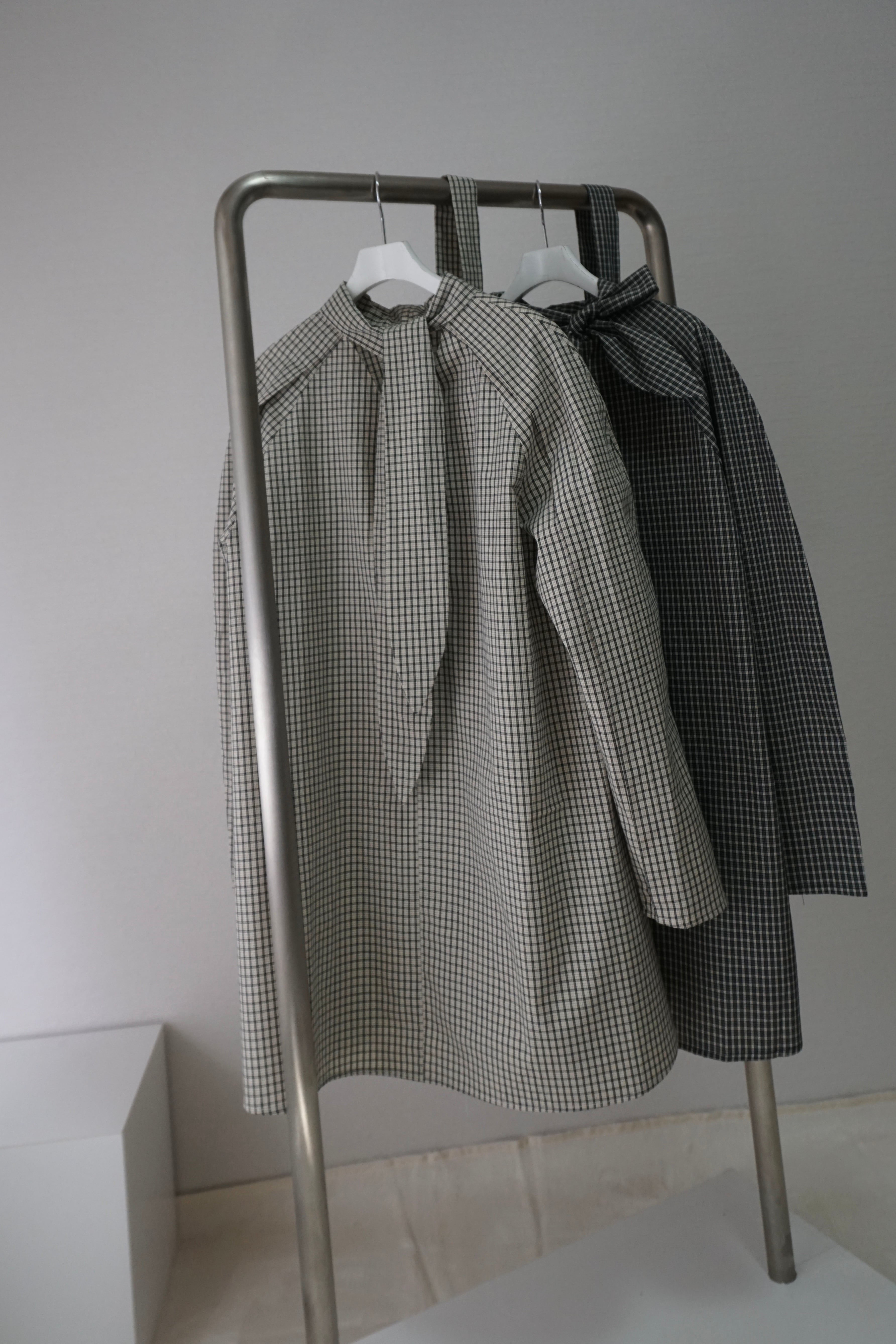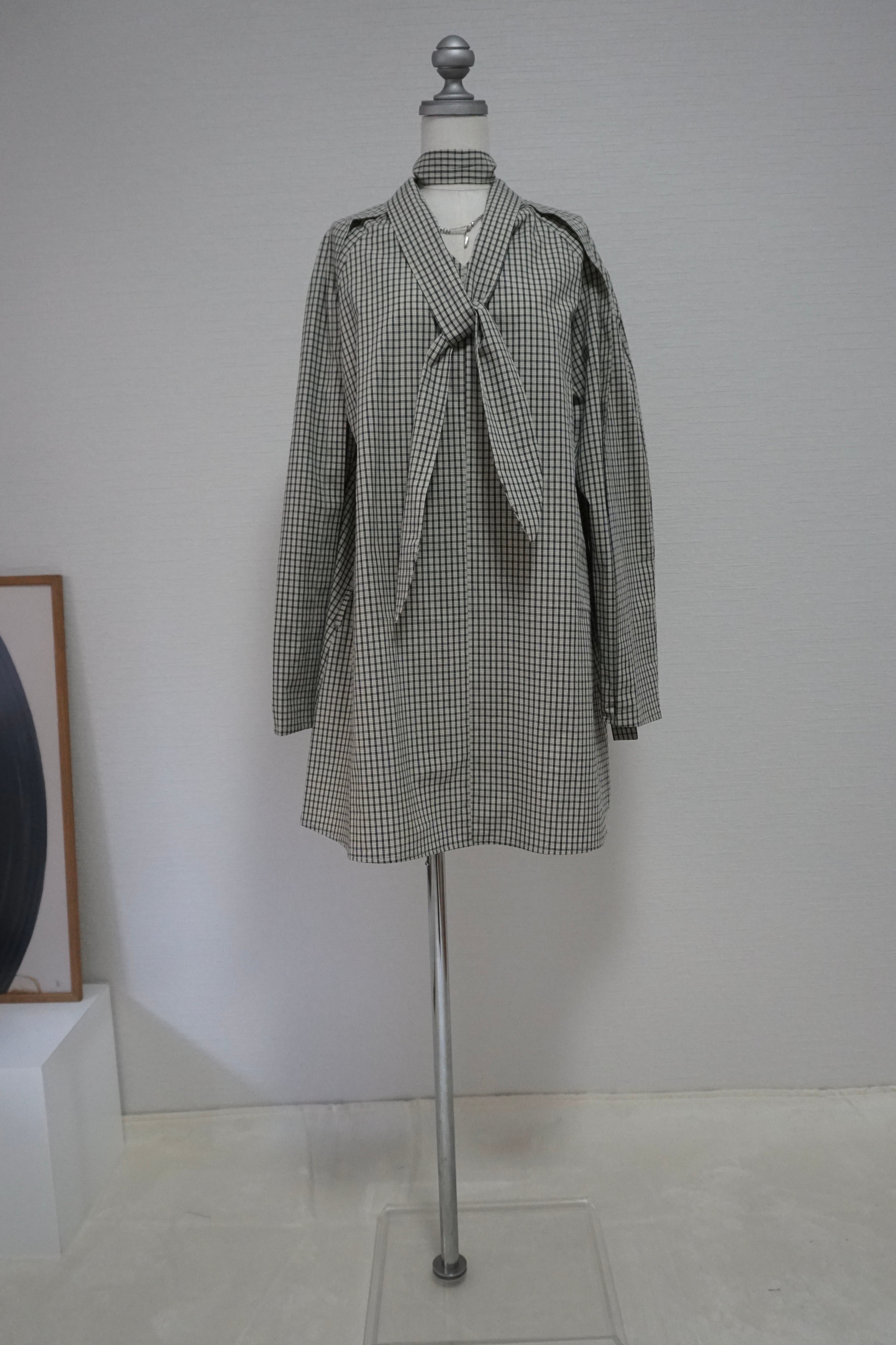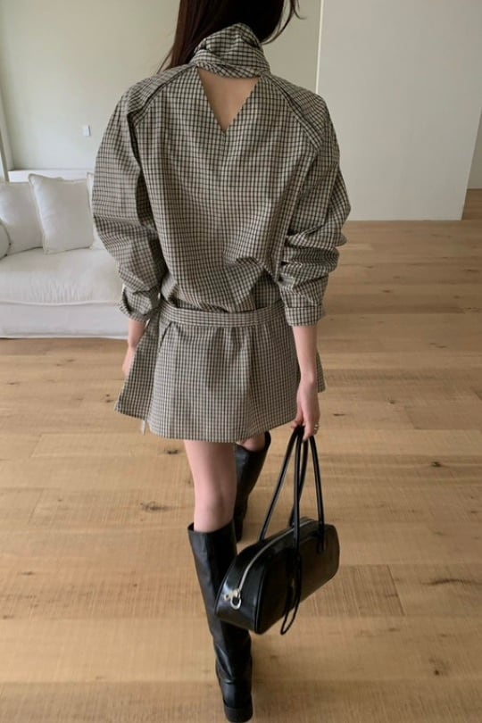 繊細なチェック柄に、長めのリボンディテールが印象的なミニドレス。