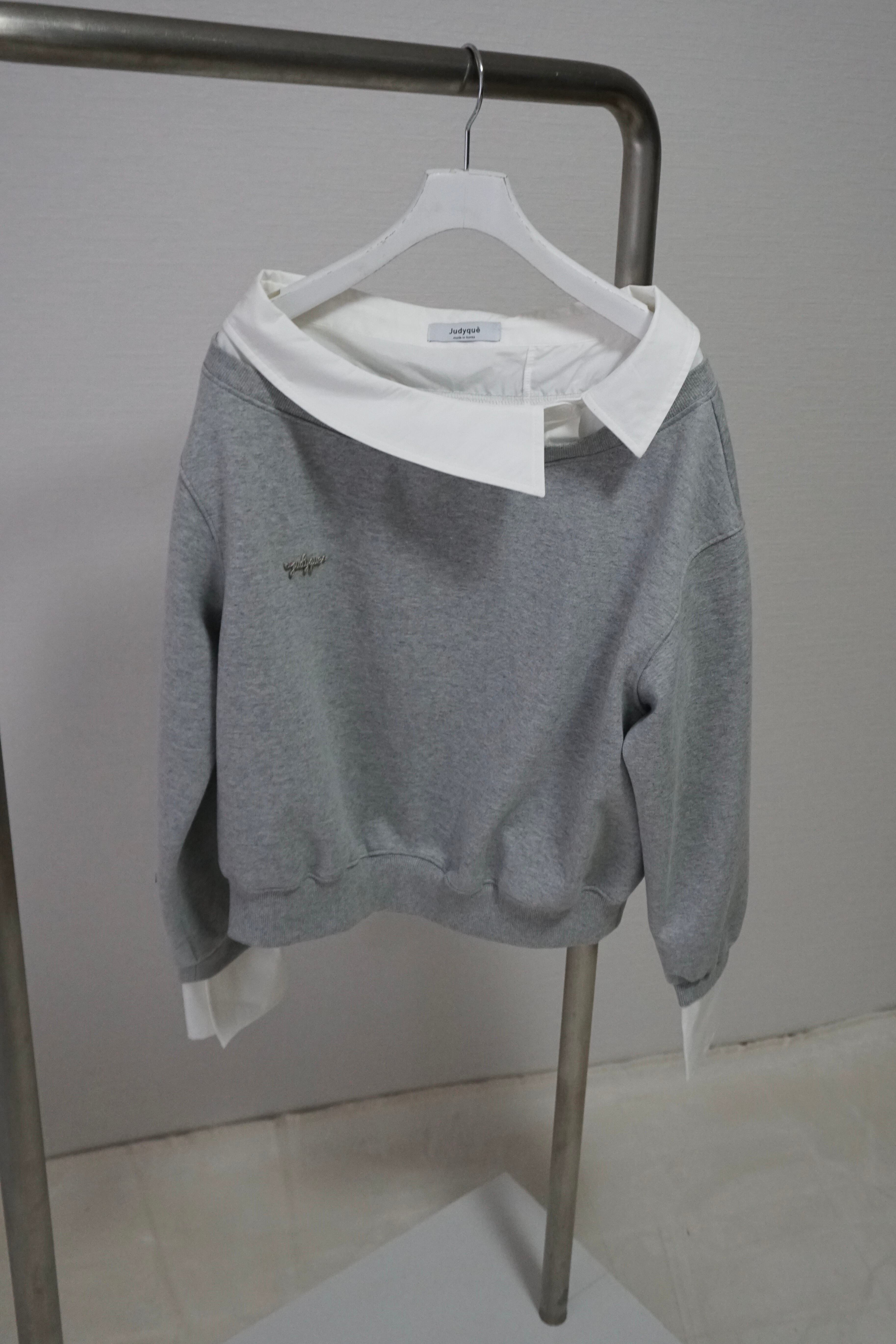 スウェットと布帛襟をドッキングしたオフショルダーデザイン。