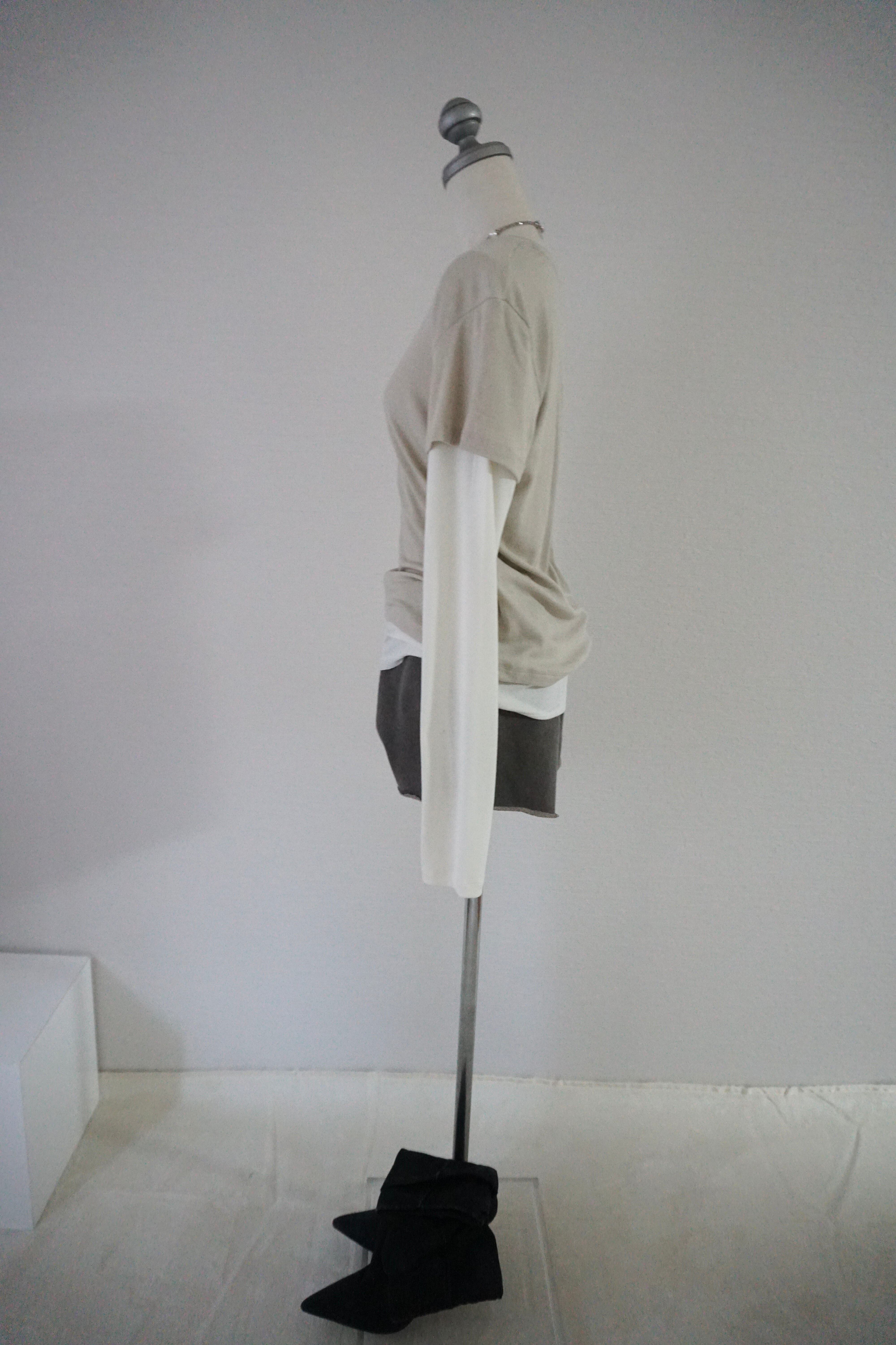 半袖トップスに、布帛見えするロングスリーブを重ねたデザインで、1枚でスタイリングが完成します。