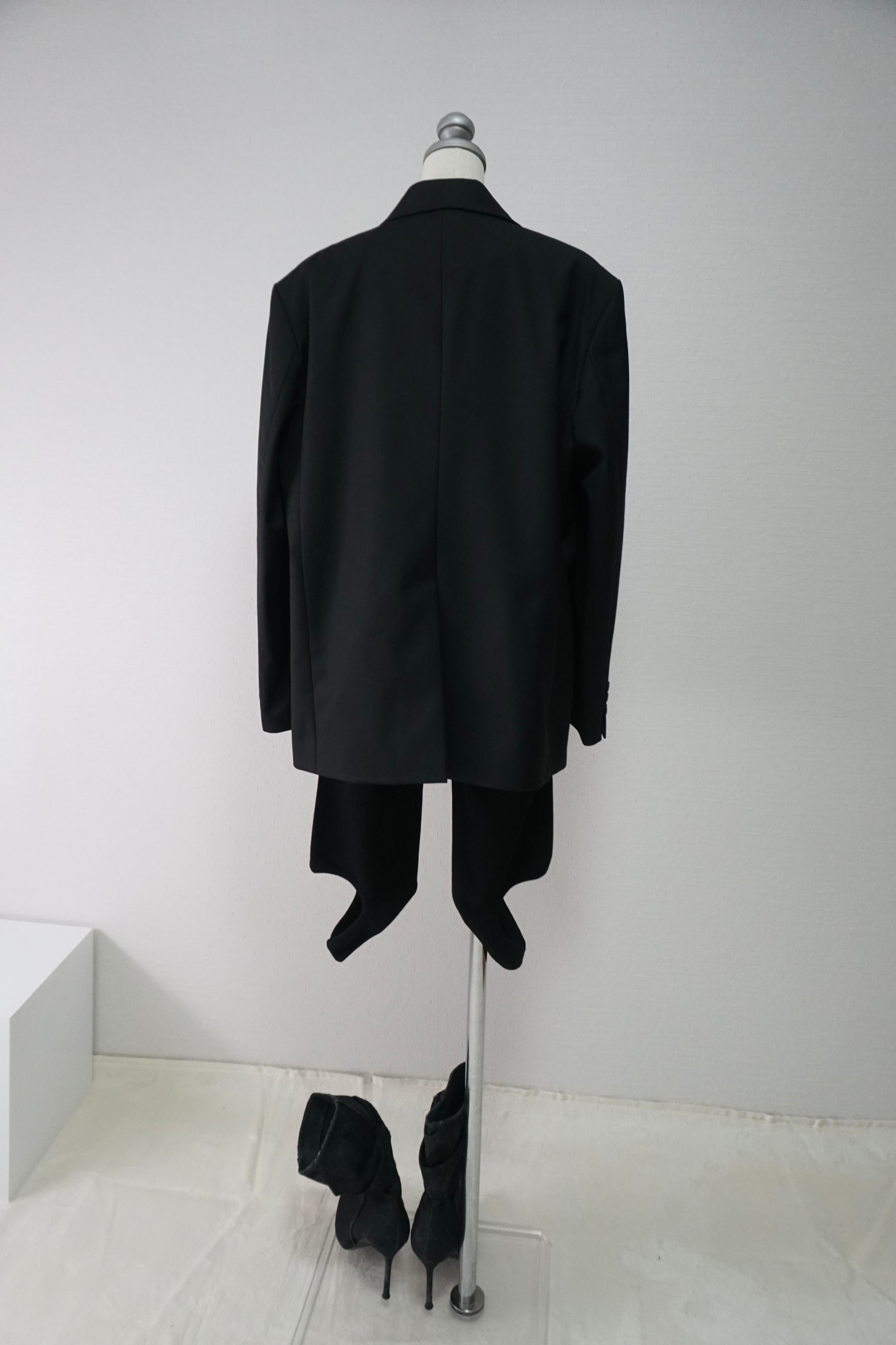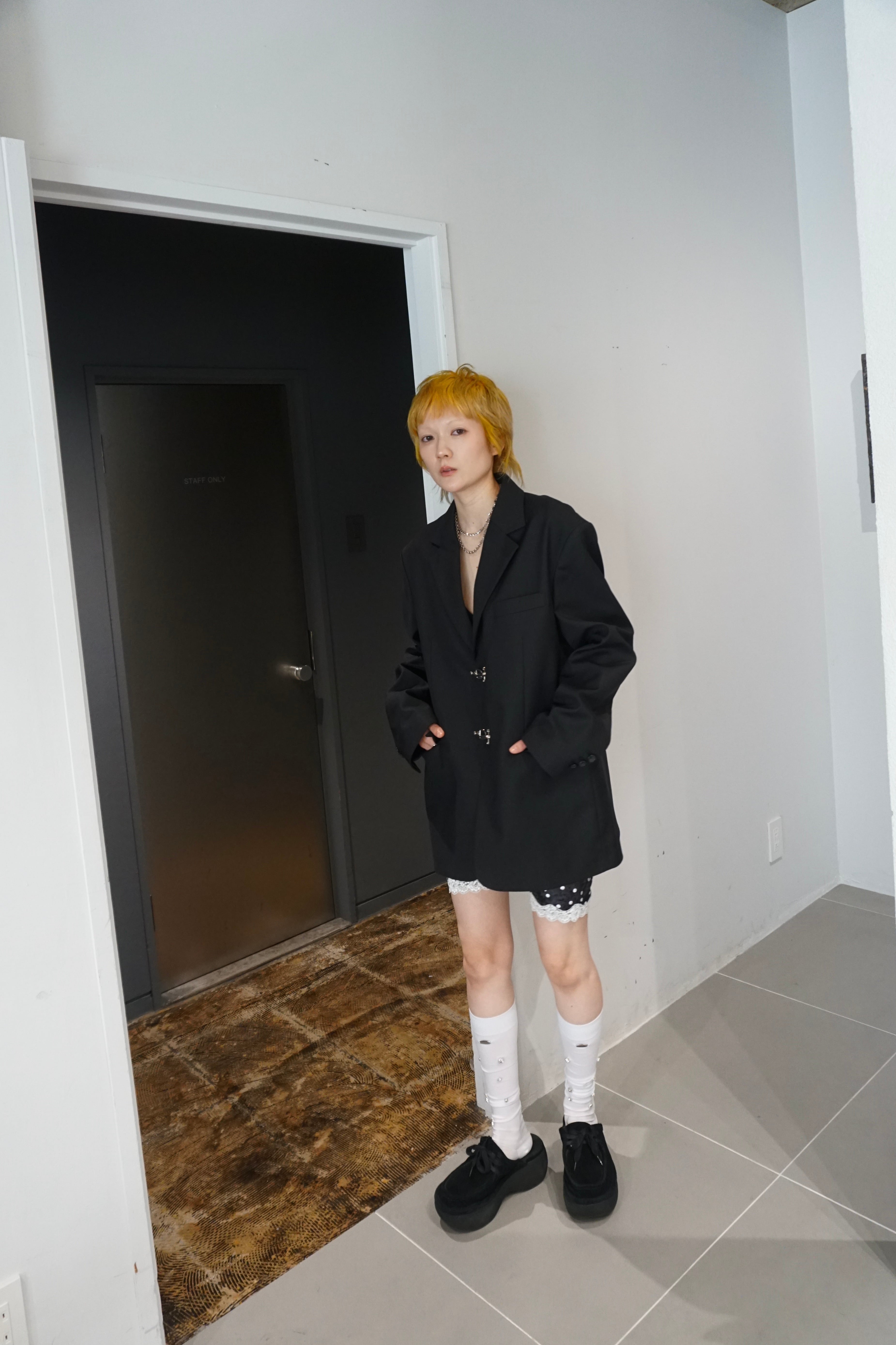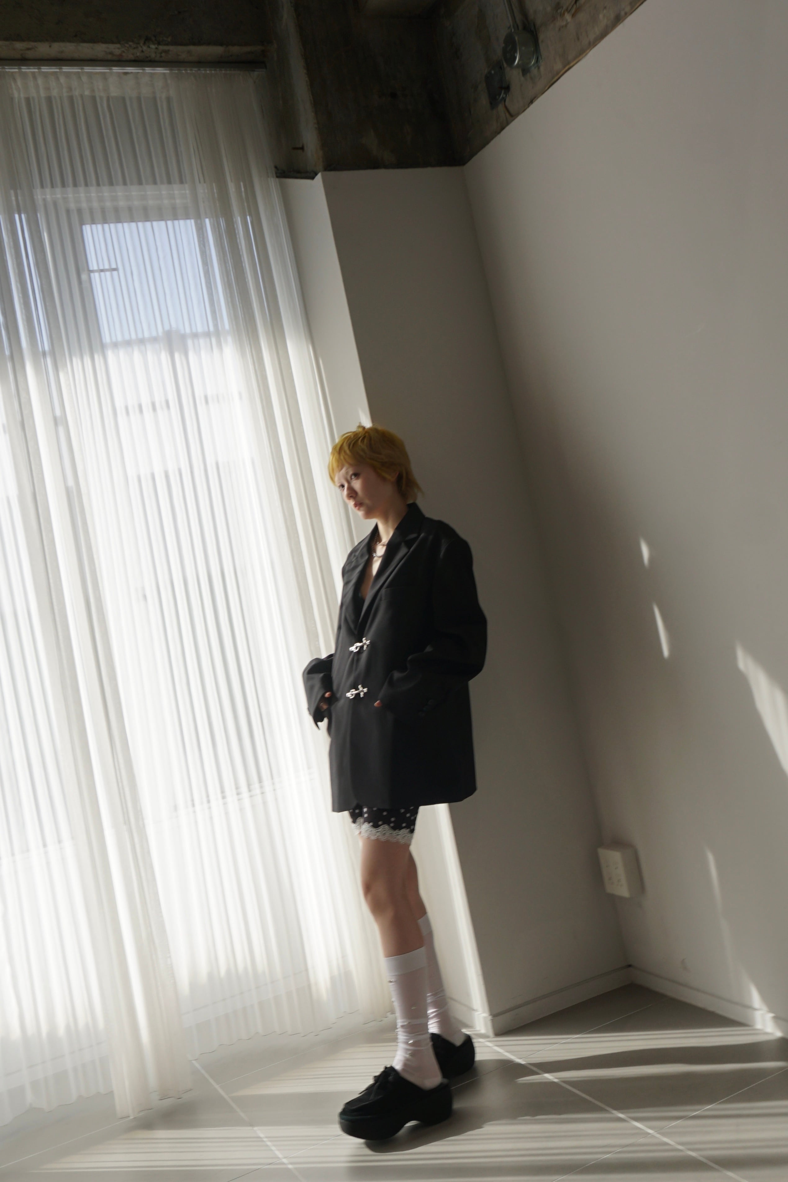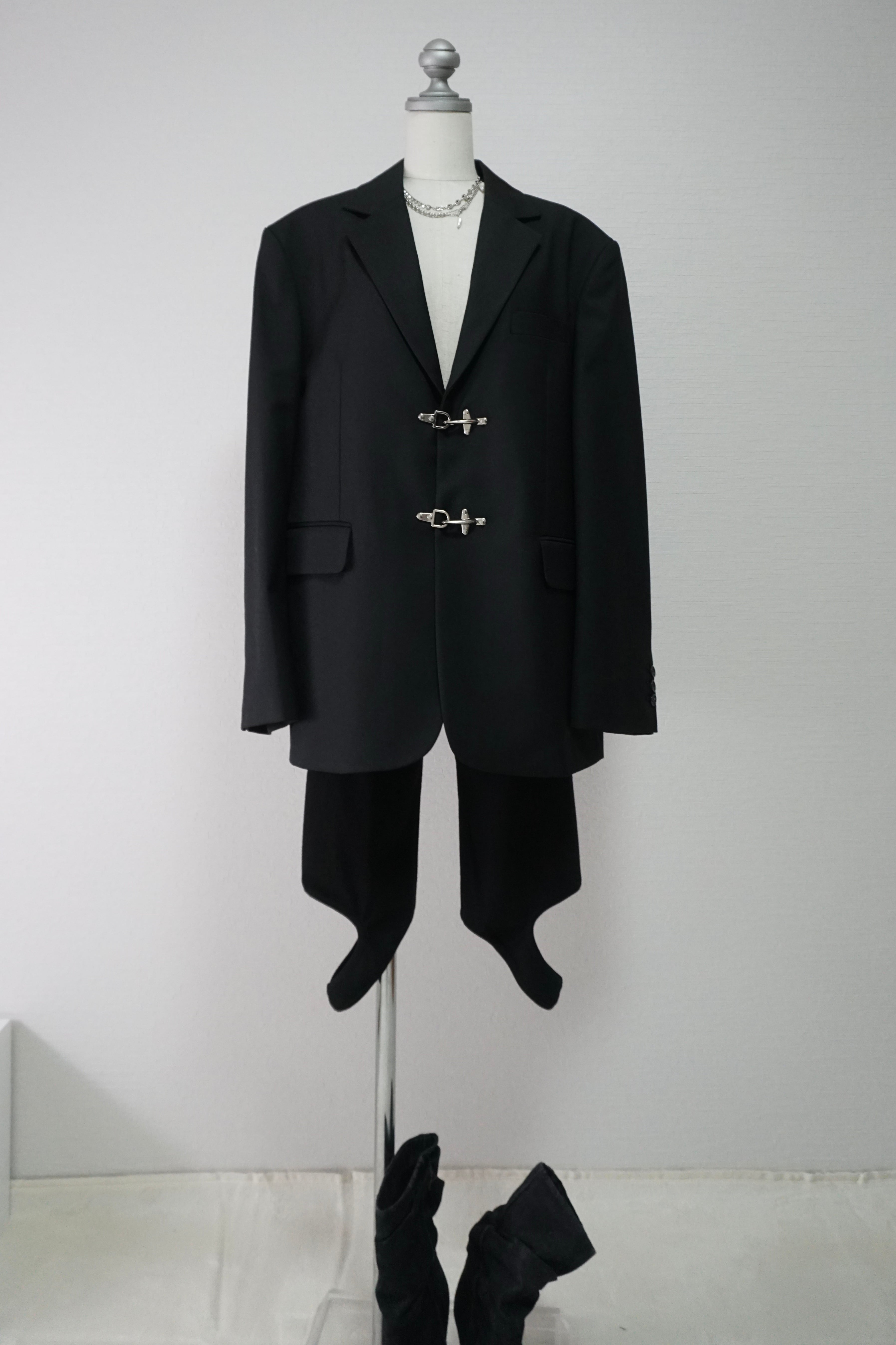フロントのメタルホックがアクセントになったテーラードジャケット。