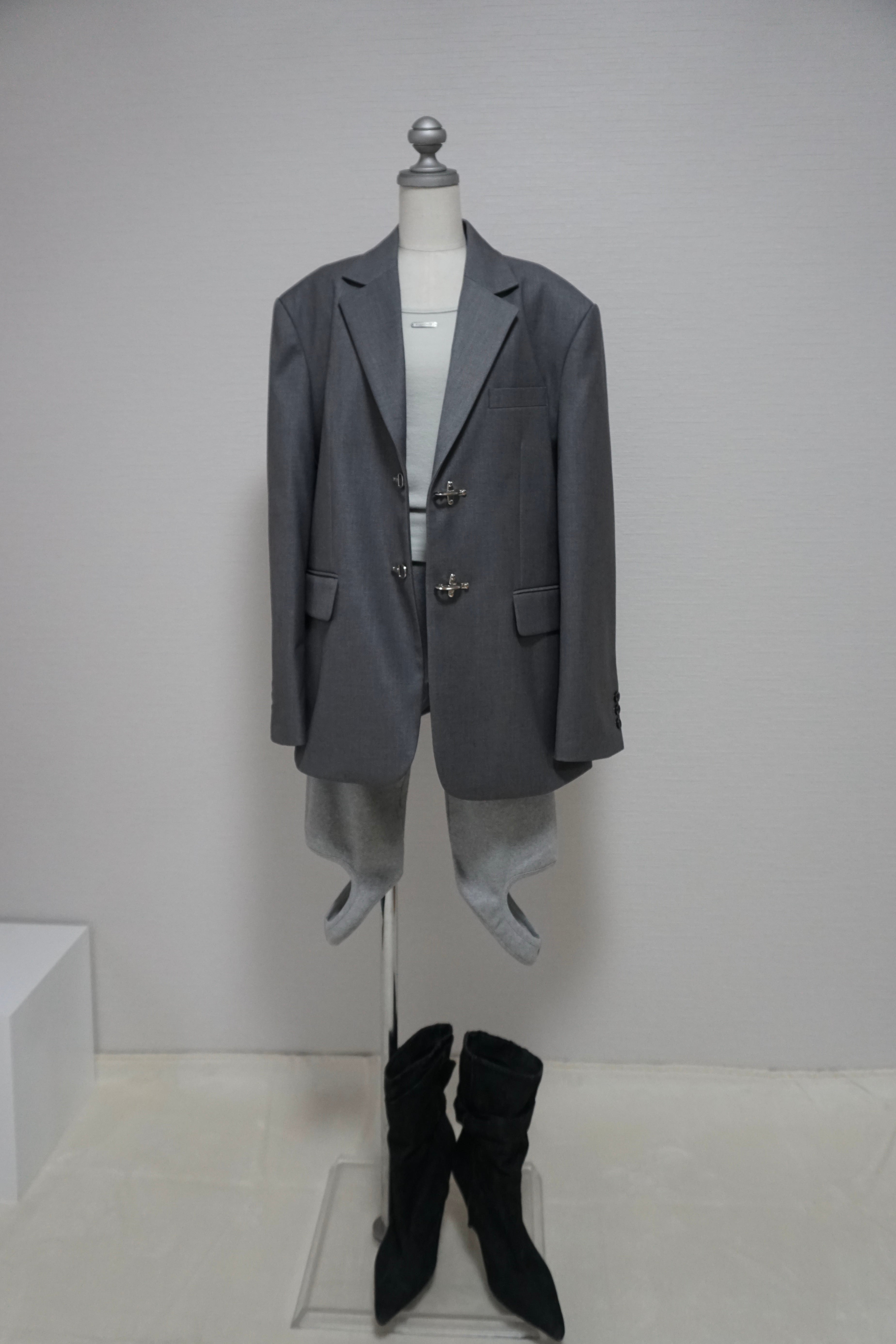 フロントのメタルホックがアクセントになったテーラードジャケット。