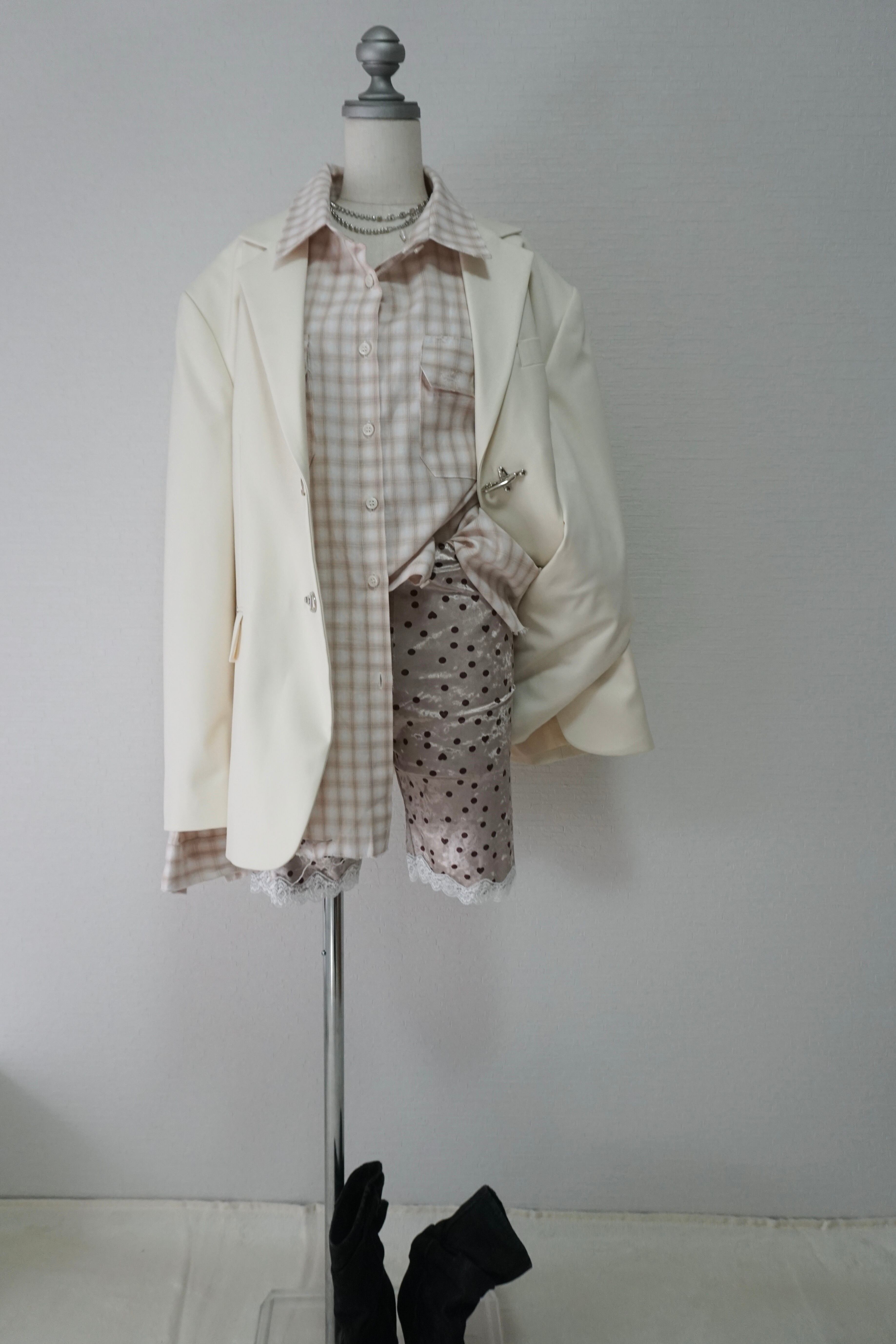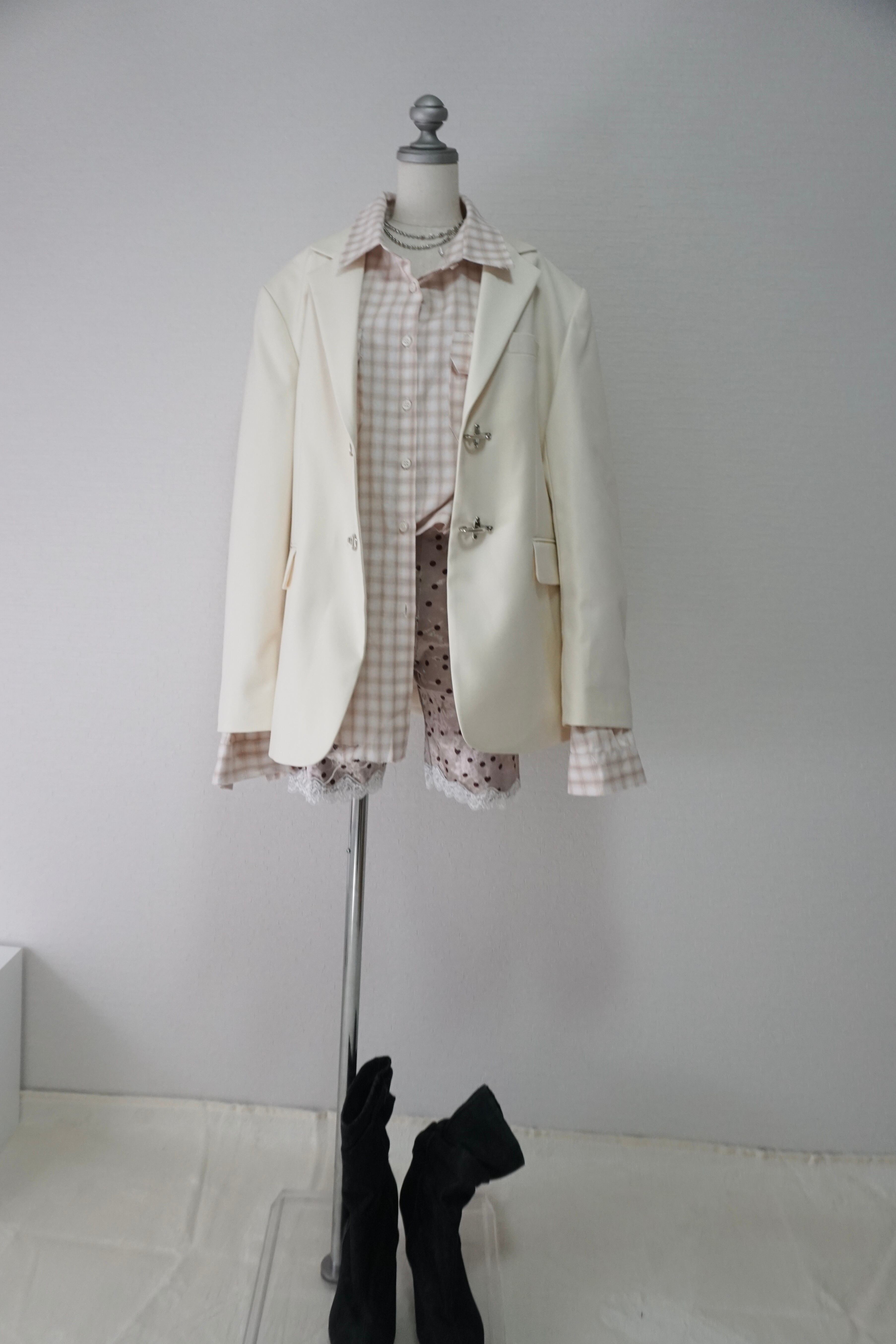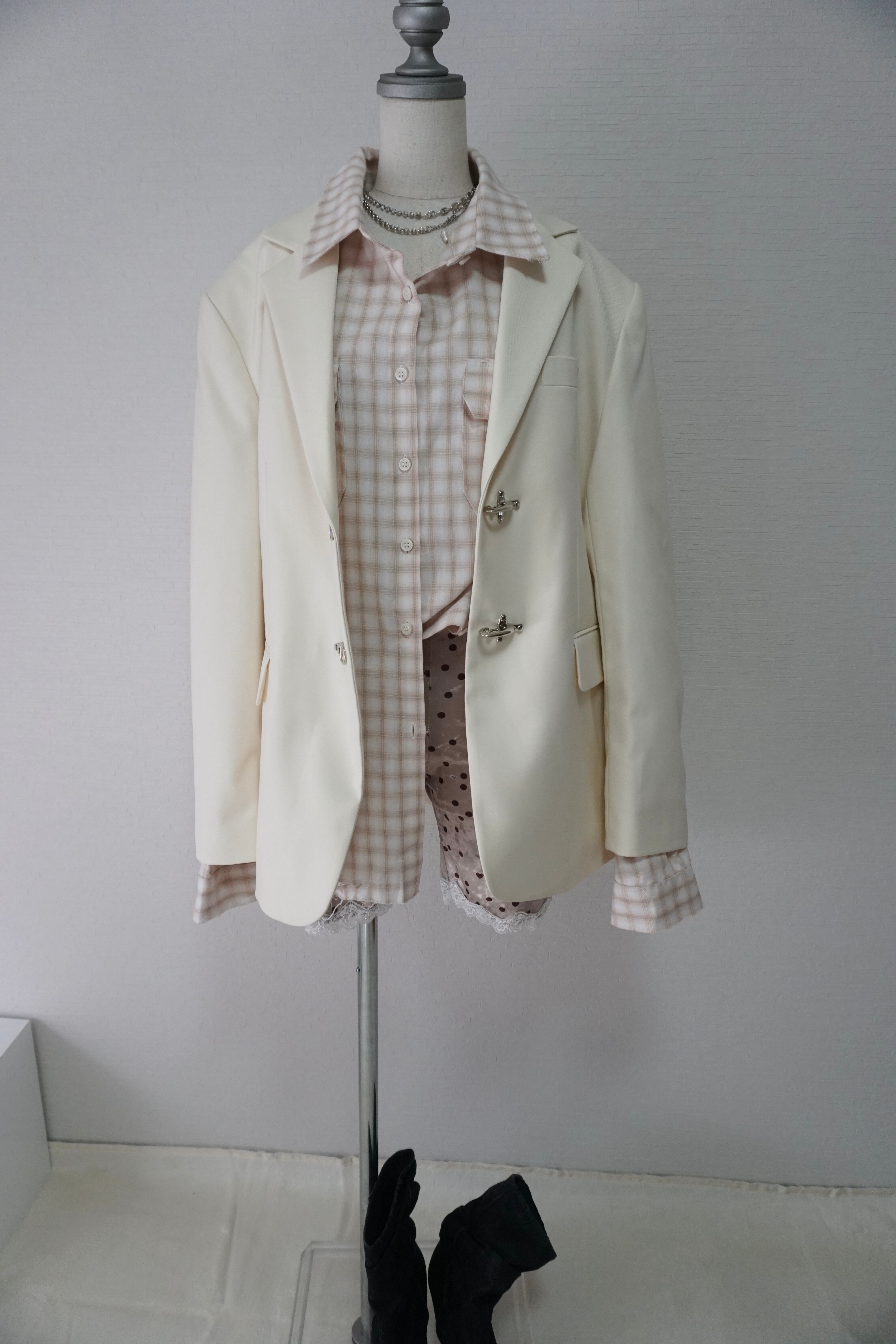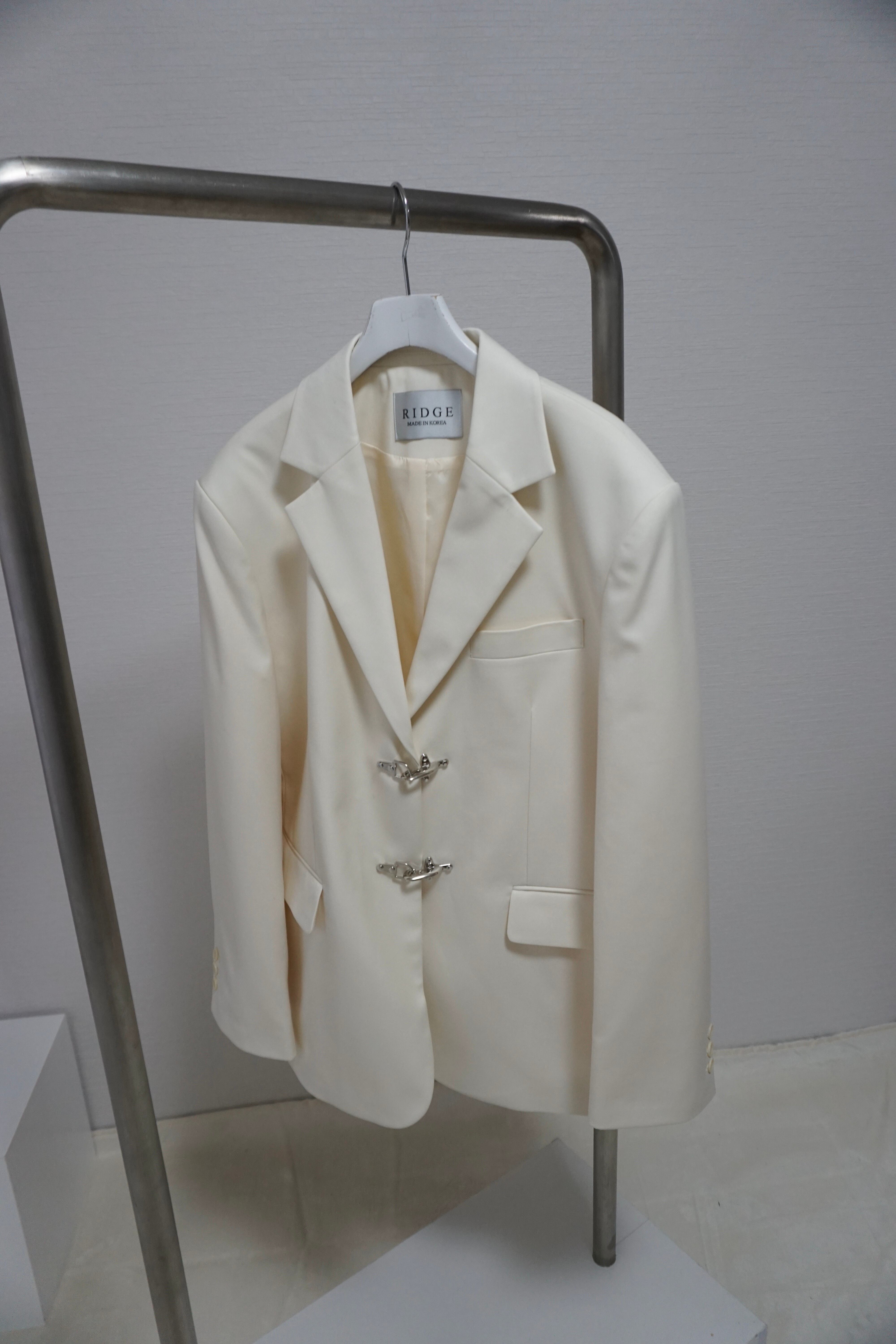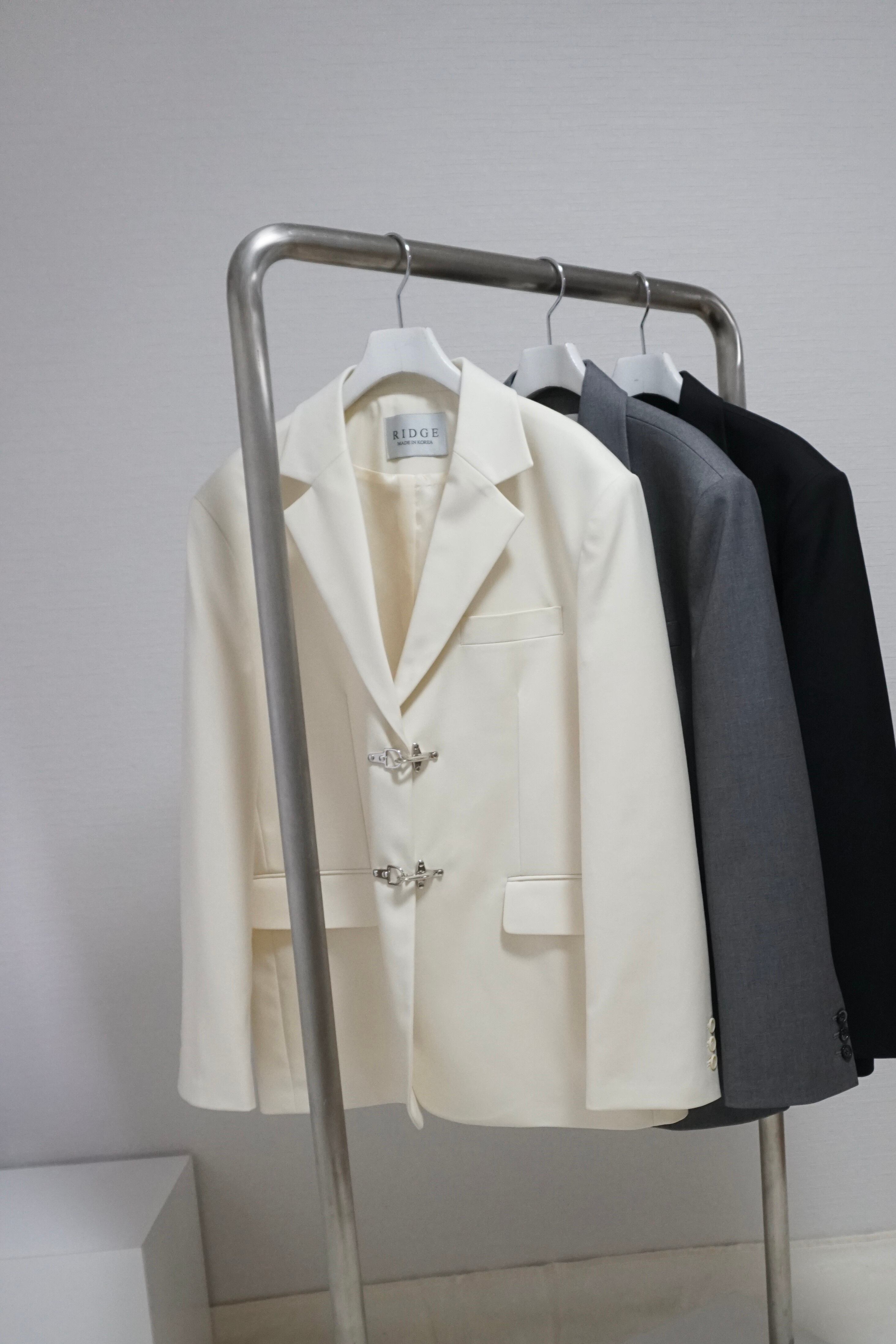 フロントのメタルホックがアクセントになったテーラードジャケット。