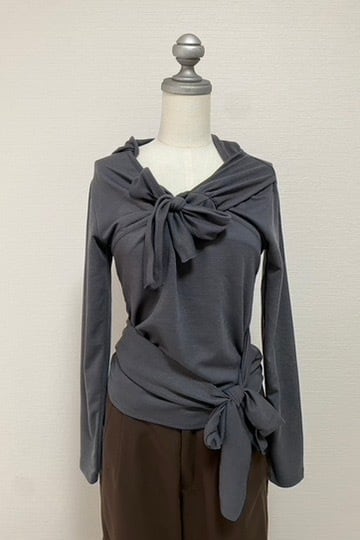 首元はスキッパーのように開いたデザインになっており、付属の長めのリボンを自分で結んでアレンジできる仕様。
