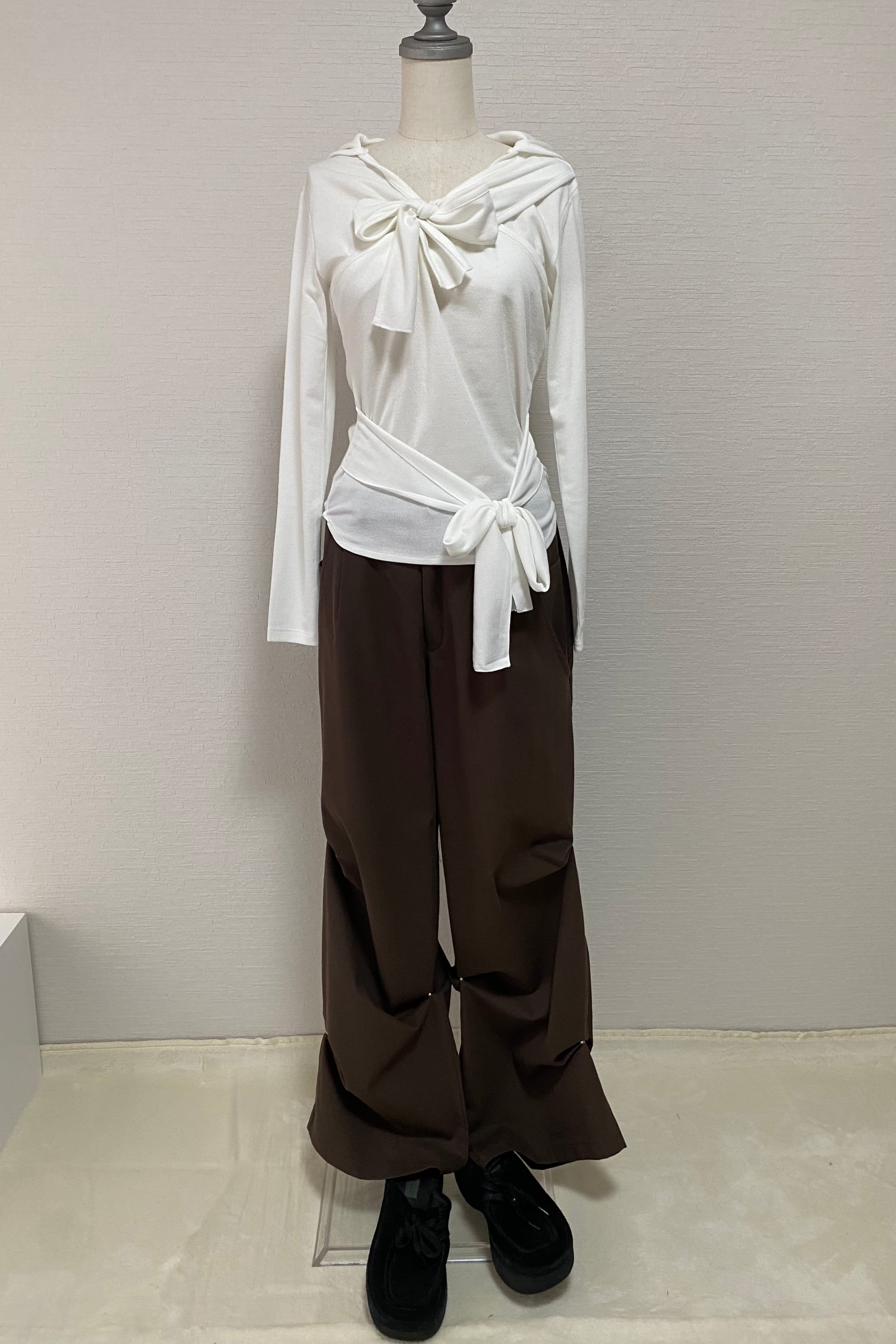 立体的なシルエットが特徴のデザインワイドパンツ。