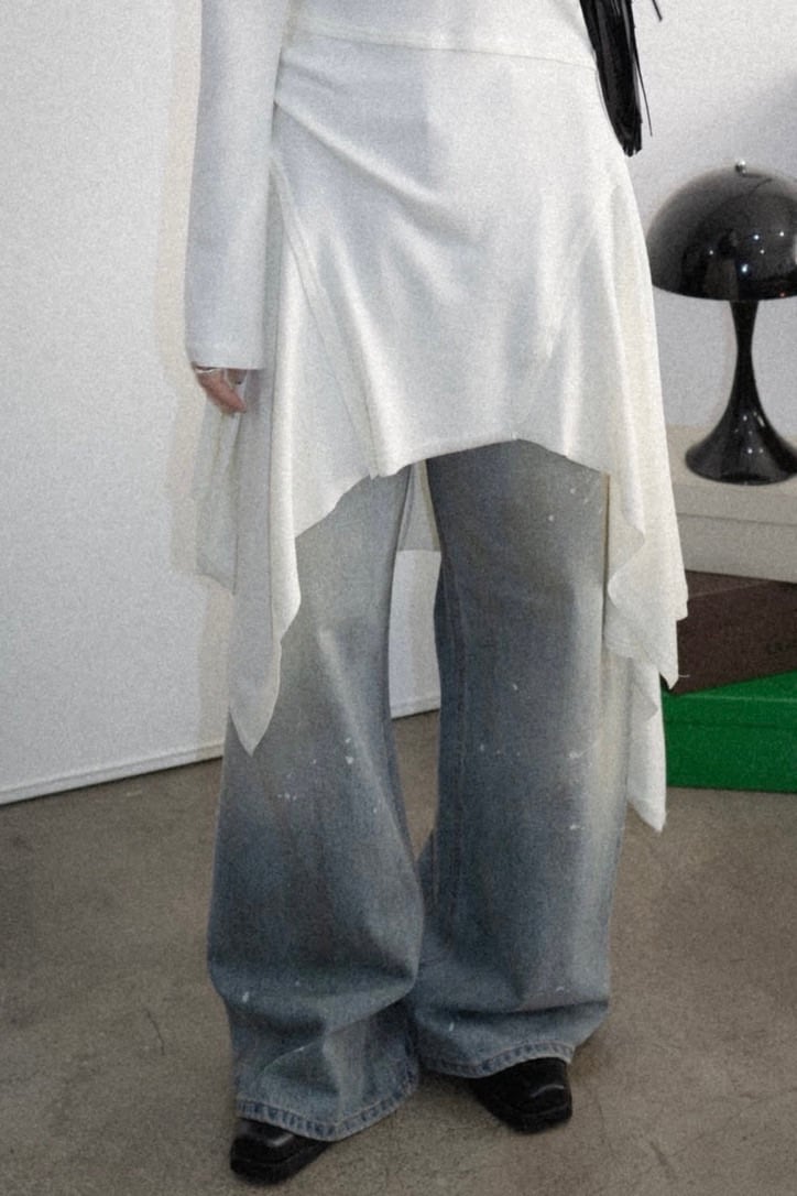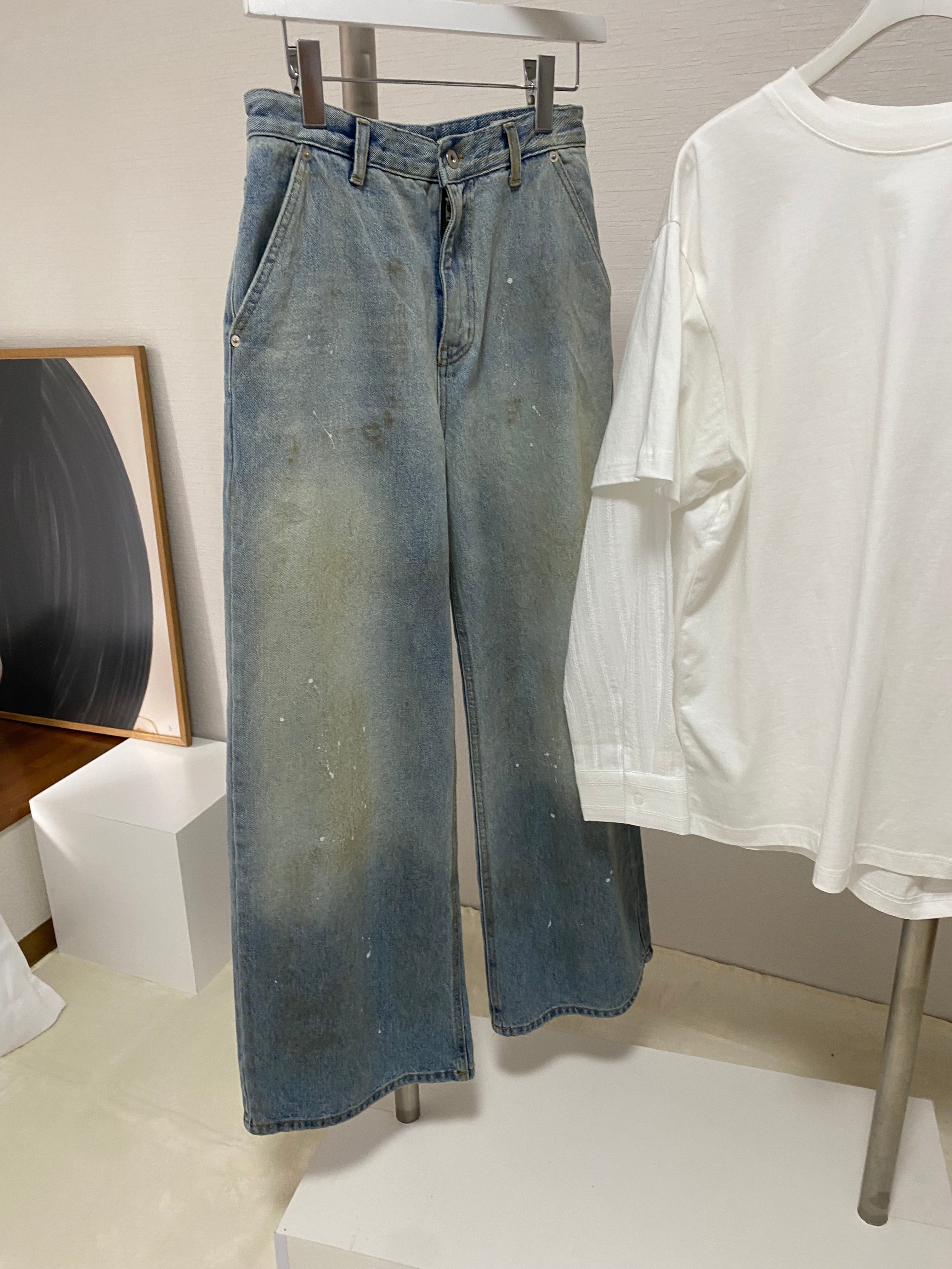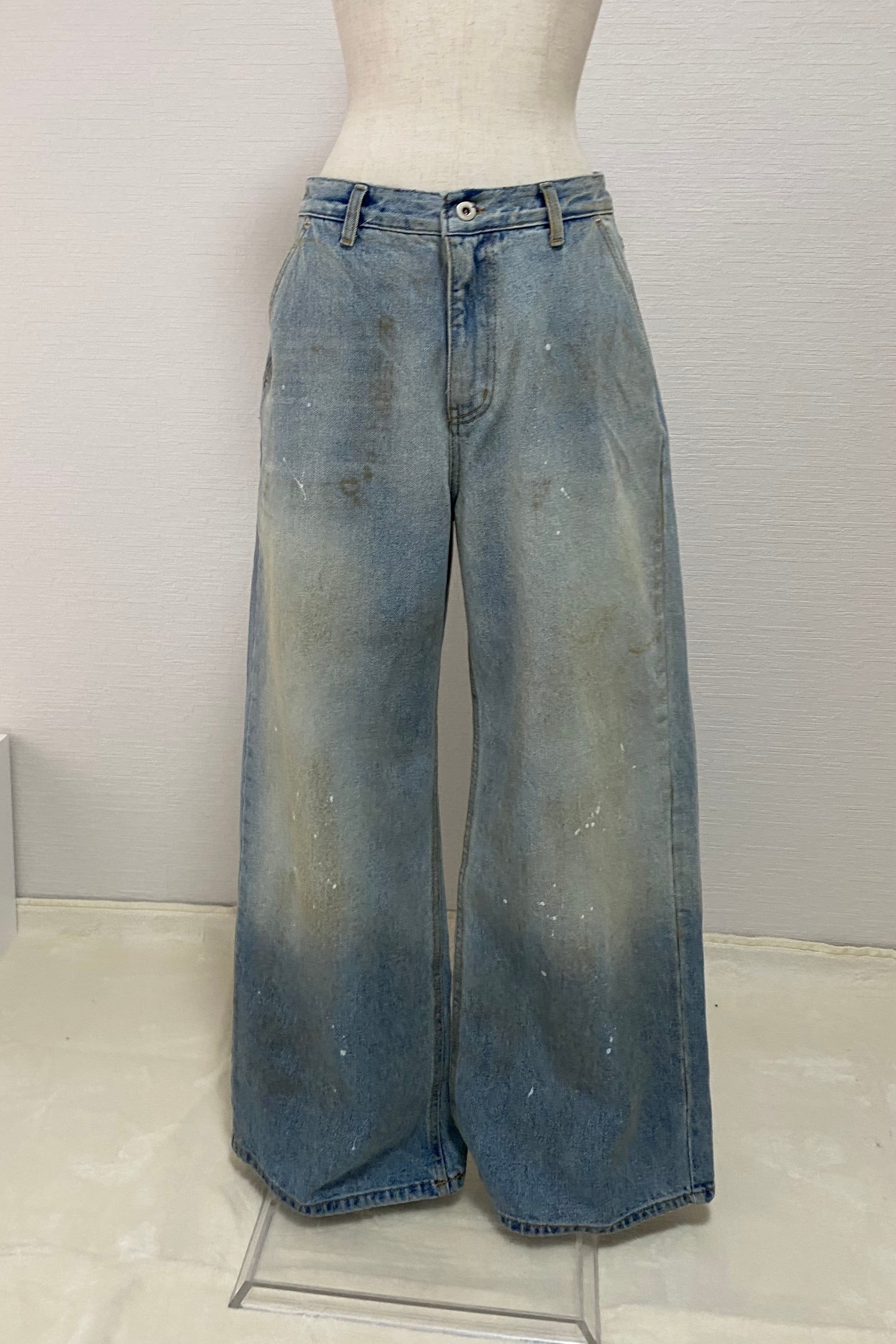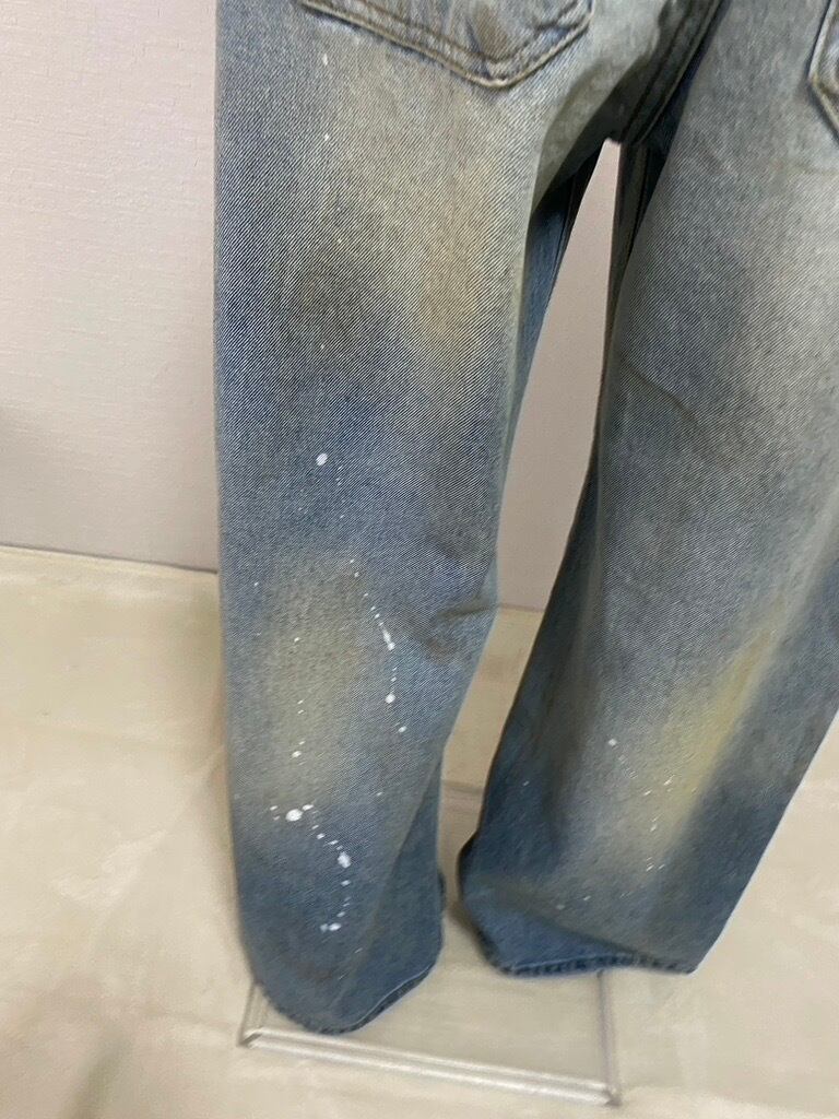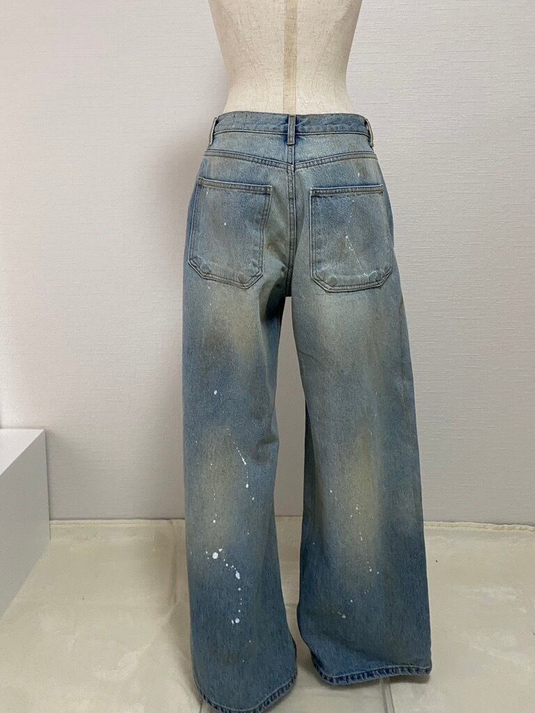 全体に入ったペイントデザインと色落ち加工が特徴で、履くだけで雰囲気の出る一本。