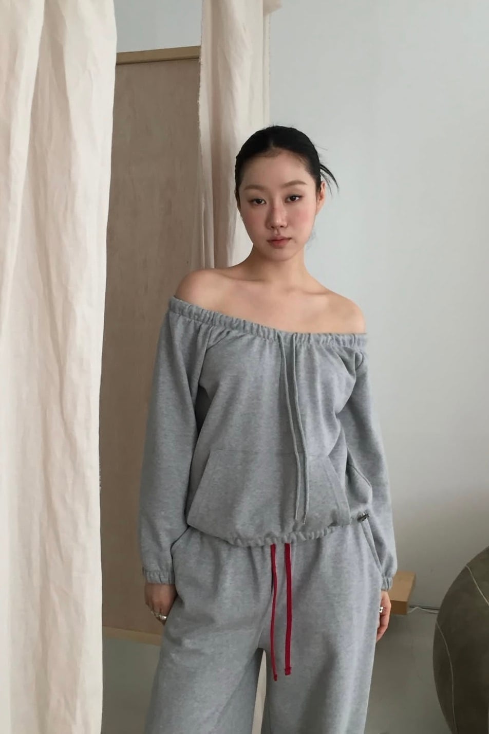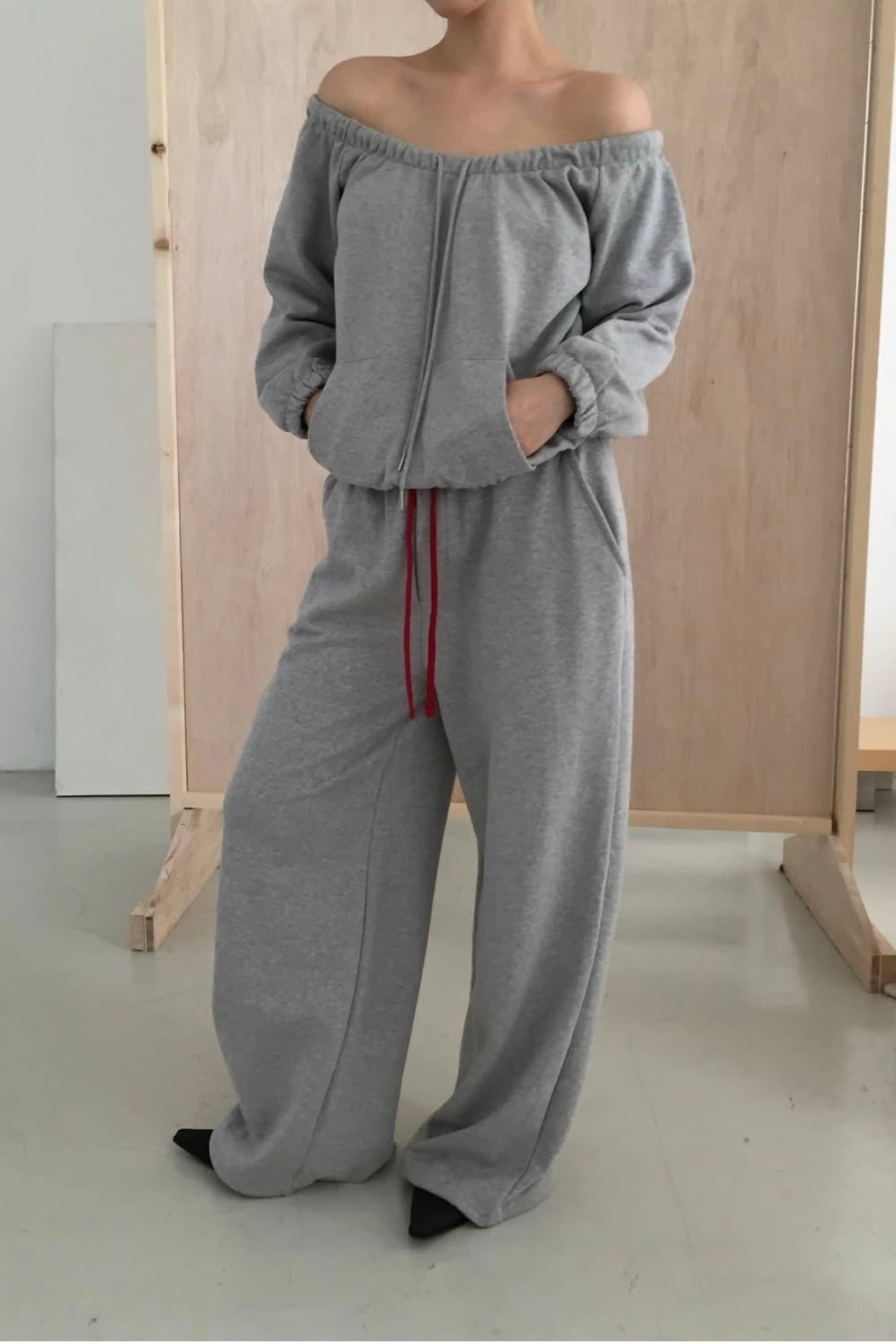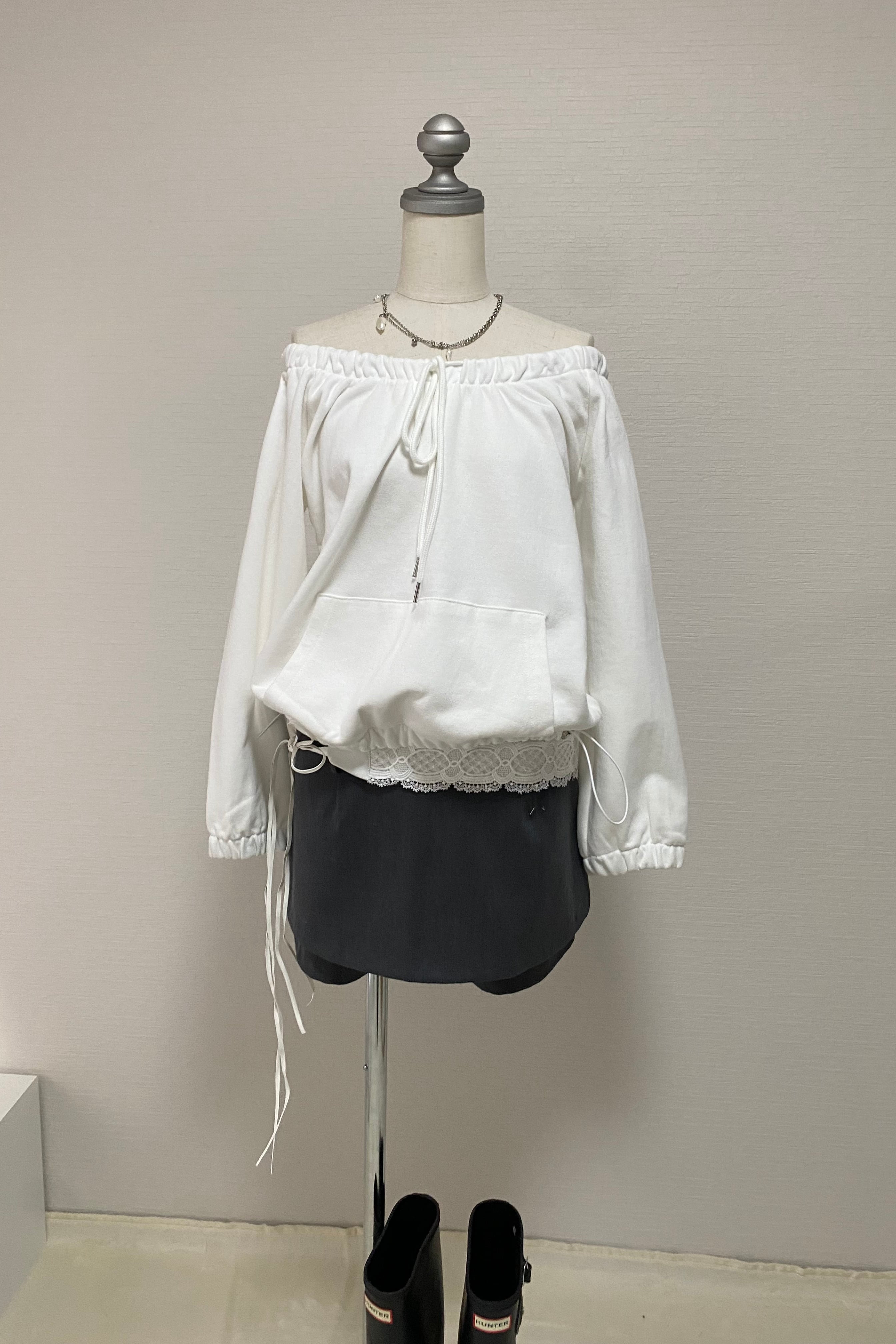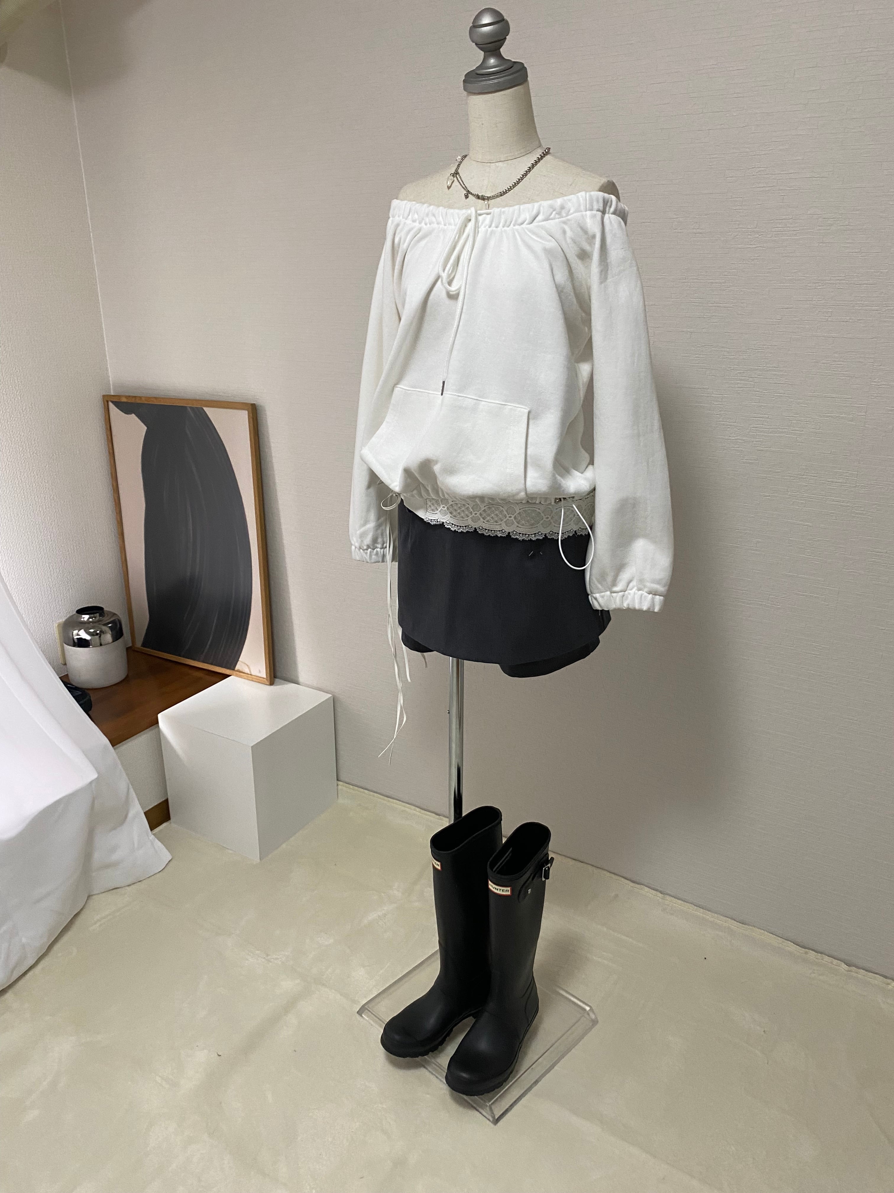 ライトスウェット素材を使用したオフショルダートップス。