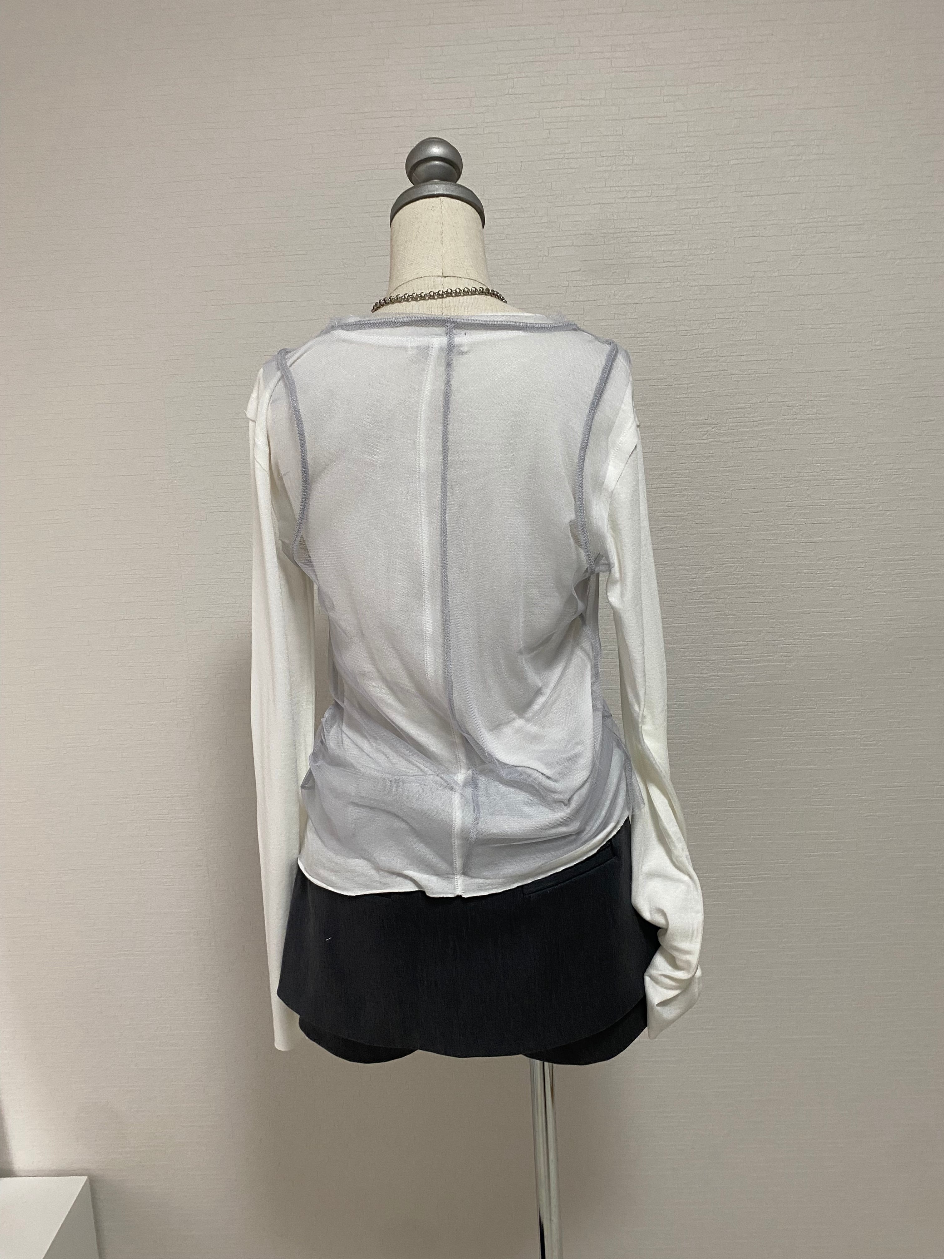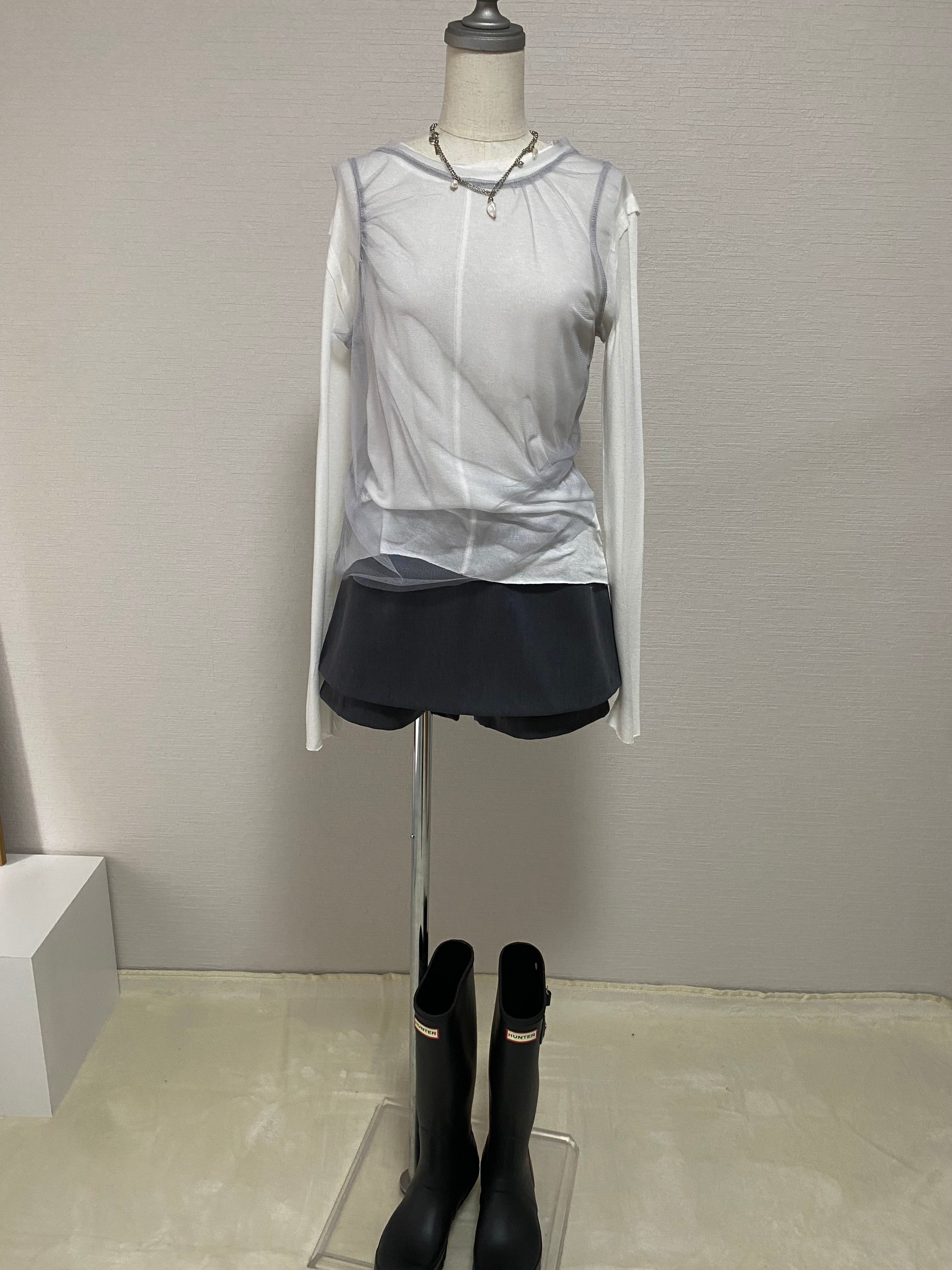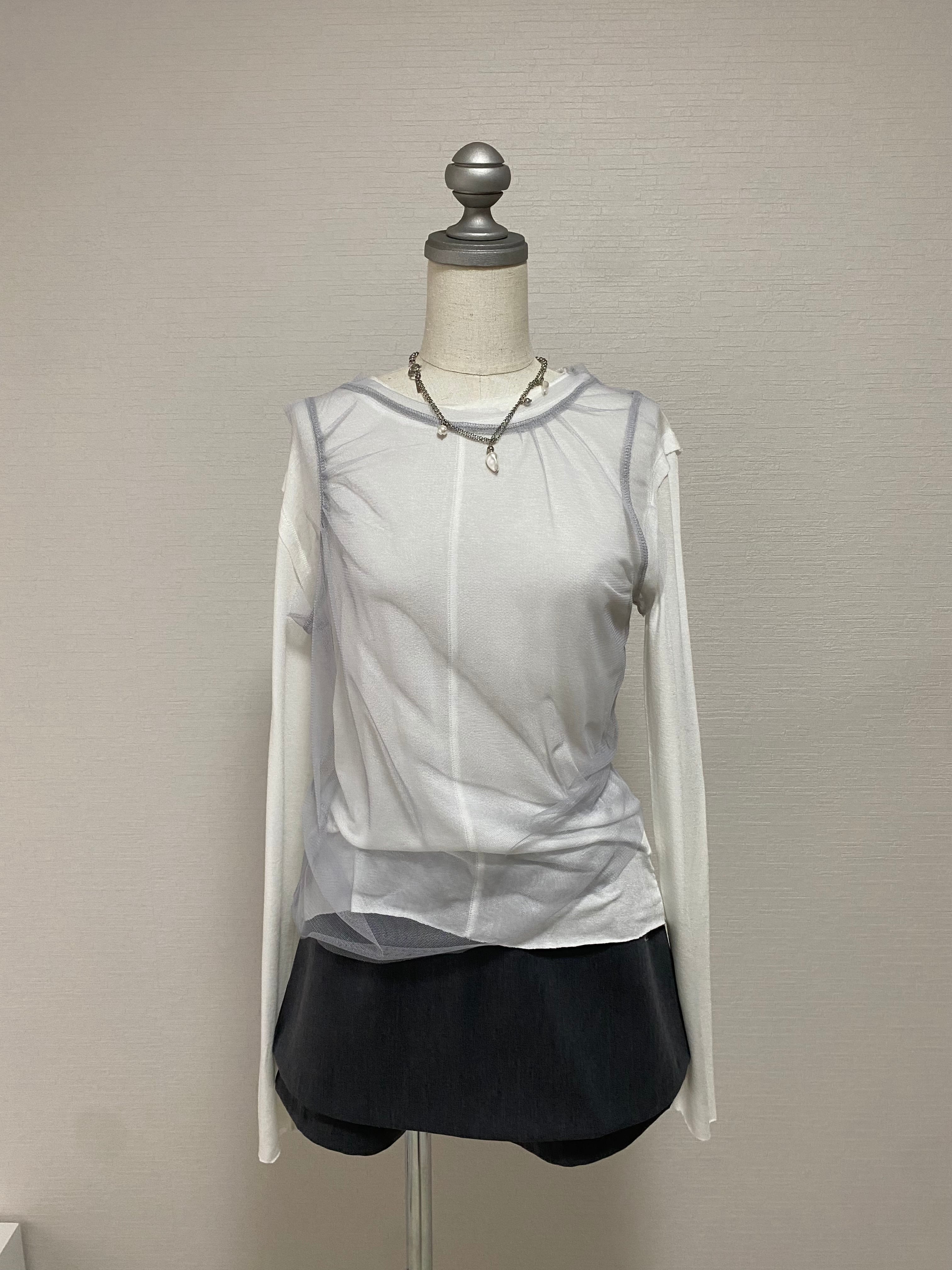 透け感のあるチュールトップスとカットソーが セットではなく一体になったデザインで、1枚でレイヤードスタイルが完成するアイテムです。