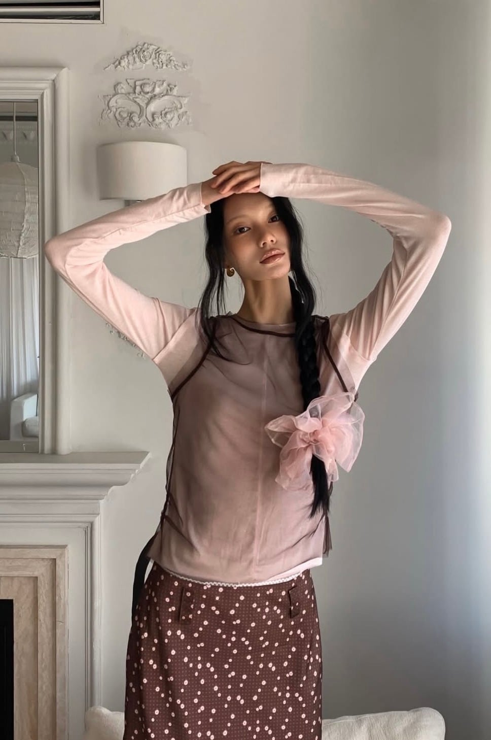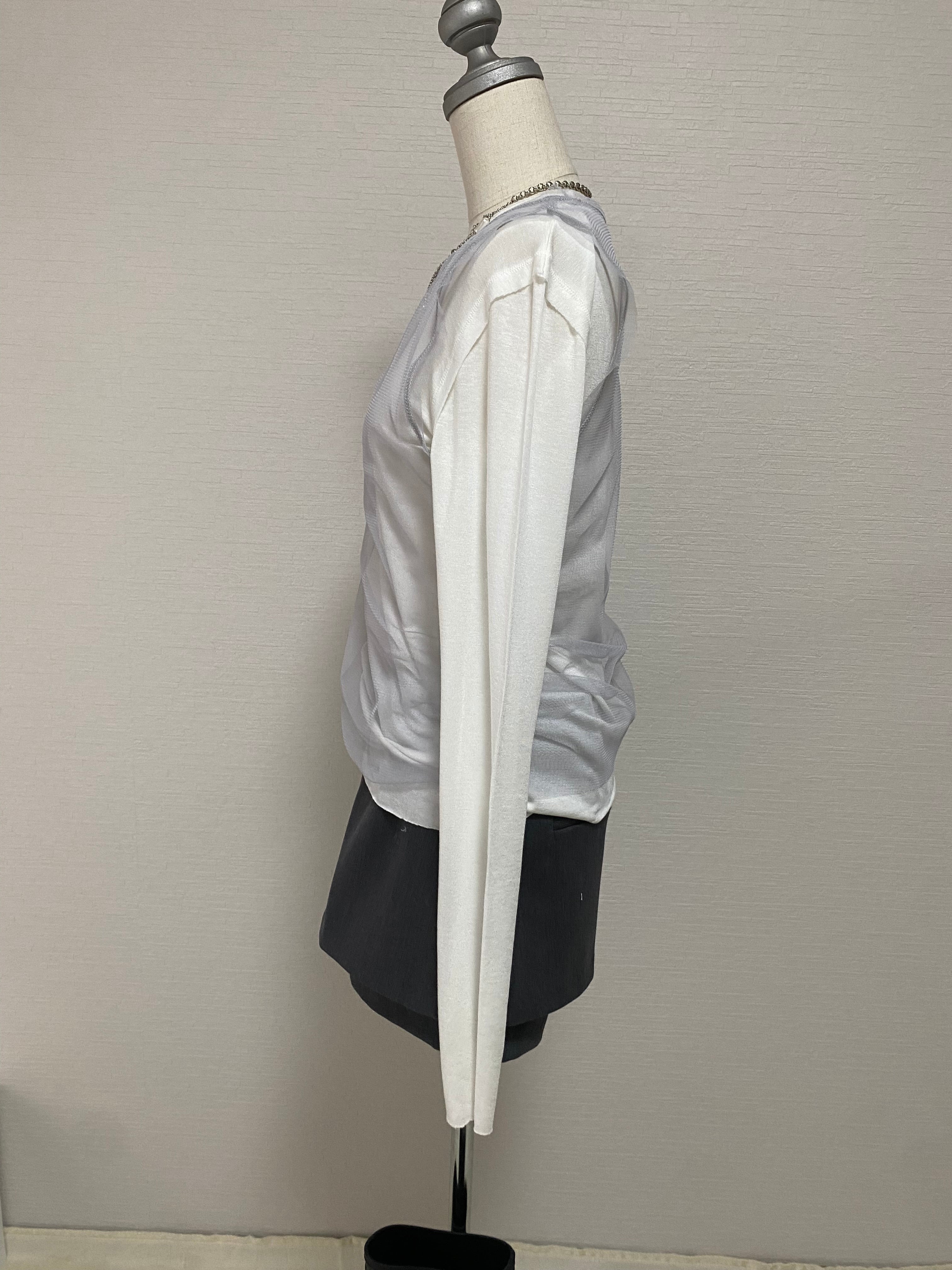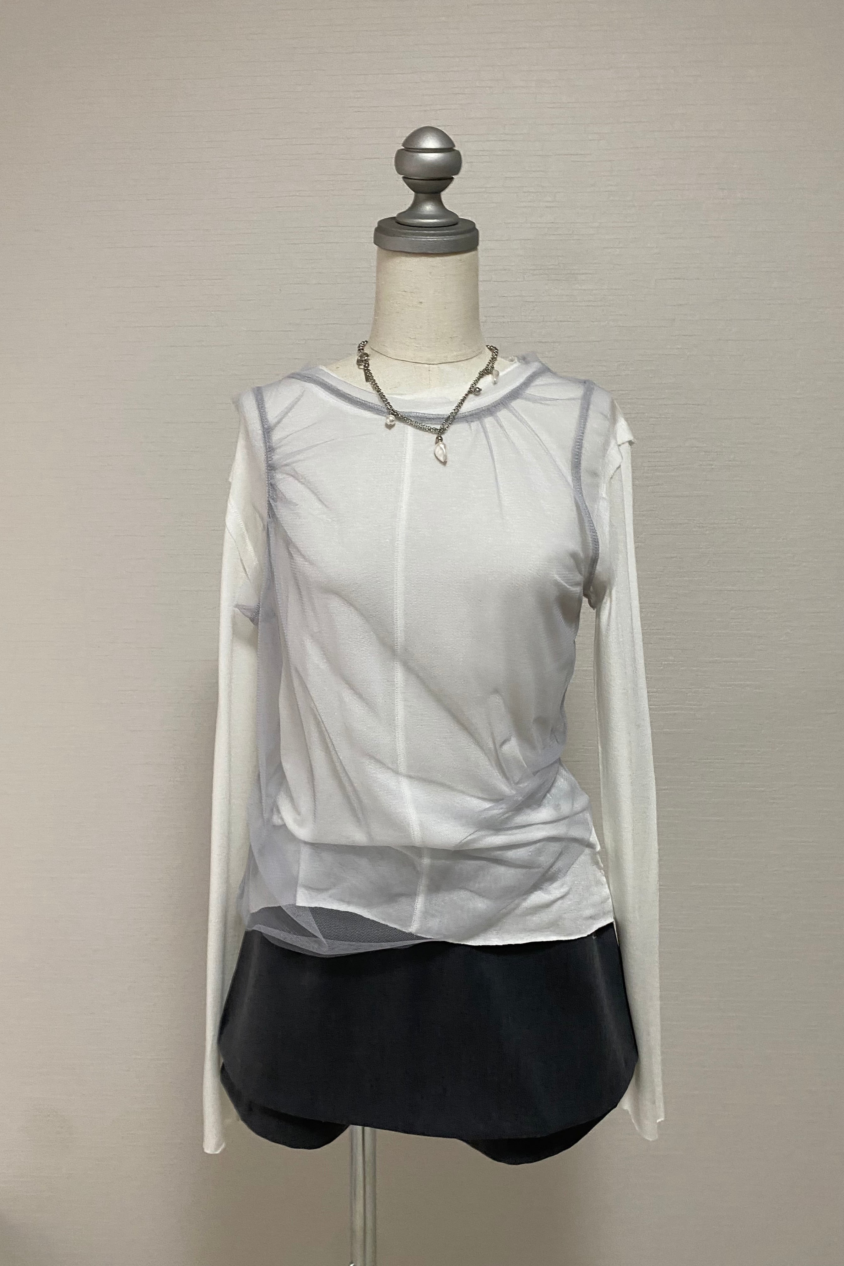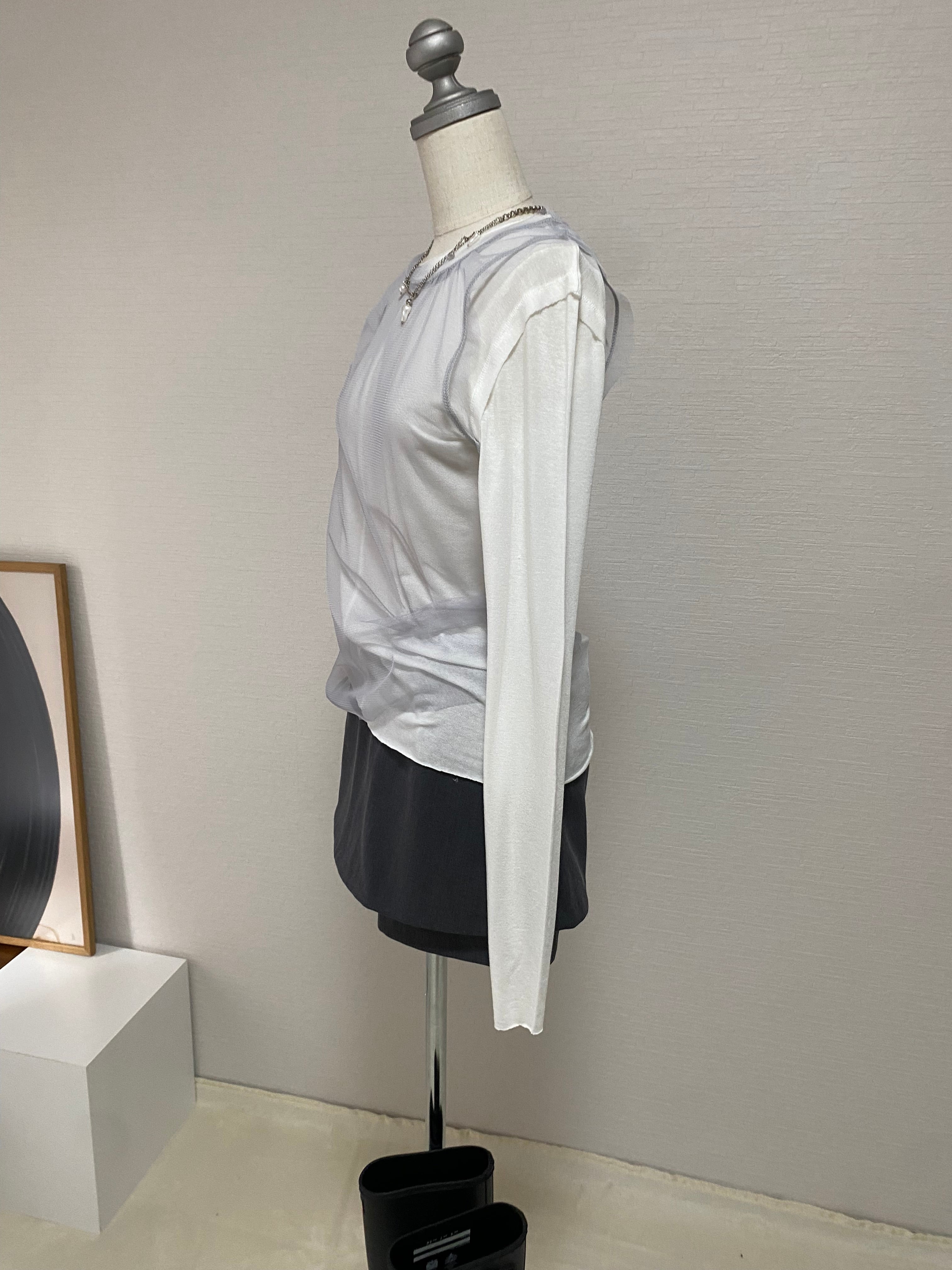 チュール素材をドッキングしたレイヤードデザイントップス。