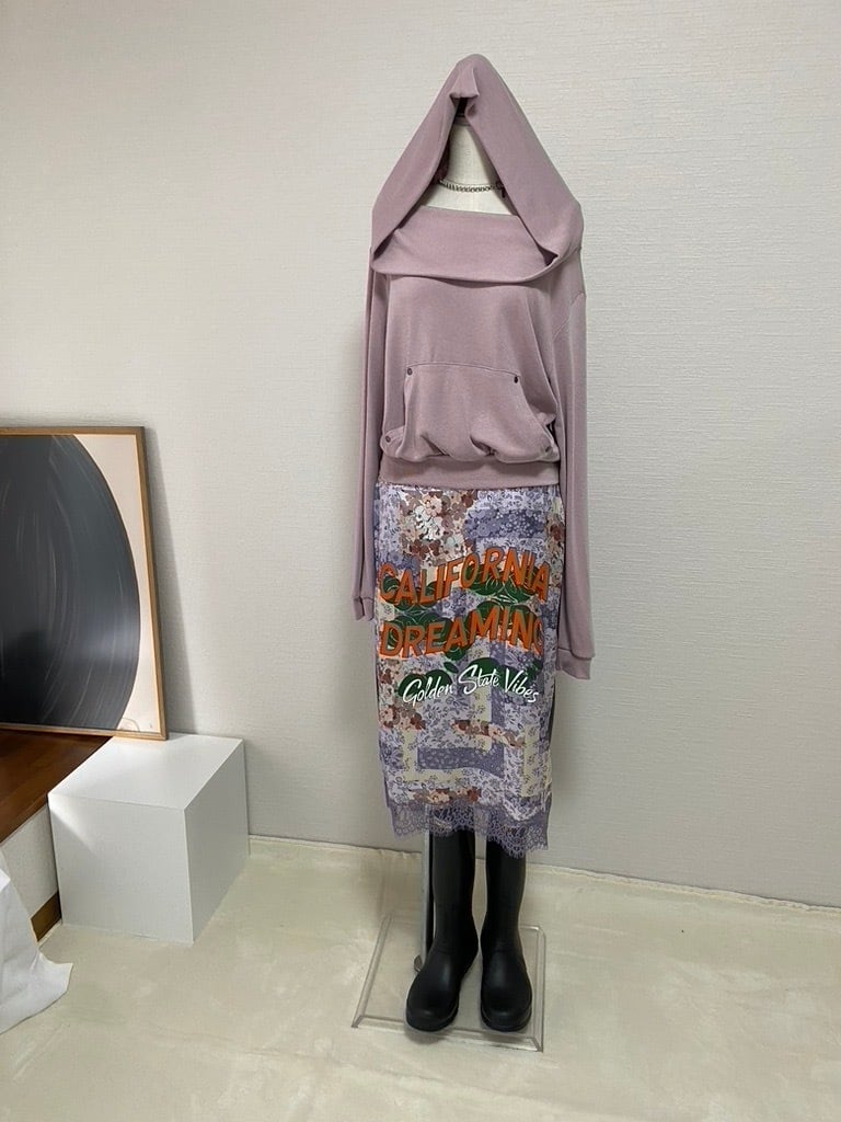 裾には繊細なレースをドッキングし、カジュアルなプリントデザインにさりげない女性らしさをプラス。