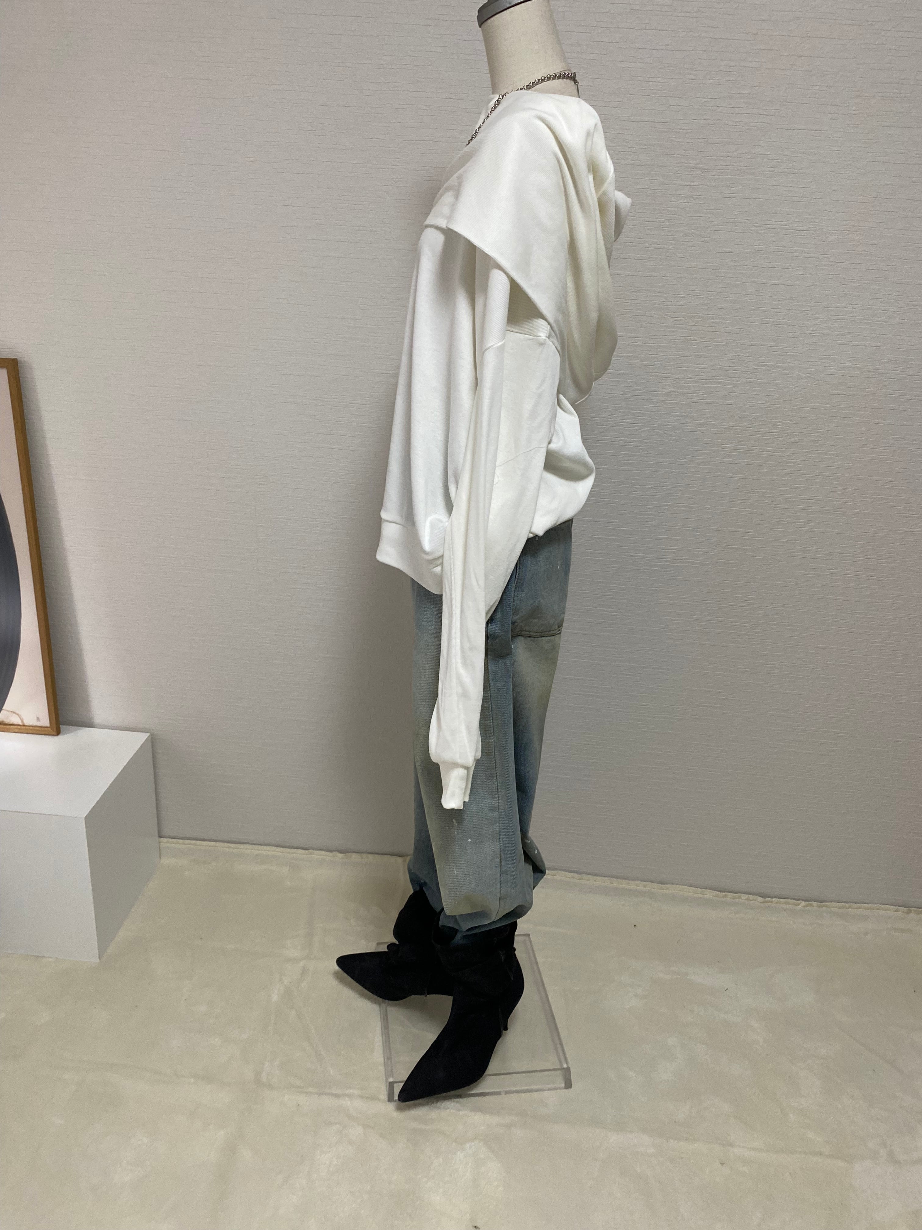 薄手のスウェット素材なのでロングシーズン着用しやすく、デニムやワイドパンツとのスタイリングにも相性の良いアイテムです。