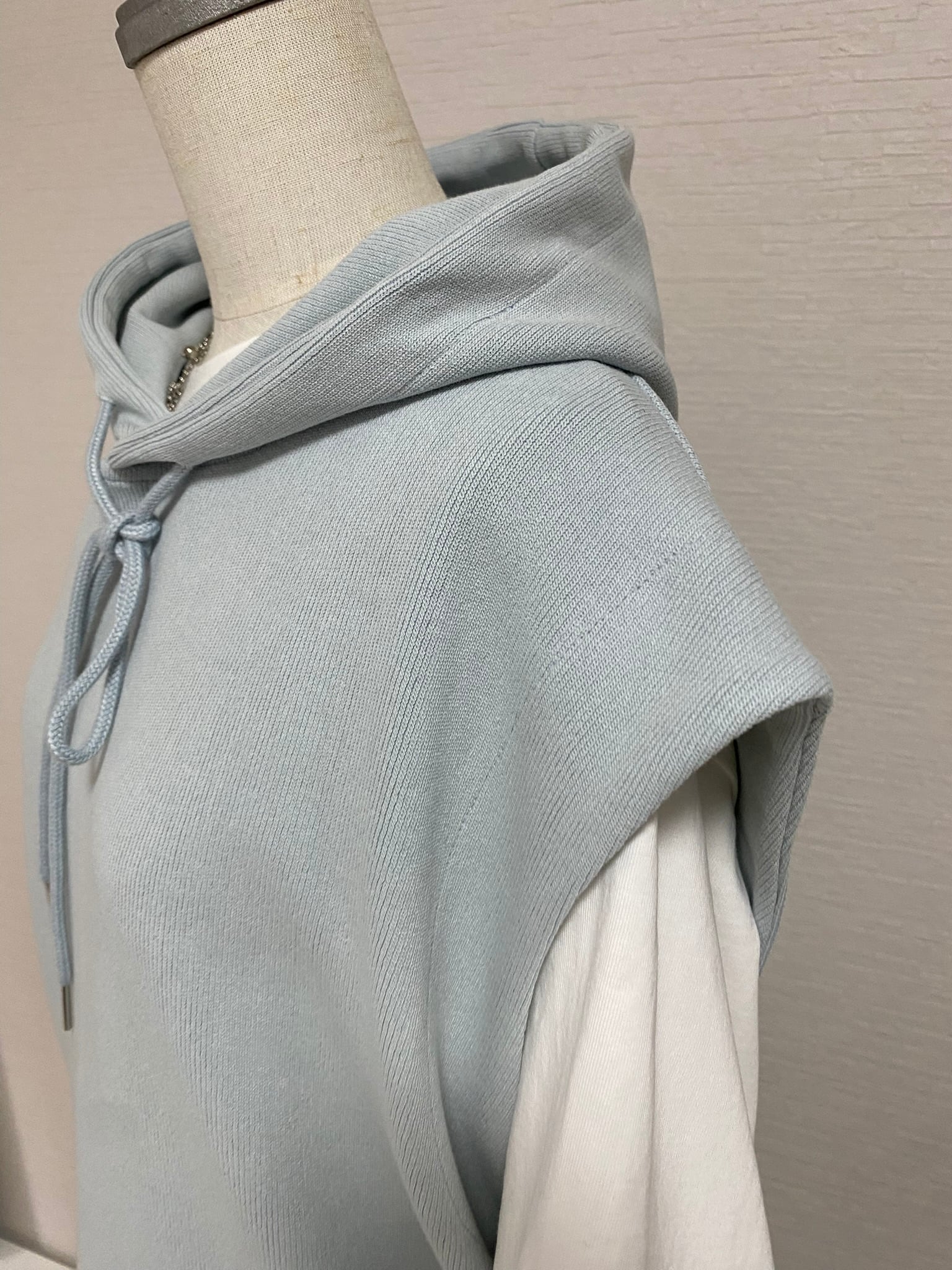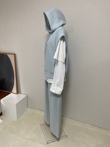 フード付きのベストはゆとりのあるシルエットで、レイヤードスタイルにも合わせやすいデザイン。