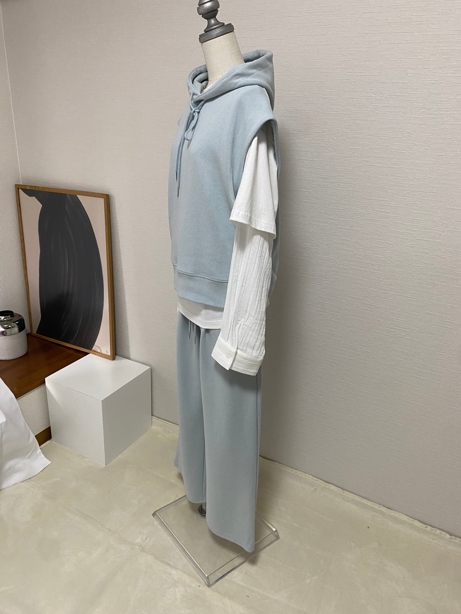 スウェットベストとパンツがセットになったカジュアルセットアップ。