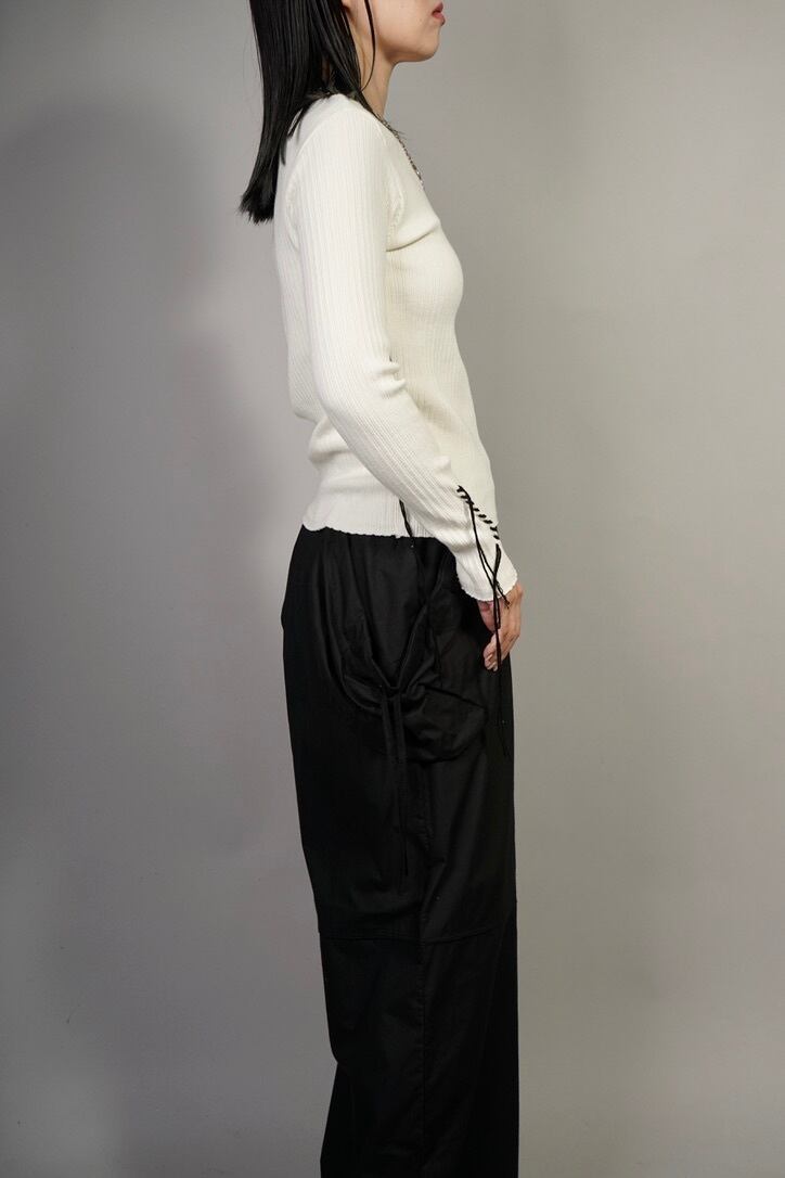 柔らかさを持ったストレッチ性の綿リブニット素材を使用した、レースアップトップス。