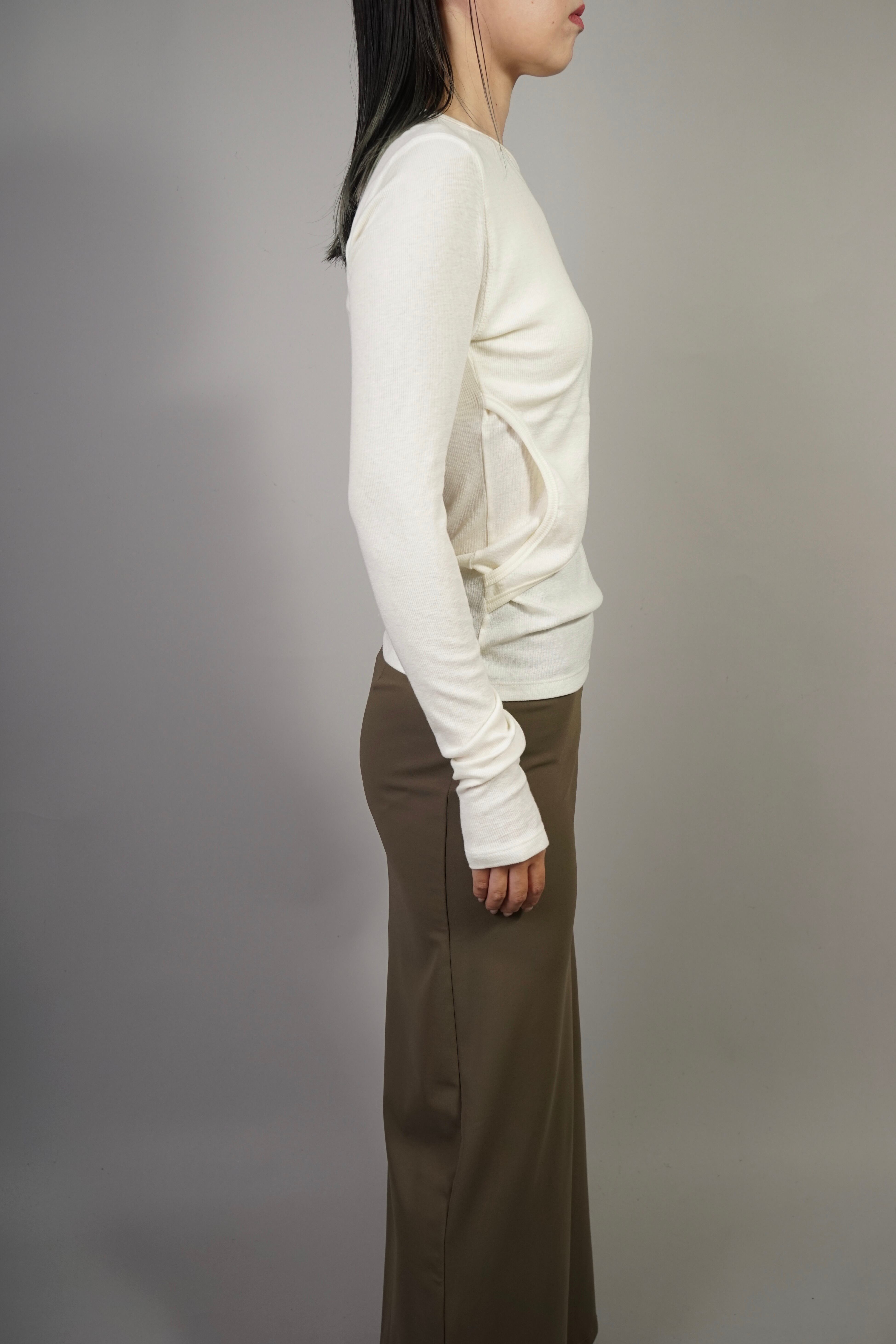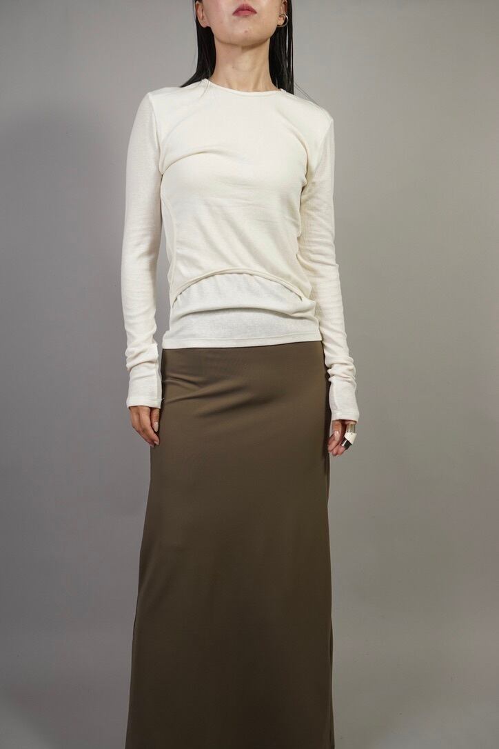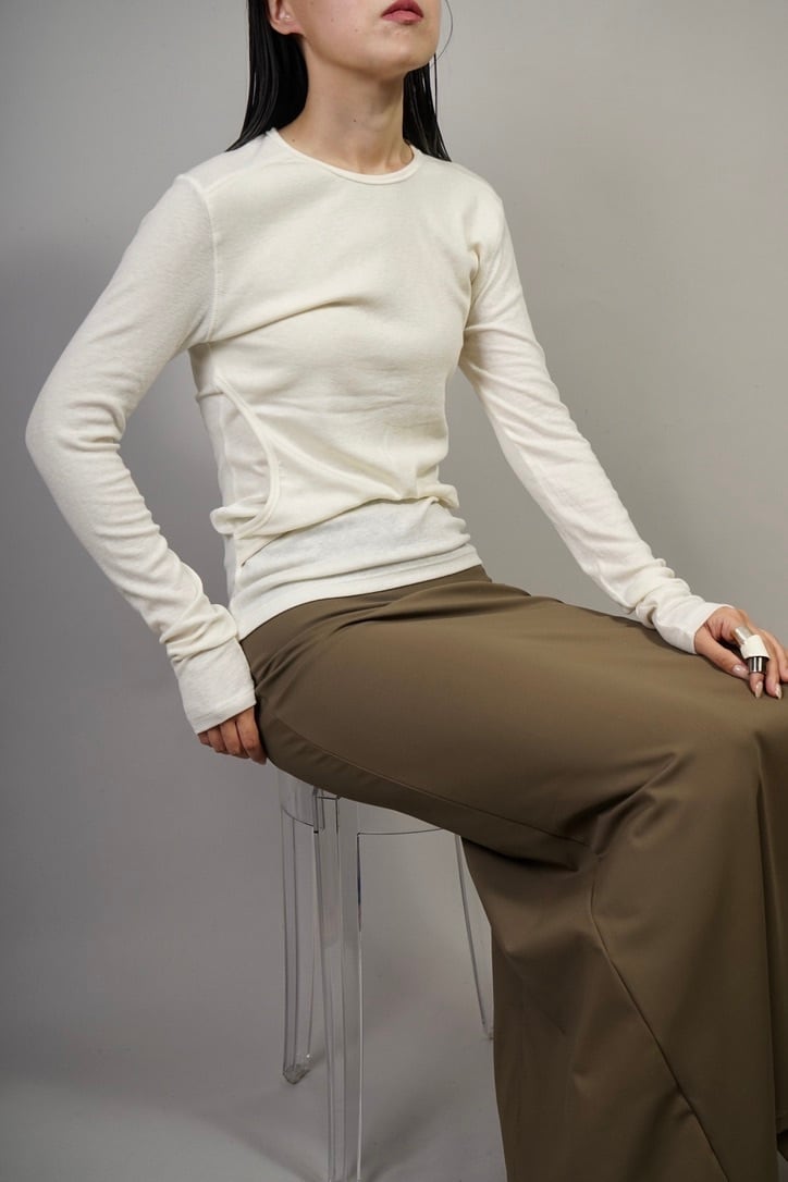 シンプルなセミフィットシルエットが幅広いスタイリングに使えるロングスリーブトップスに、半円状のアシンメトリーカットを用いた前身頃を重ねたレイヤードトップス。