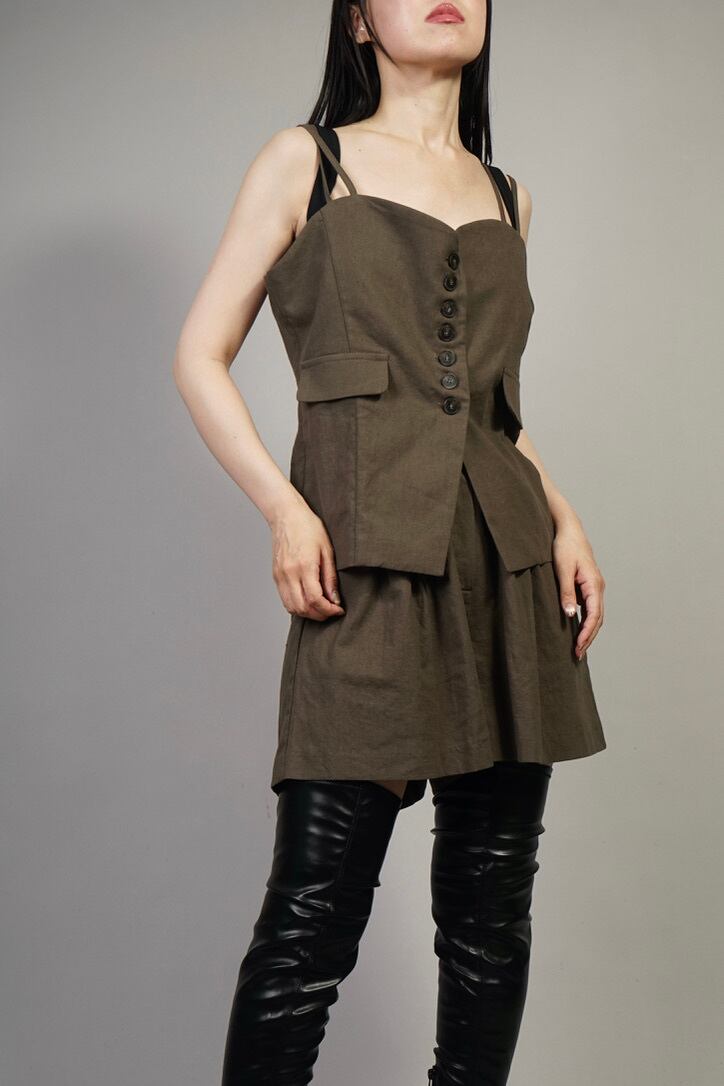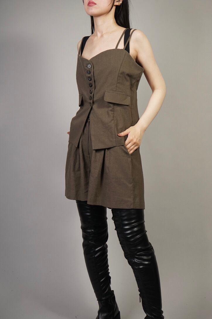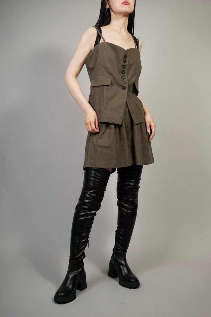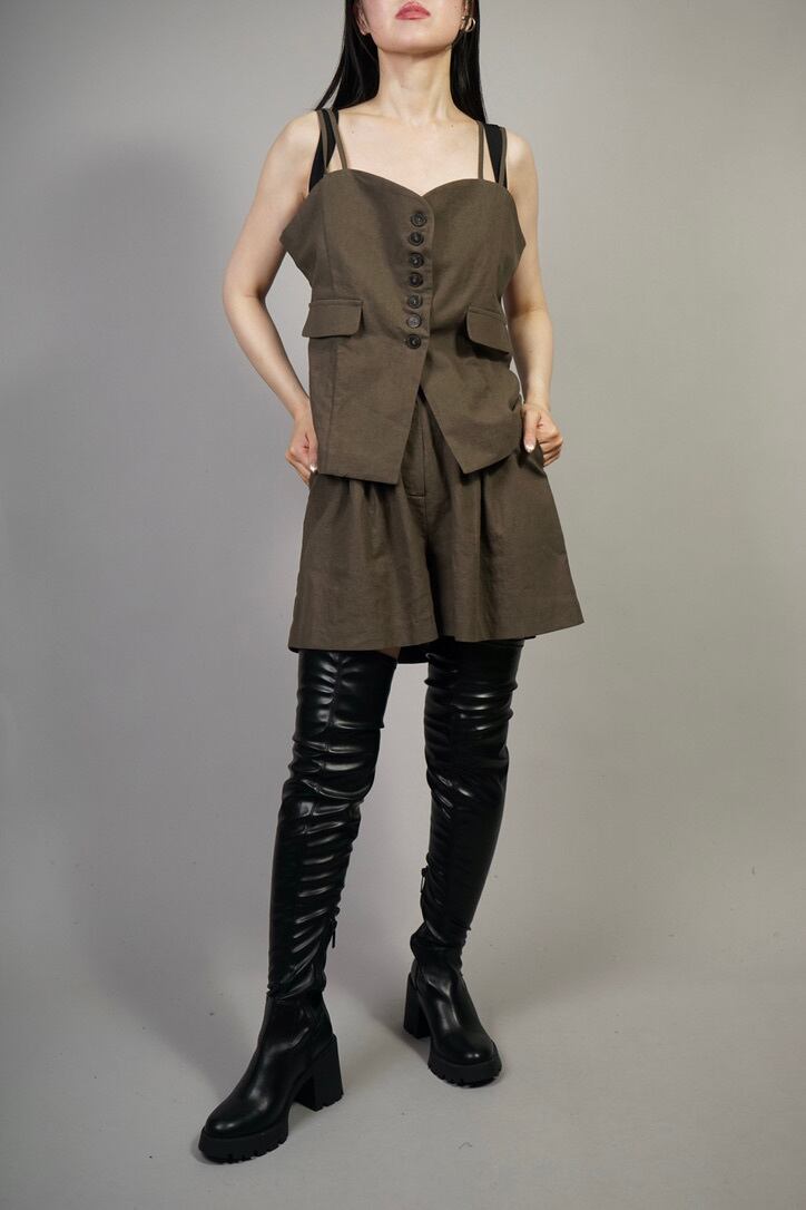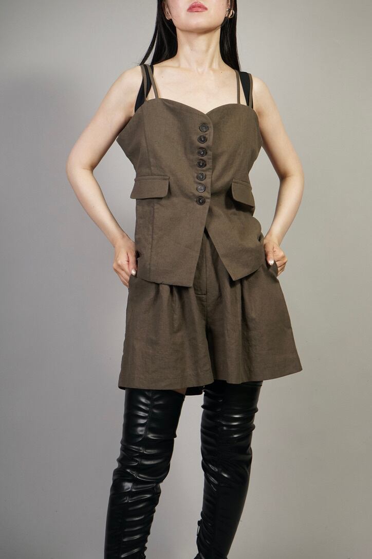 綿の柔らかさとリネンのサラリとした肌触りが程よくブレンドされたリネンミックス素材を使用した、コルセットトップスとショートパンツのセットアップ。