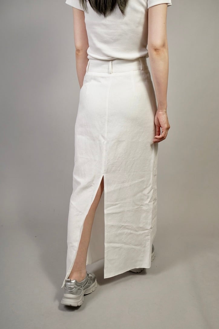 軽やかな風合いのコットンツイル素材を使用したタイトシルエットのマキシスカート。