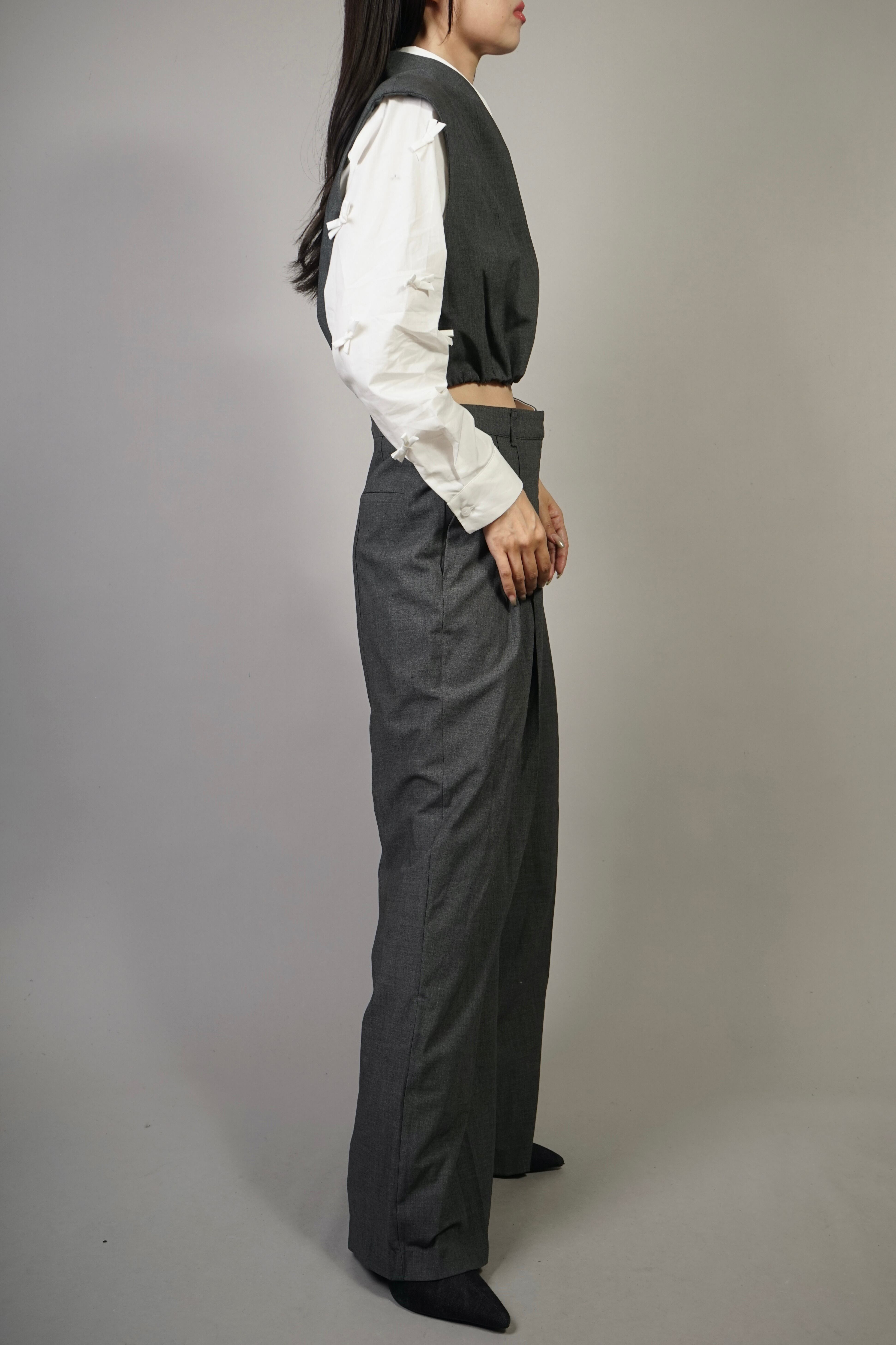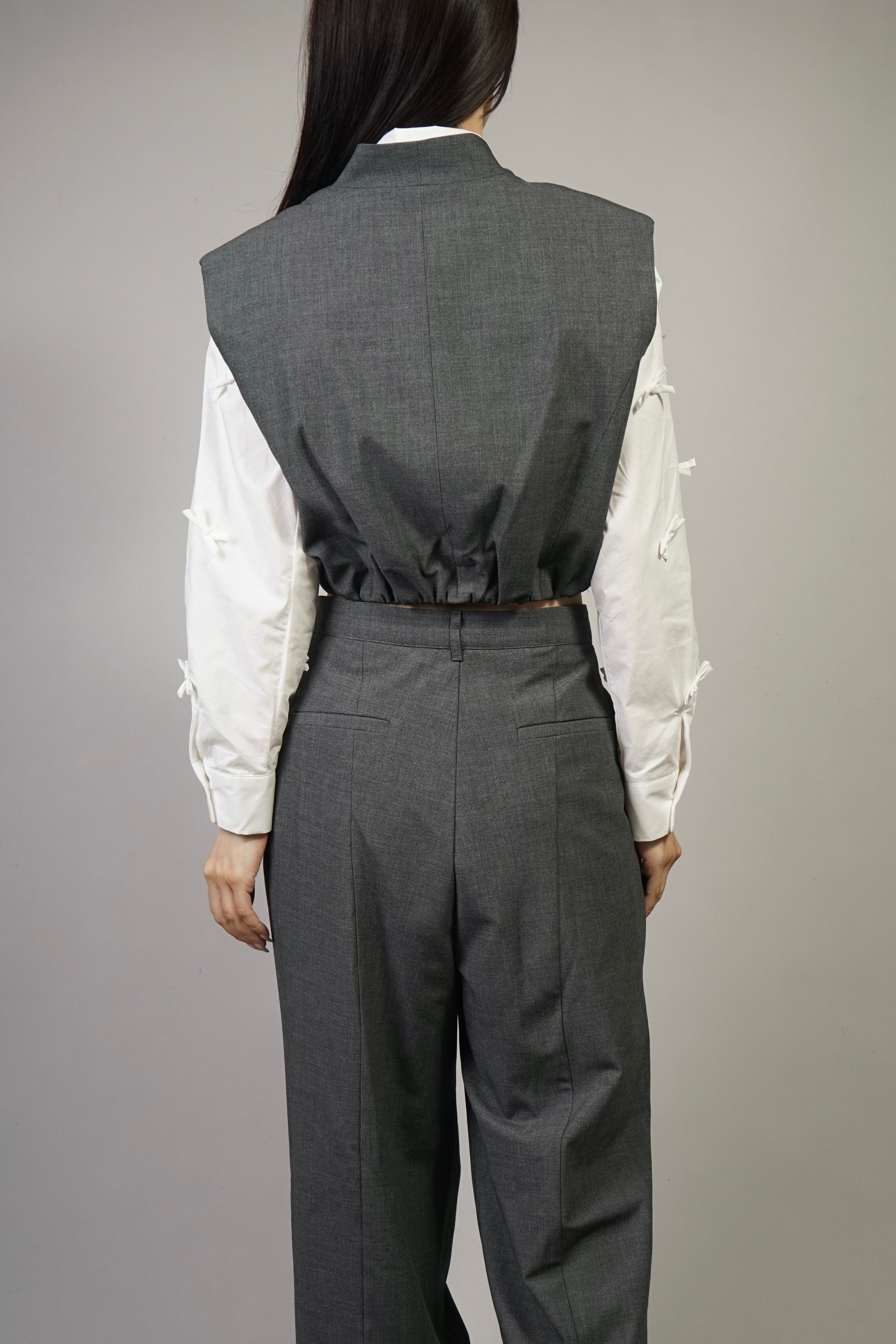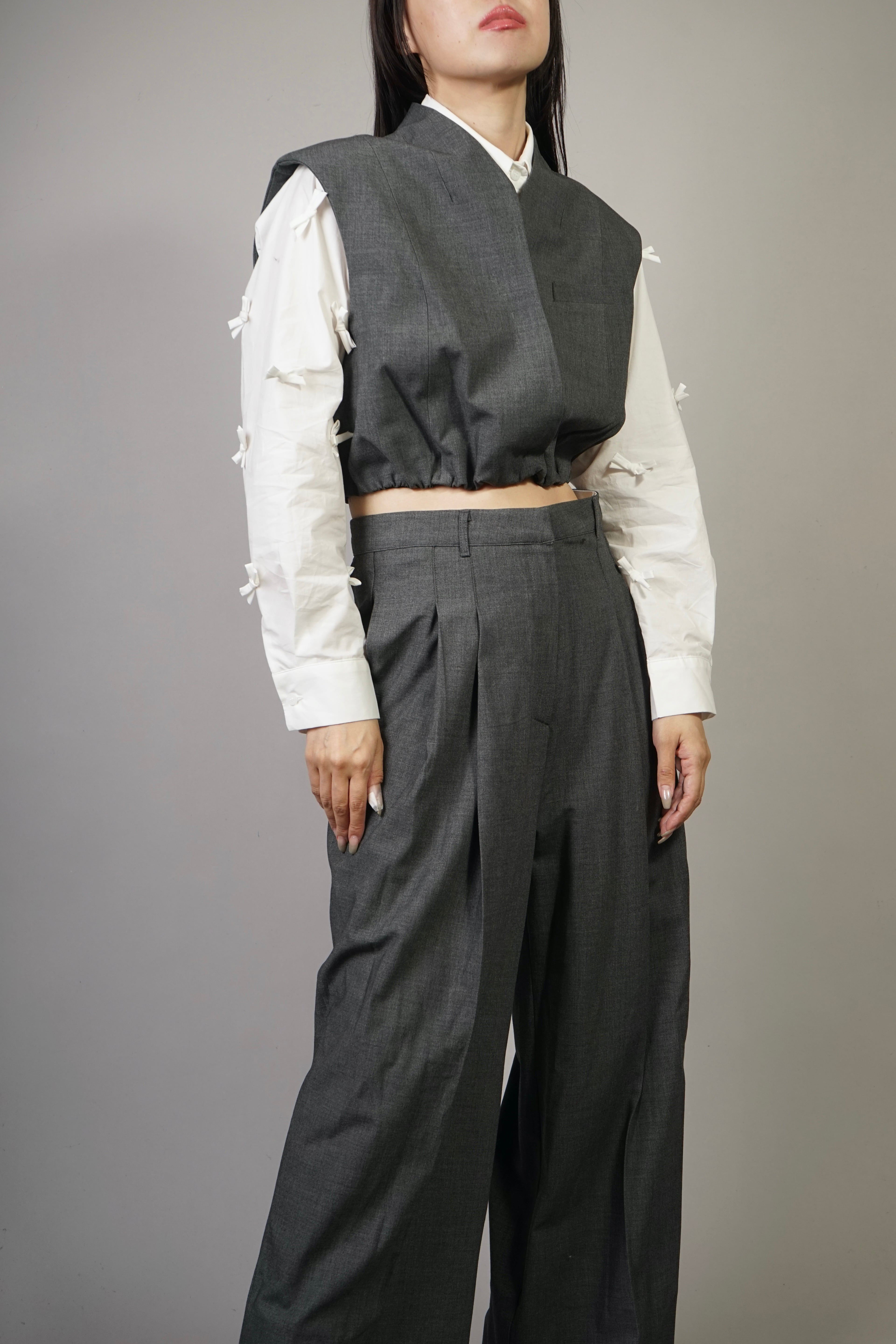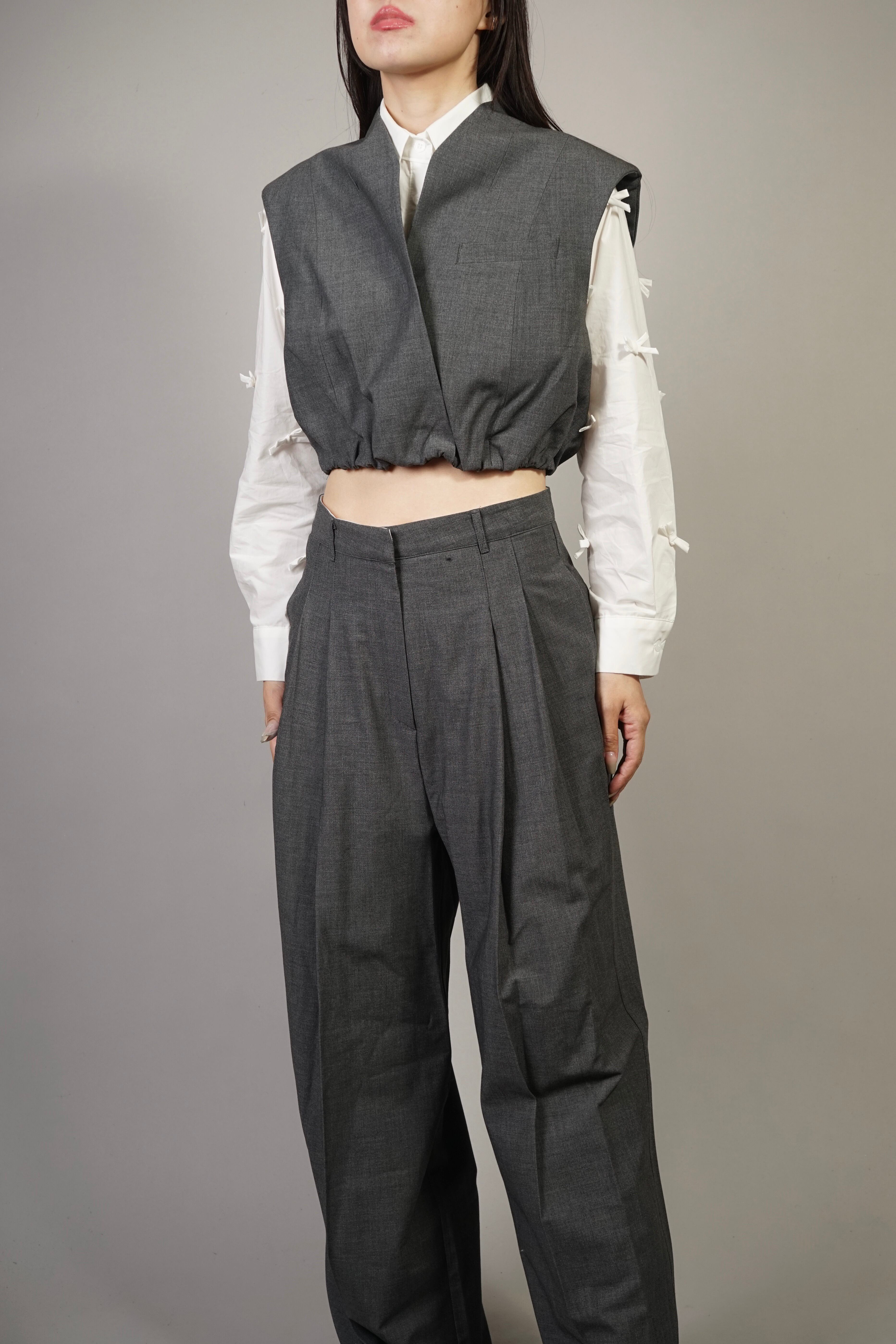 ヘムラインをゴムギャザーで仕立てた、クロップドベスト。