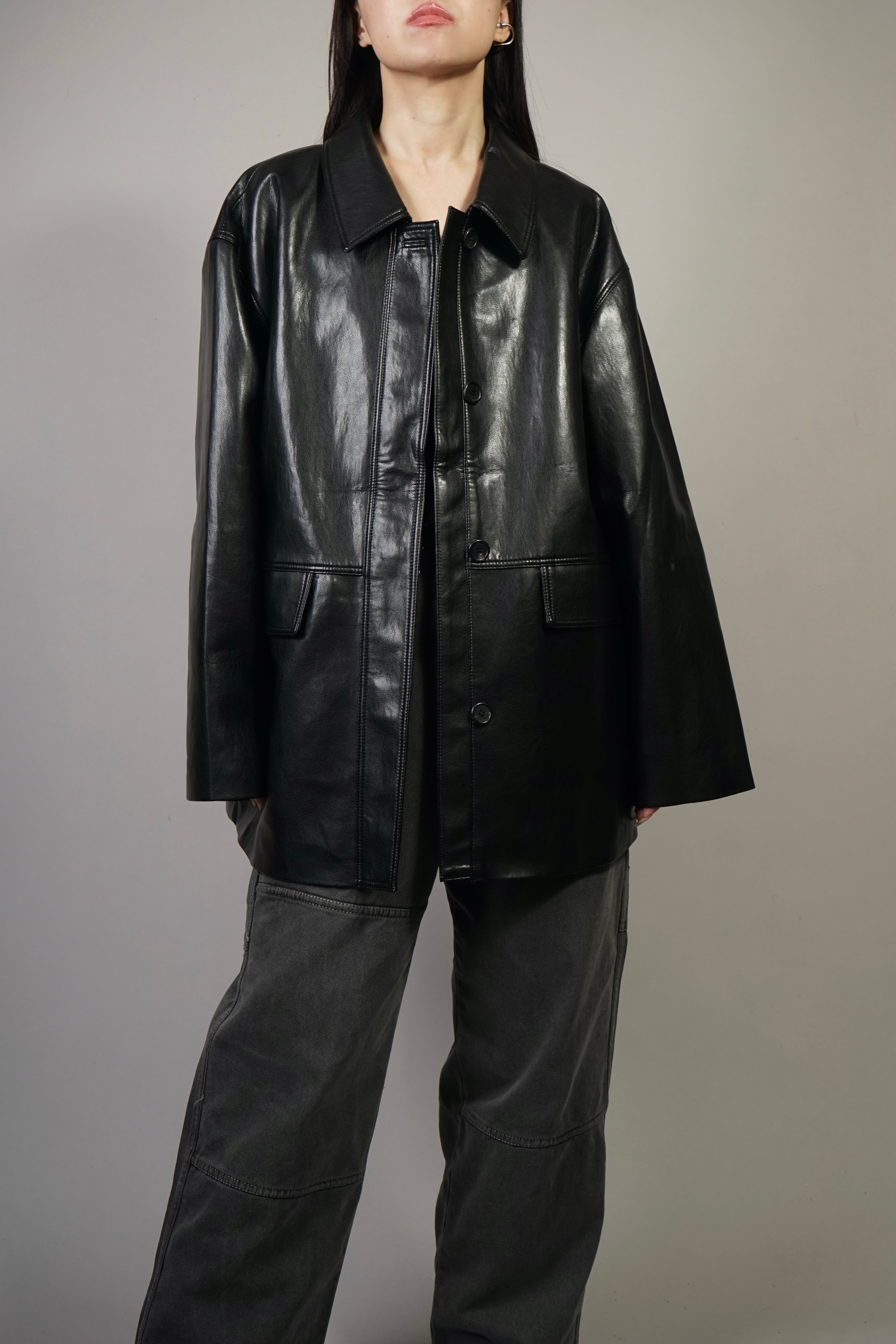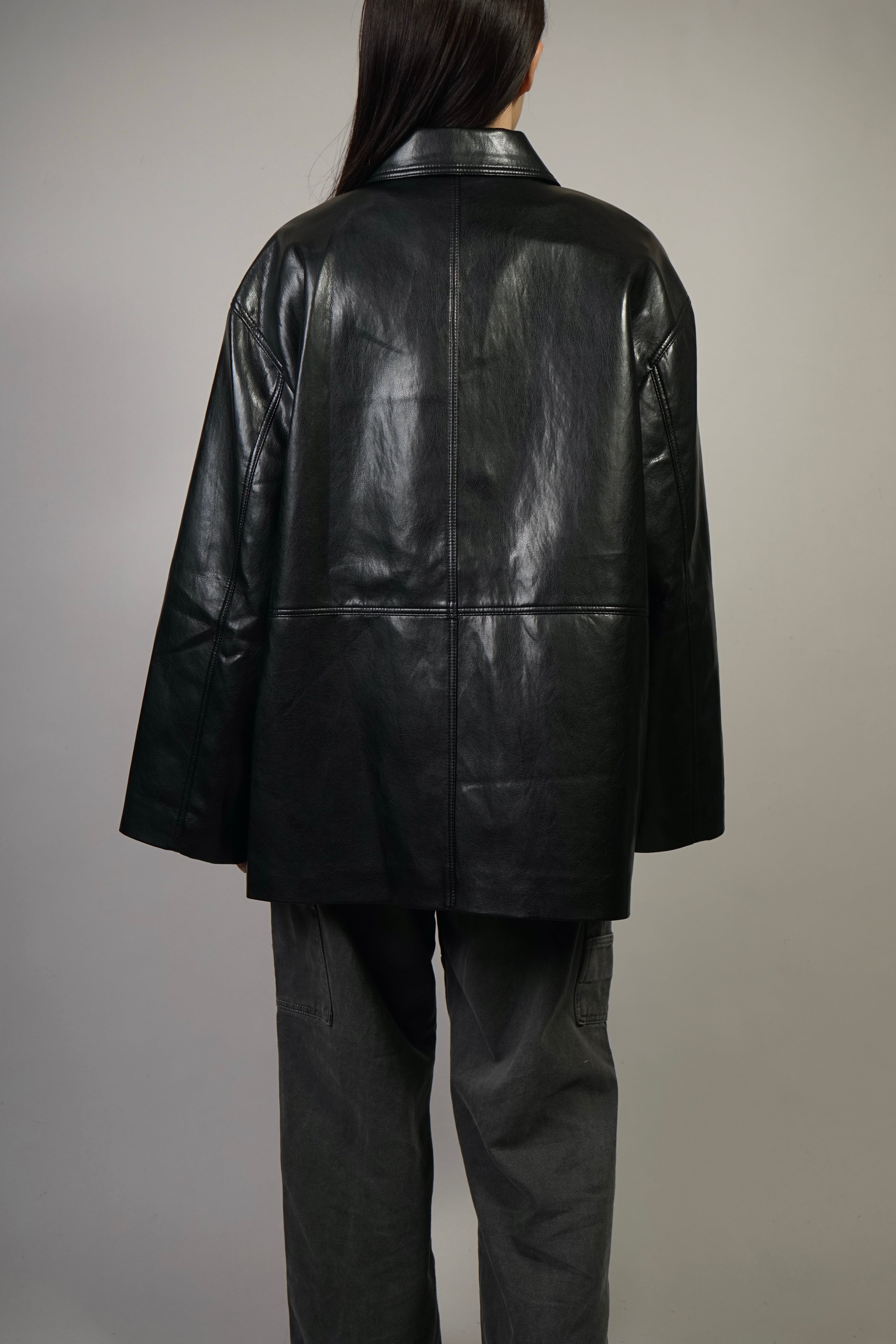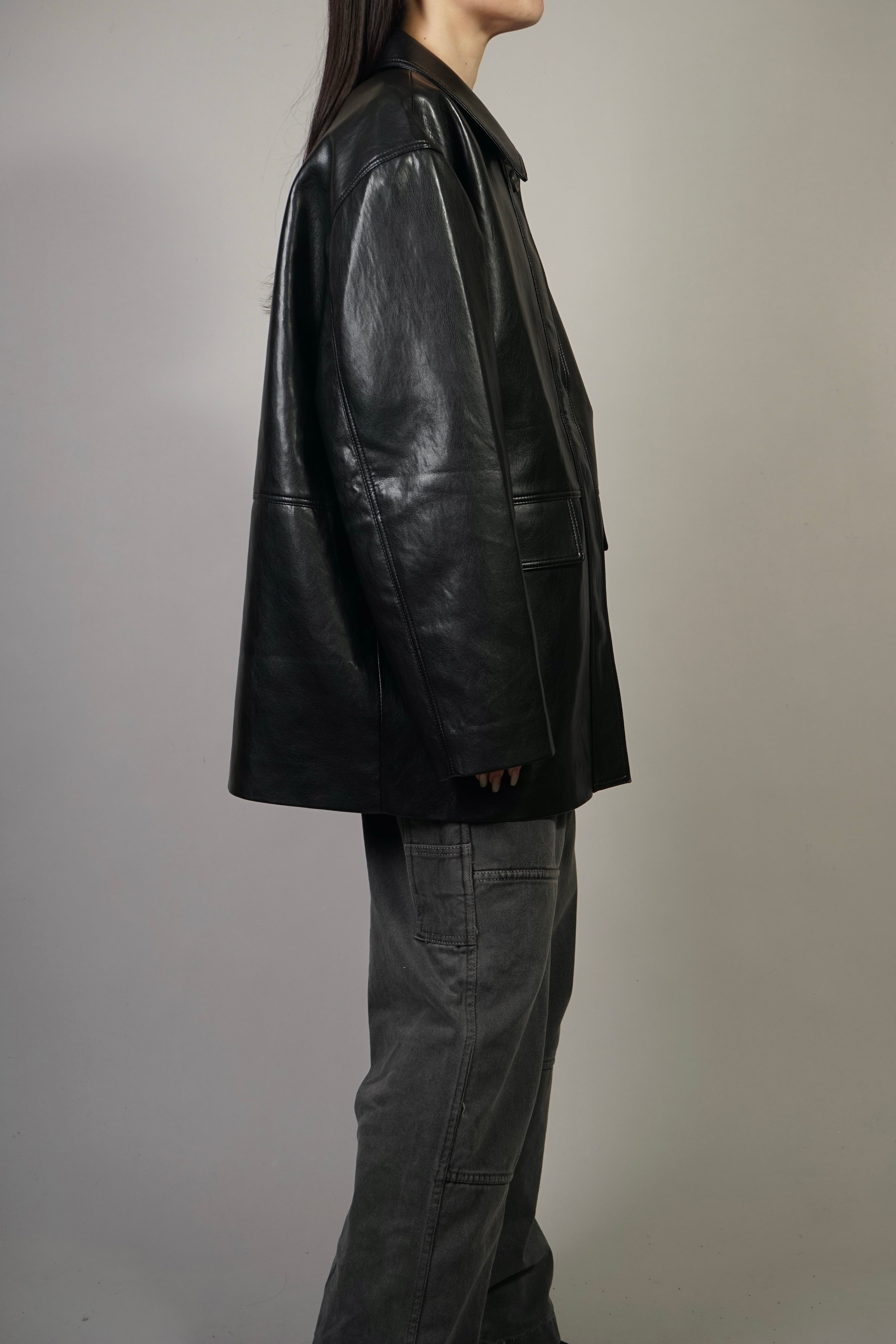リアルレザーの質感と艶感を備えた、しっかりとしたコシのあるフェイクレザー使用したレザージャケット。