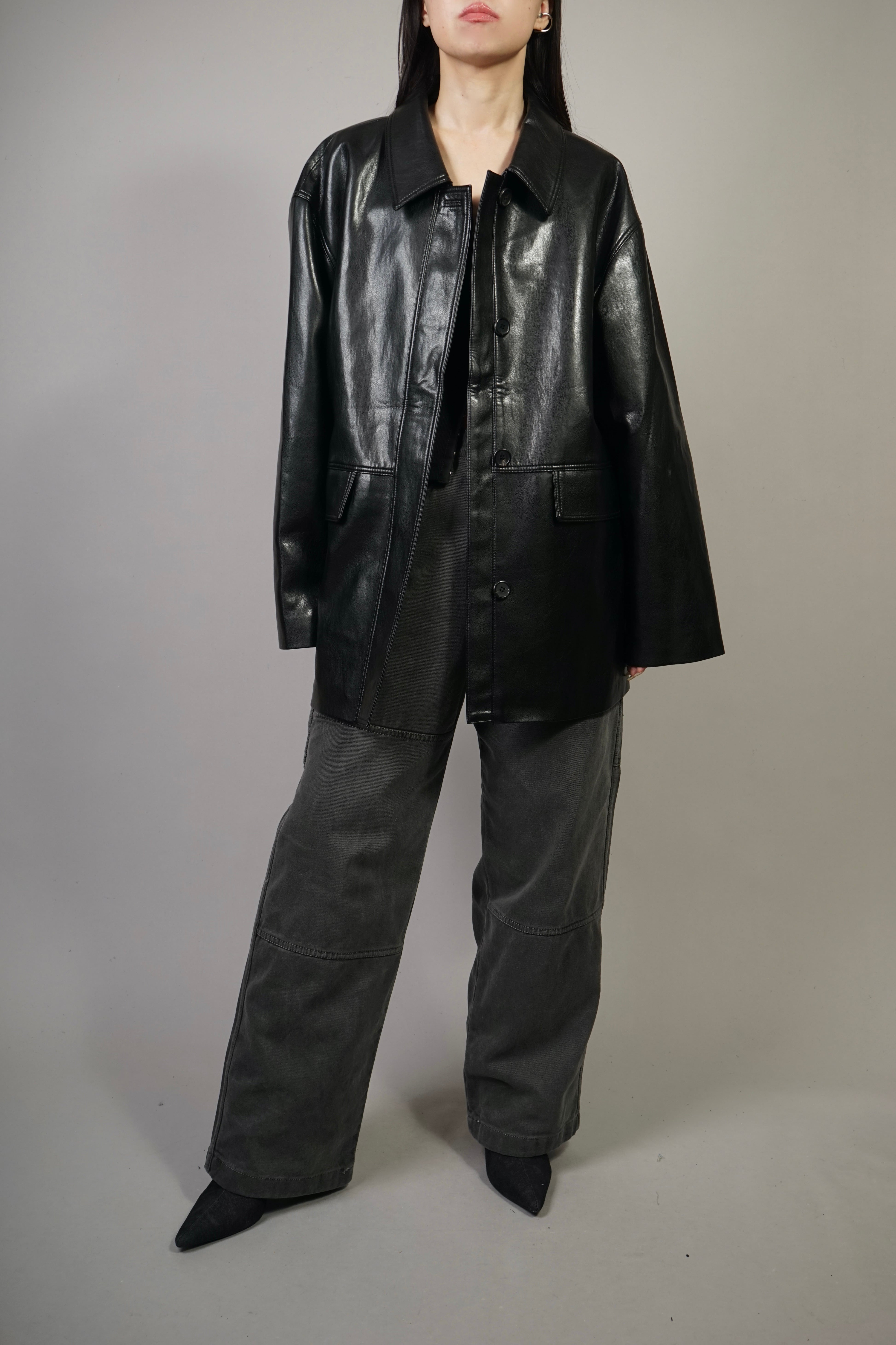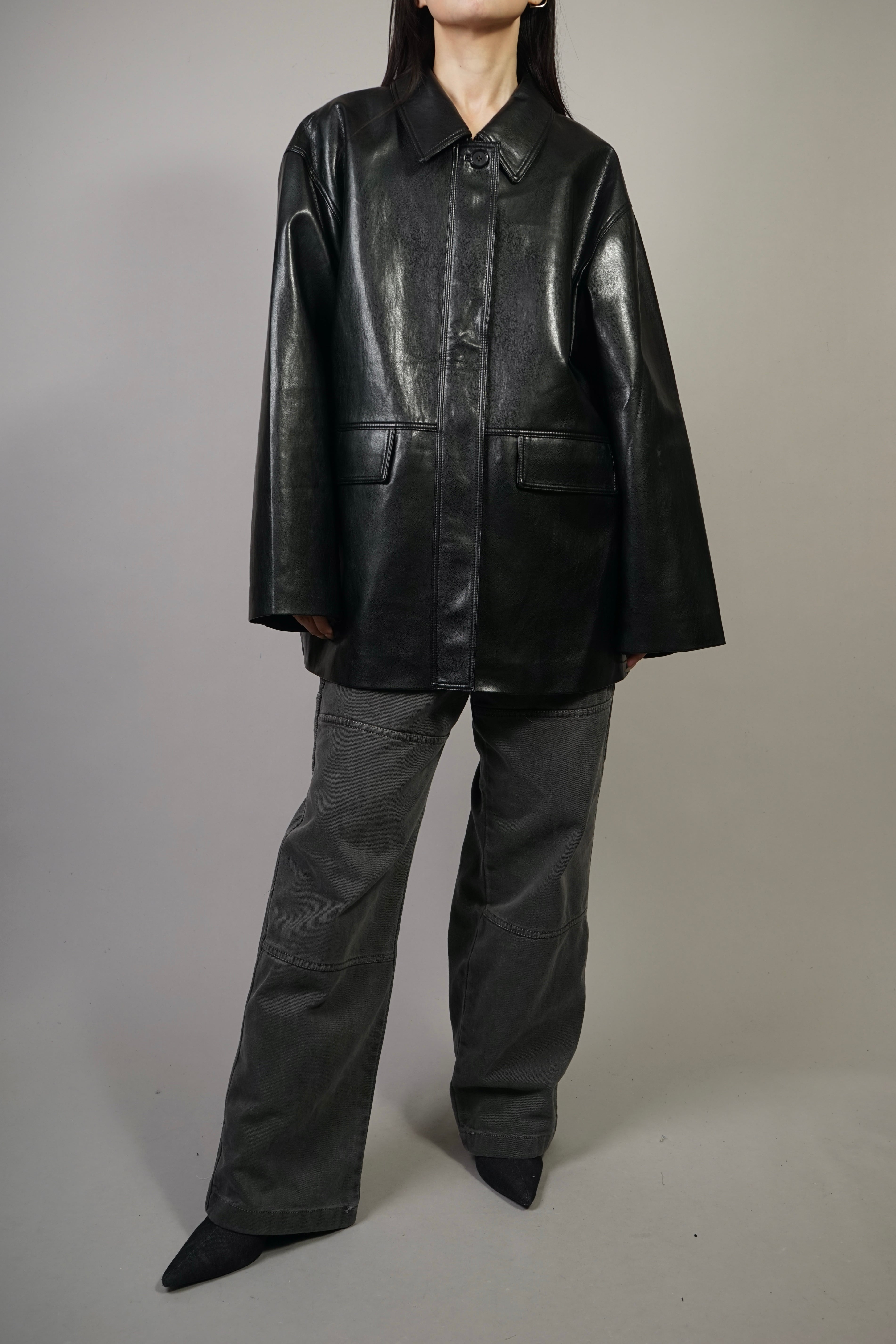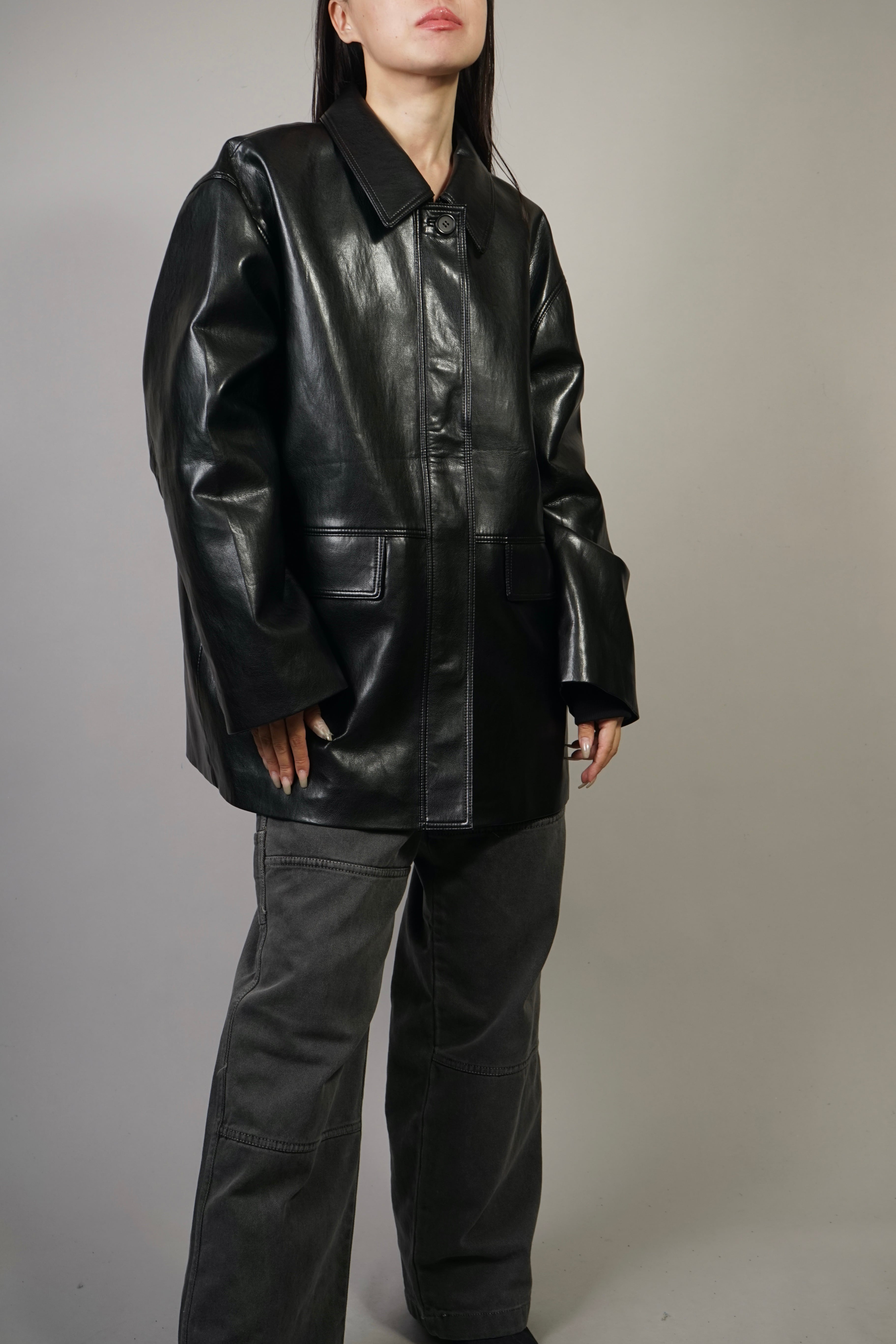 リアルレザーの質感と艶感を備えた、しっかりとしたコシのあるフェイクレザー使用したレザージャケット。